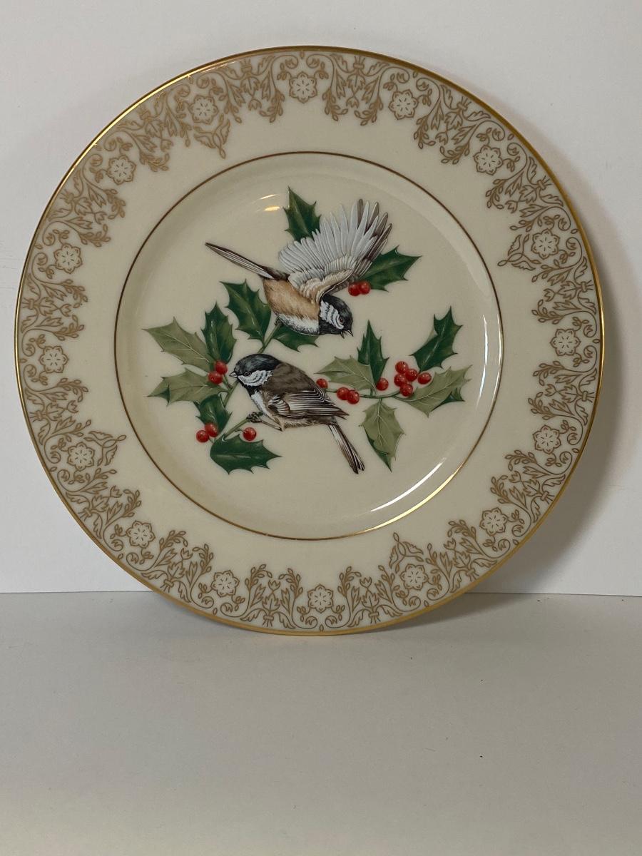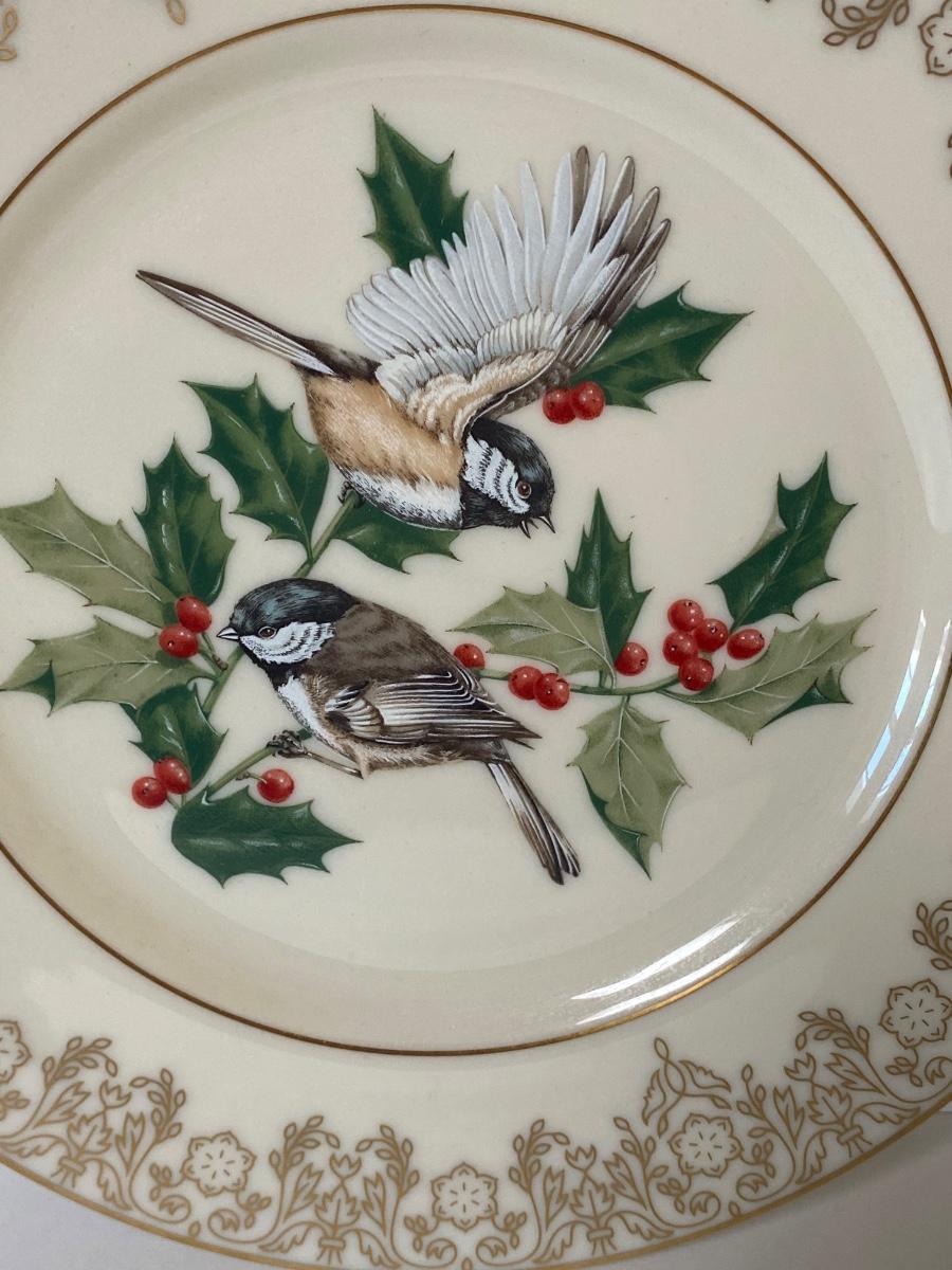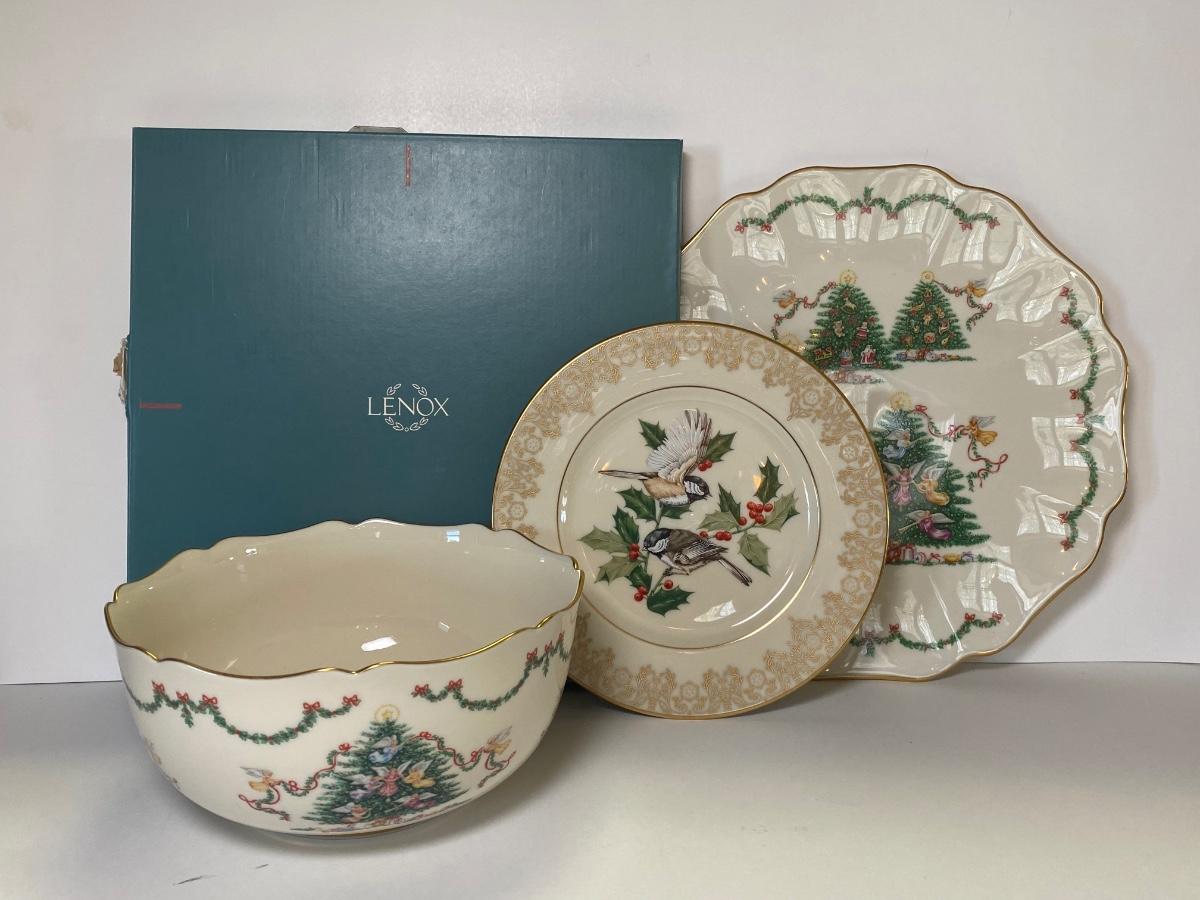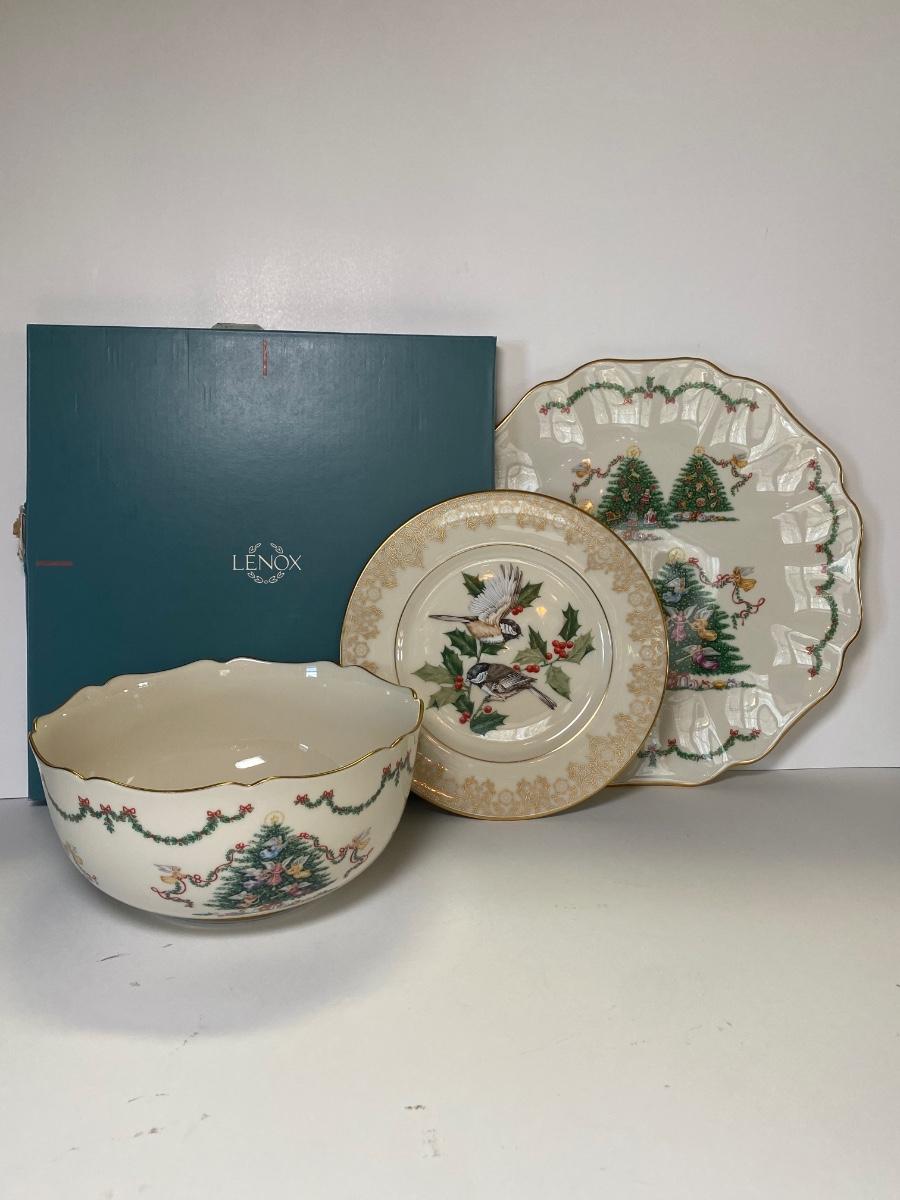 Lenox bowl and plate from "The Joys of Christmas," 1988 Chickadee plate from the Lenox Garden Bird Plate Collection. Chickadee plate includes Lenox box.