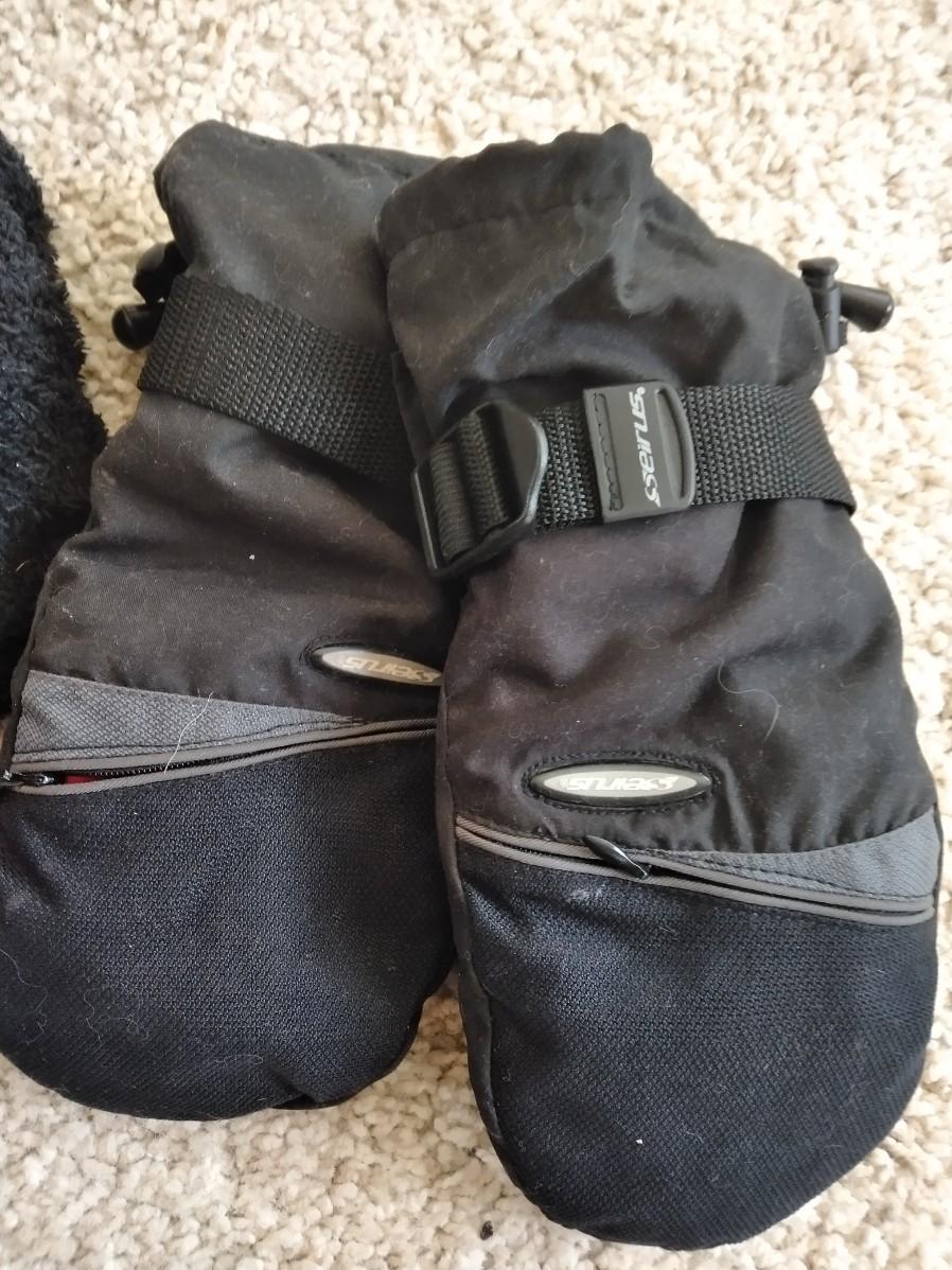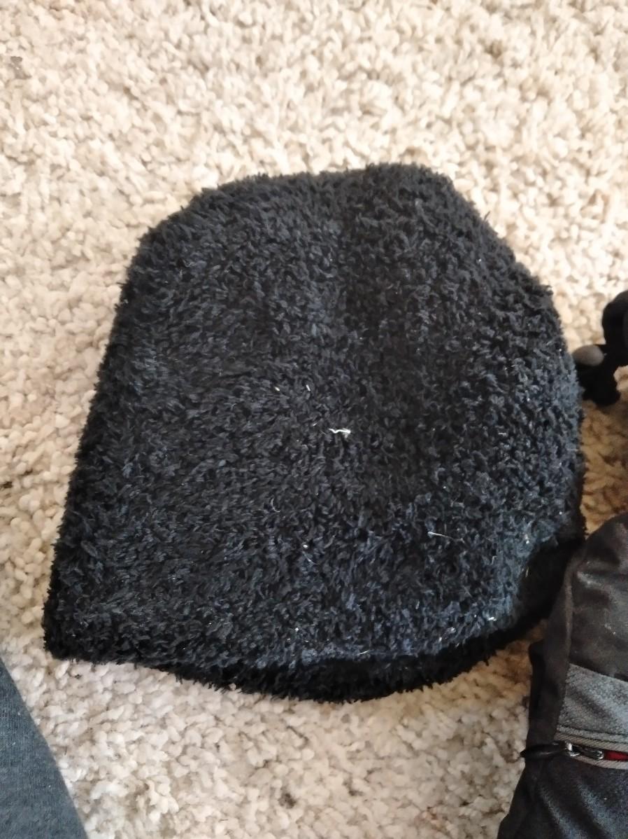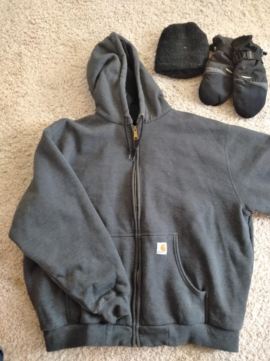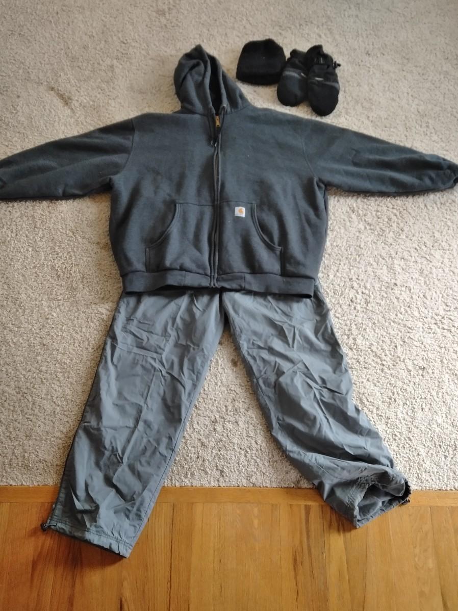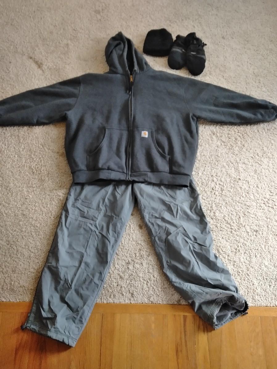 CARHARTT ZIP UP JACKET WITH HOOD, SIZE 2XL, OLD NAVY SIZE L PANTS, A PAIR OF SEIRUS GLOVES, AND A STOCKING CAP.