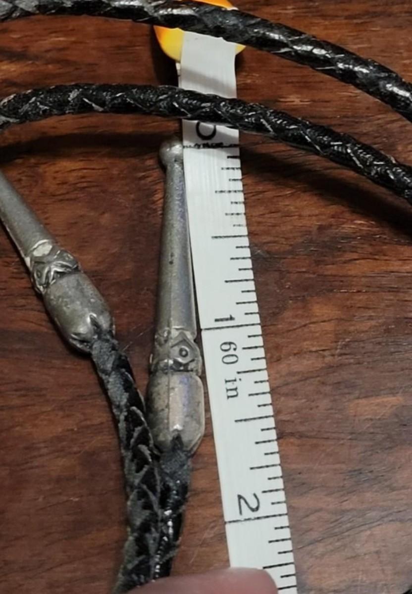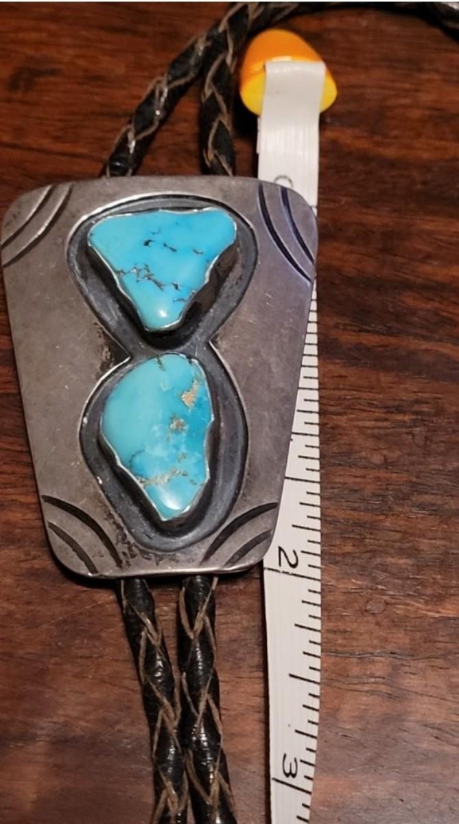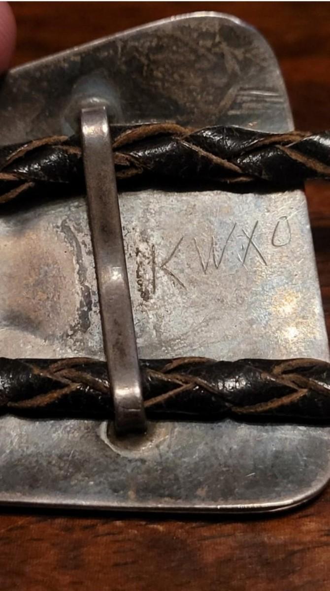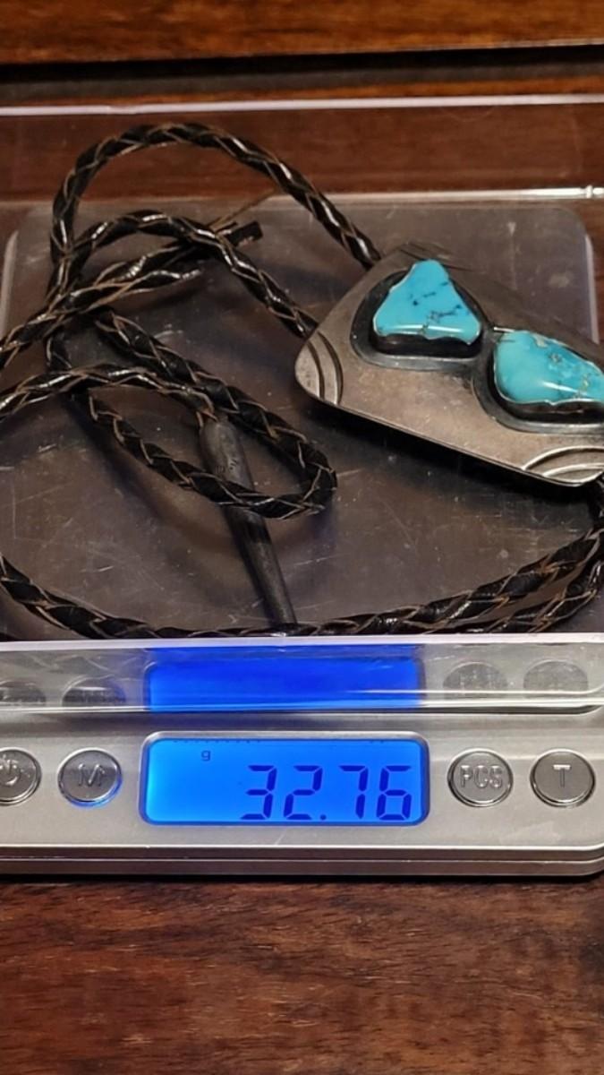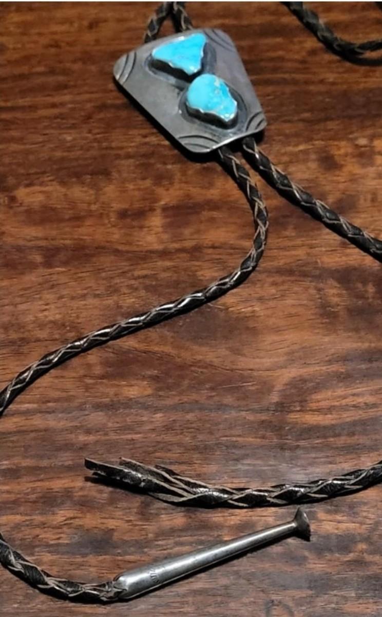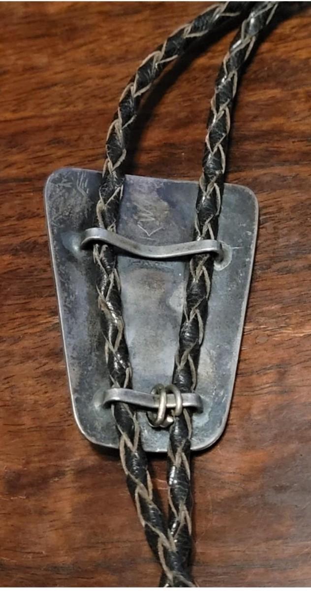 The leather string with the turquoise piece is missing one of the sterling tassel ends. Extra Bolo string included. Marked KWXO but not marked sterling.