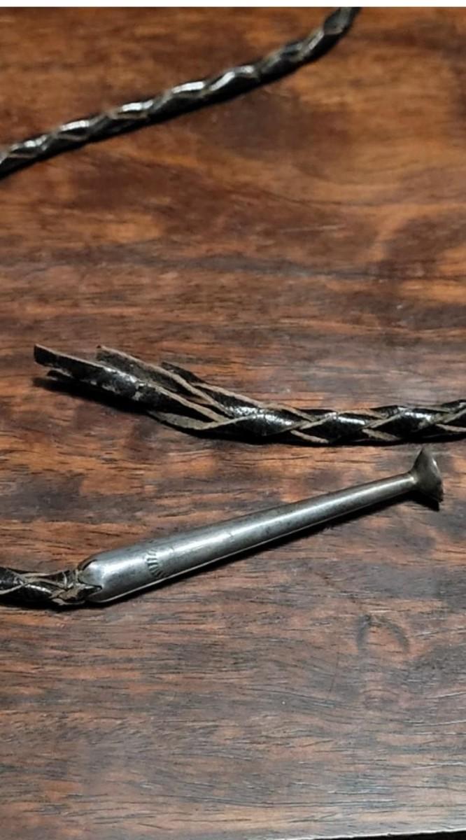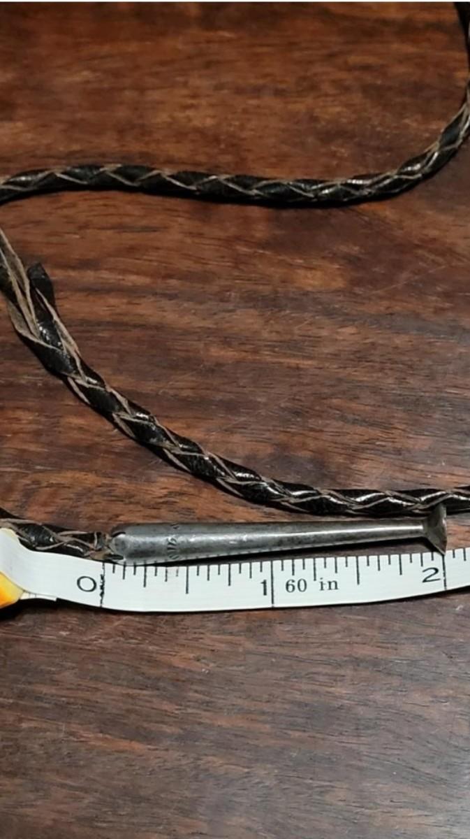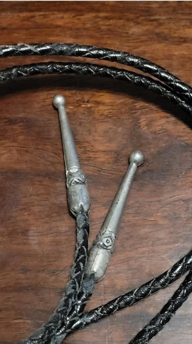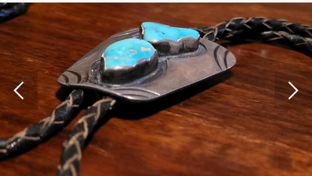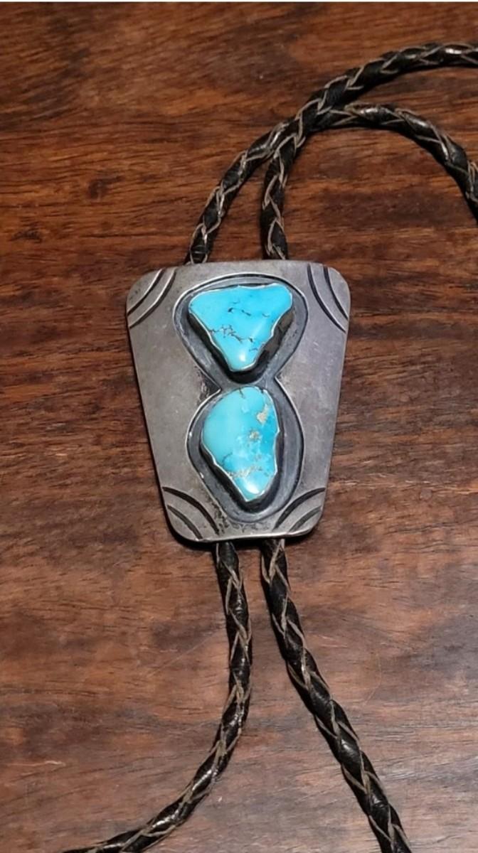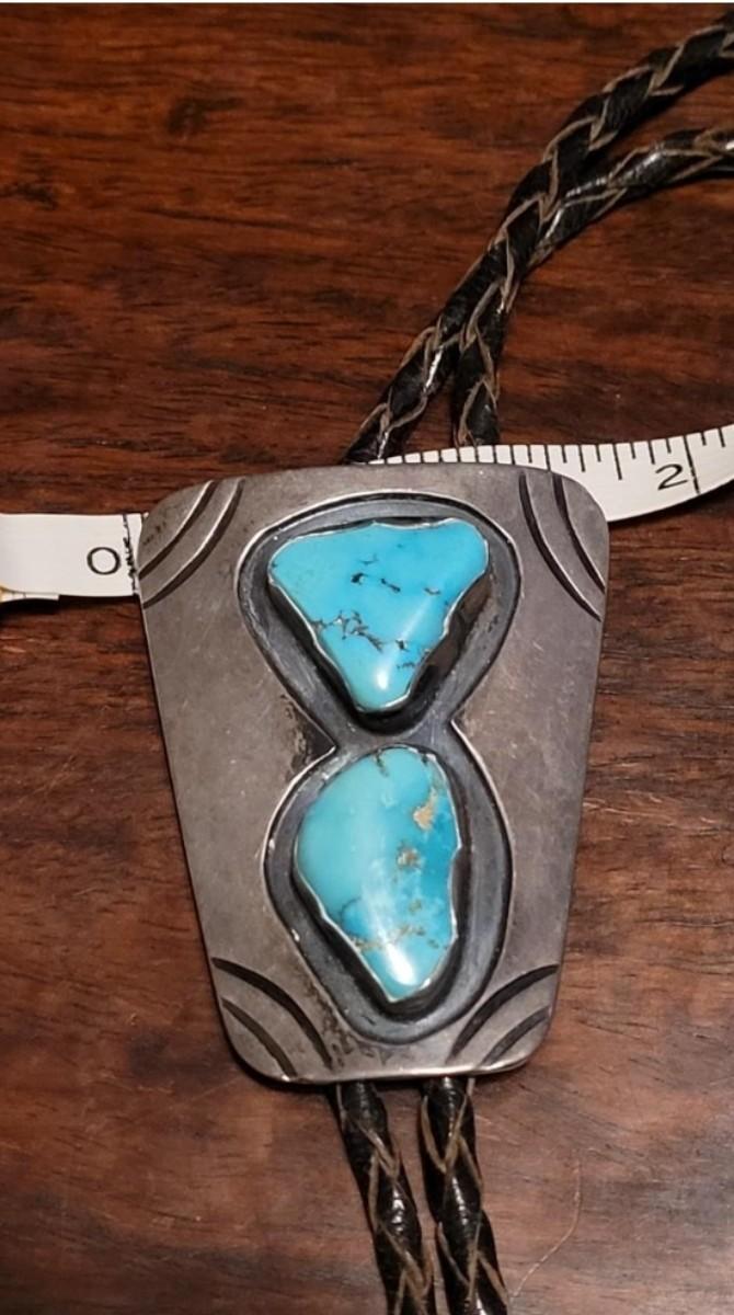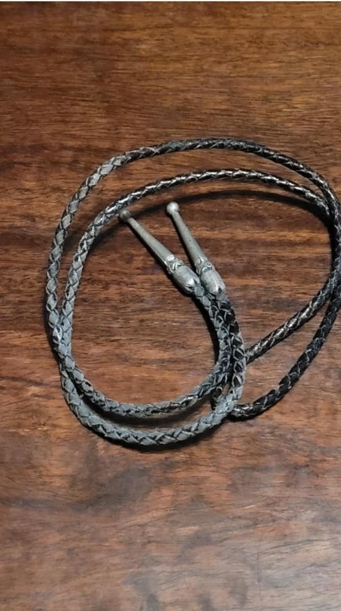 The leather string with the turquoise piece is missing one of the sterling tassel ends. Extra Bolo string included. Marked KWXO but not marked sterling.