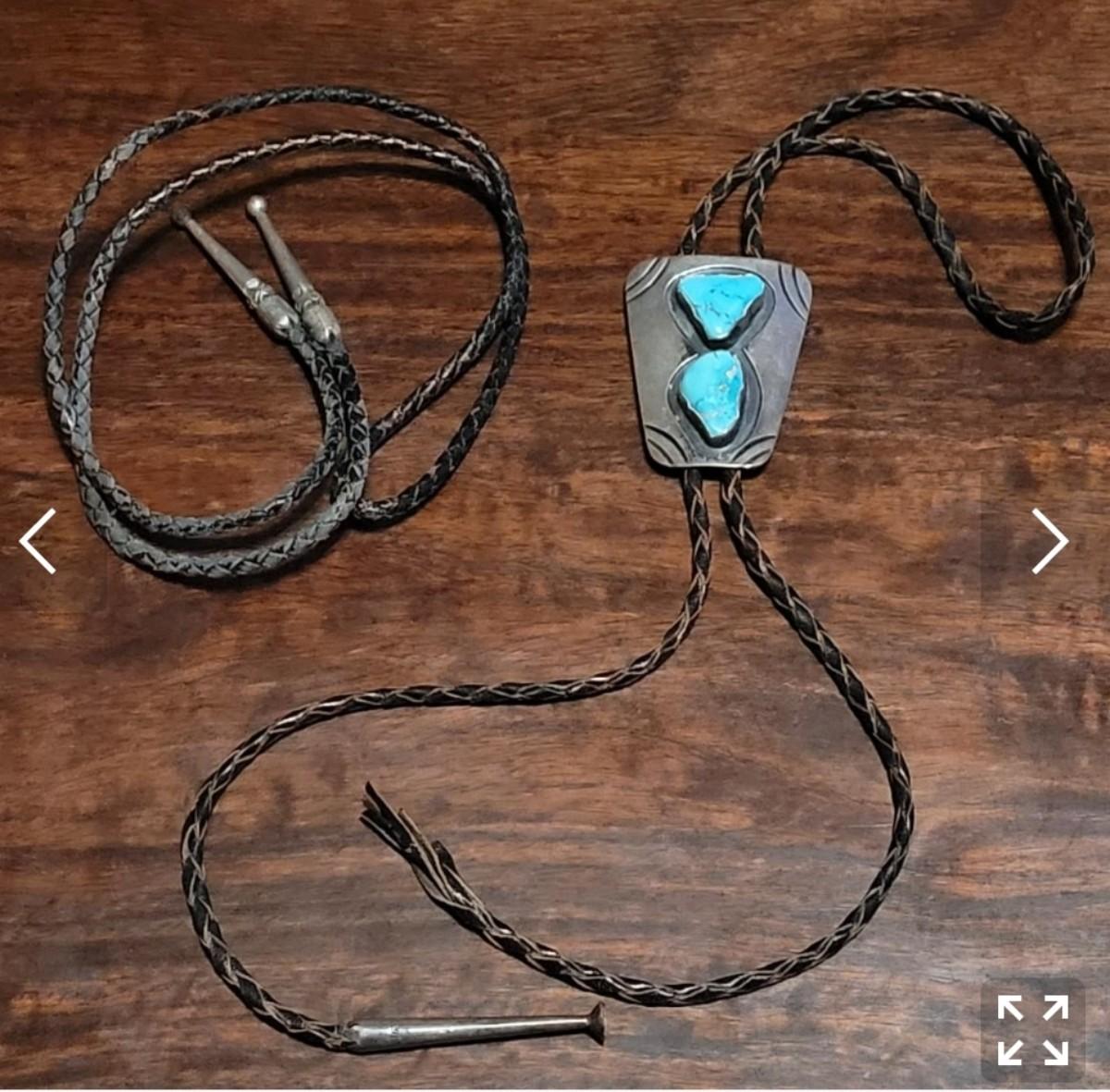 Lot 265: Vintage Navajo Sterling and Turquoise Bolo Tie and Extra Bolo Woven Leather String