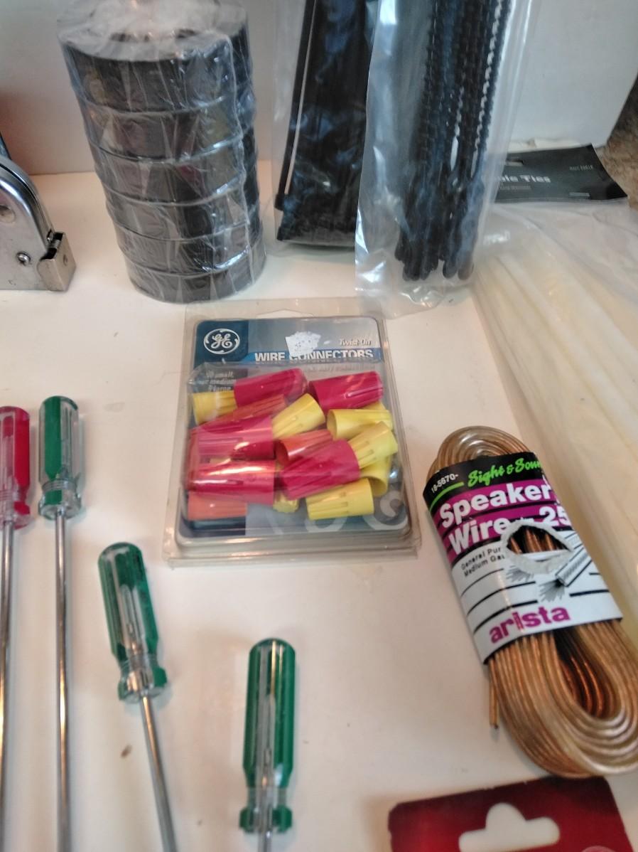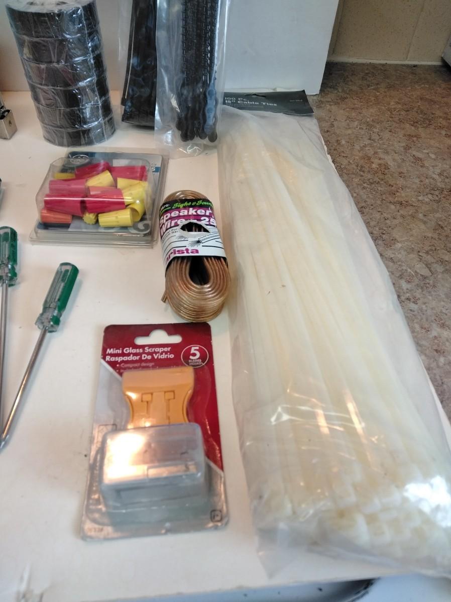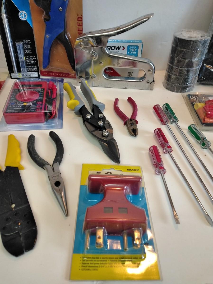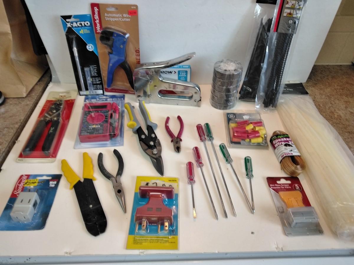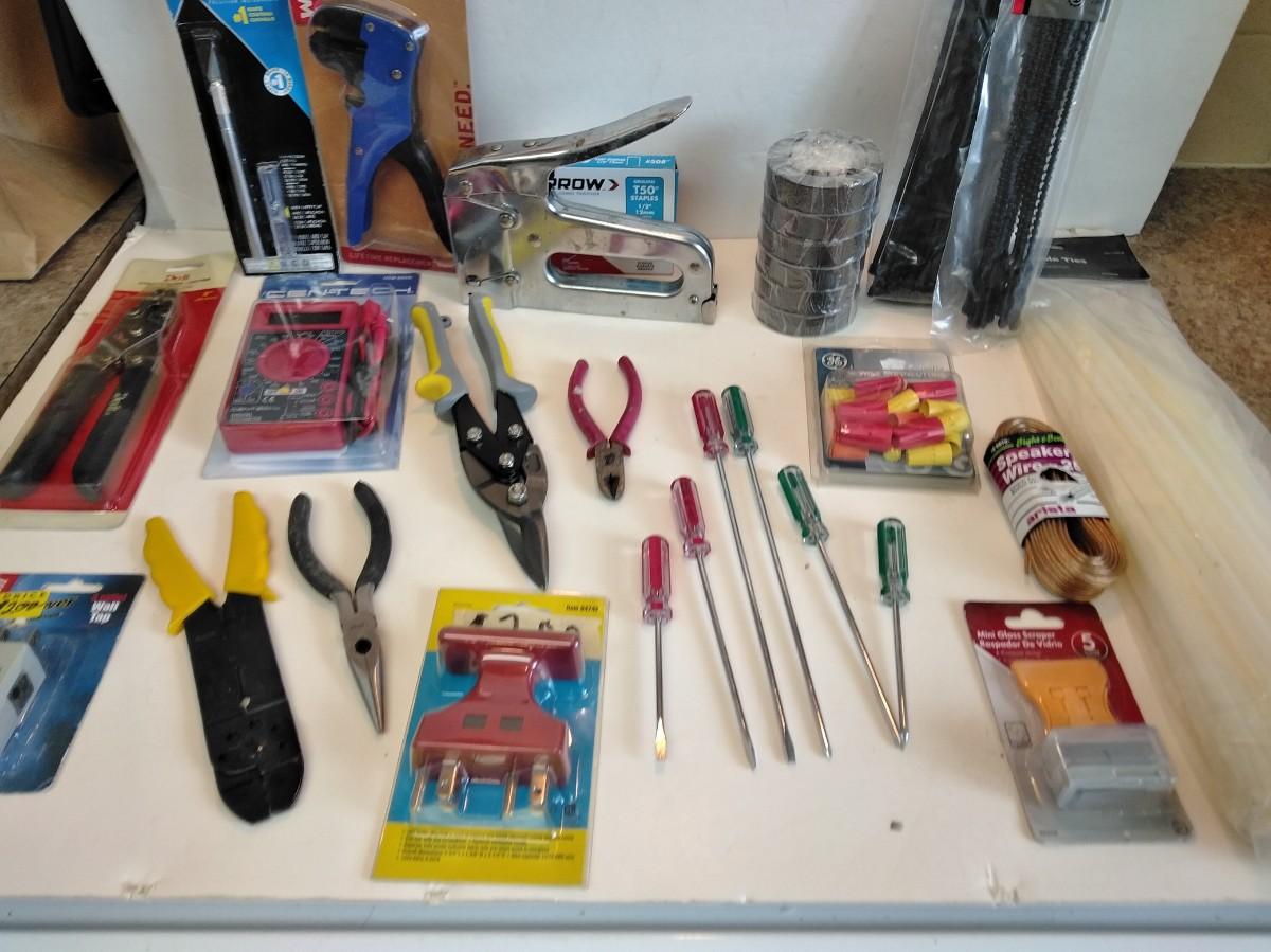 ELECTRONIC HAND TOOLS, ELECTRICAL TAPE ROLLS, SPEAKER WIRRE, MULTI-METER, WIRE STRIPPERS, PLIERS, SCREWDRIVERS, ZIP TIES AND MORE.
