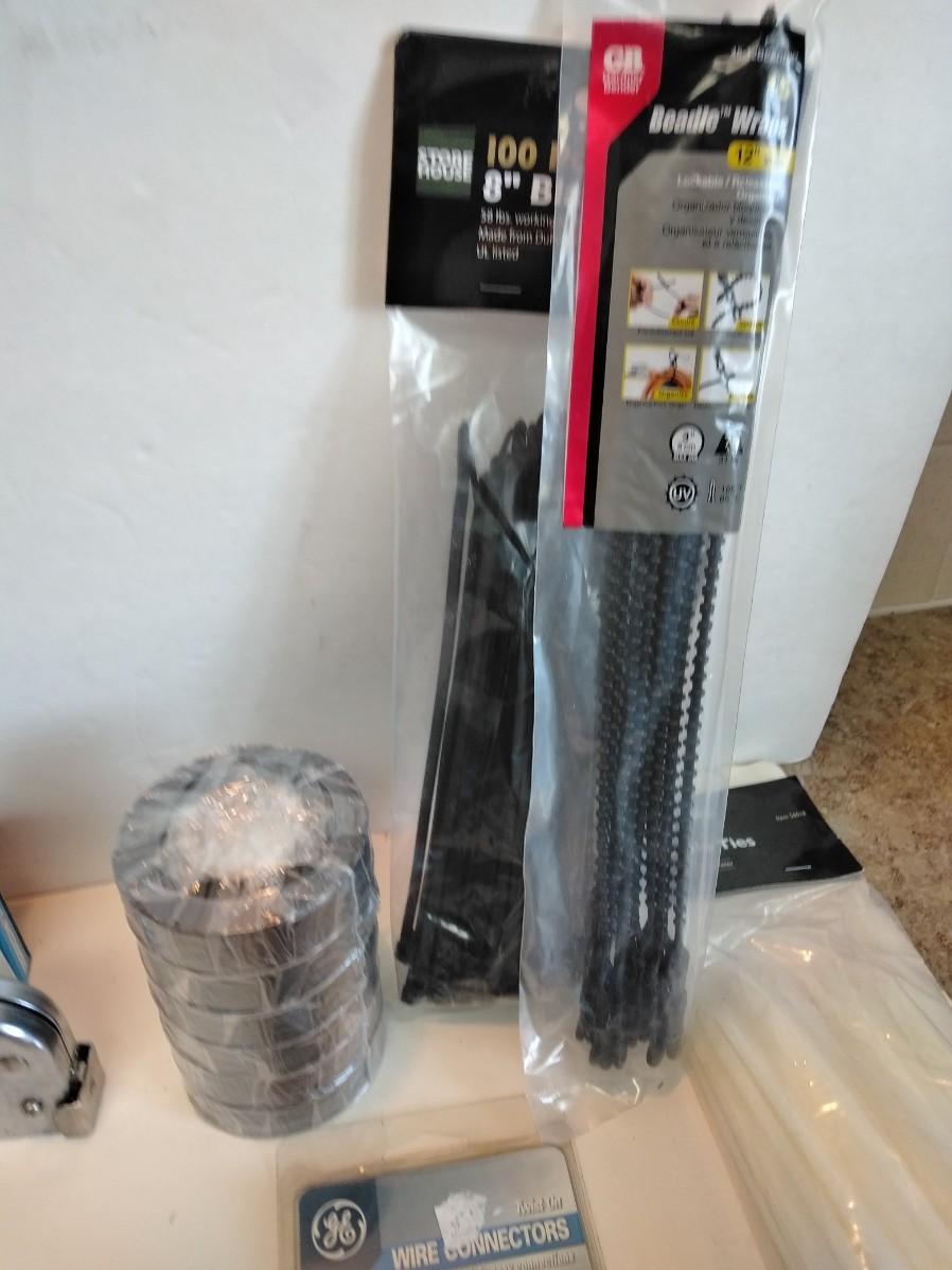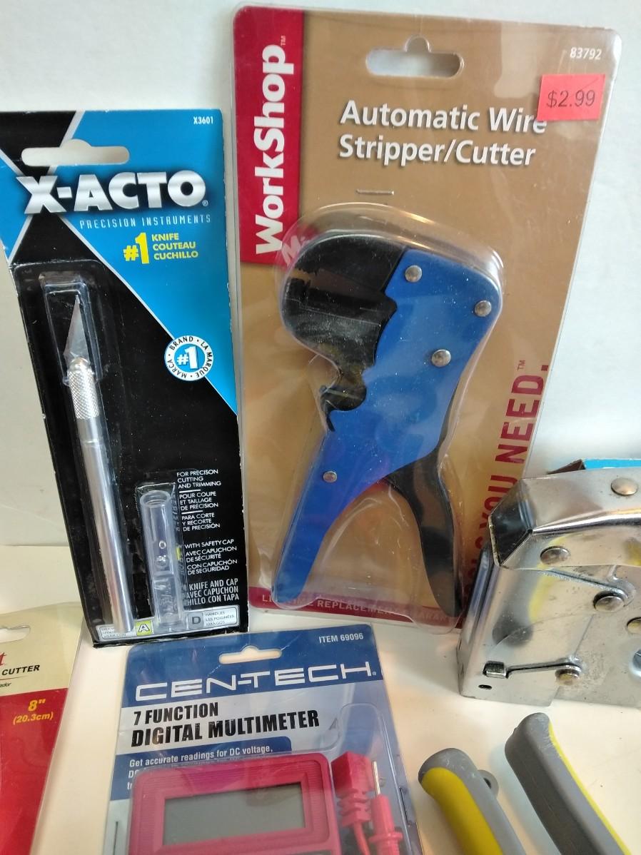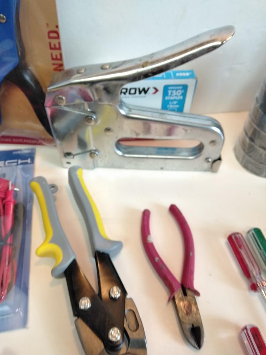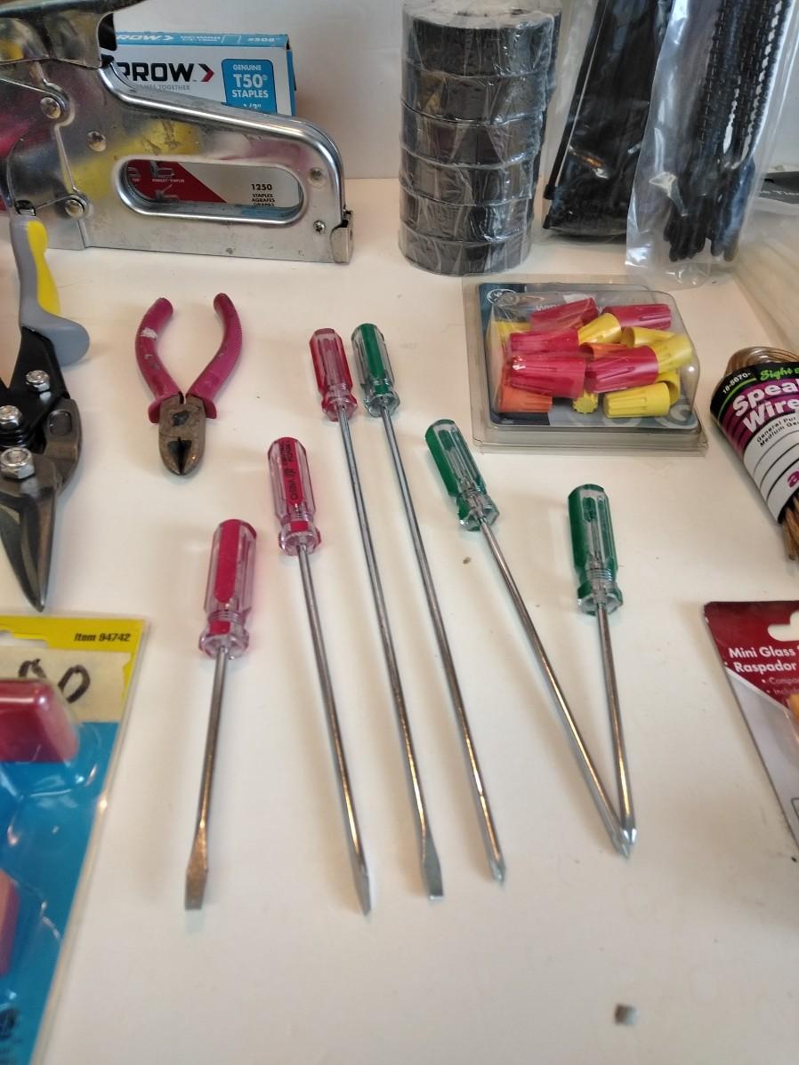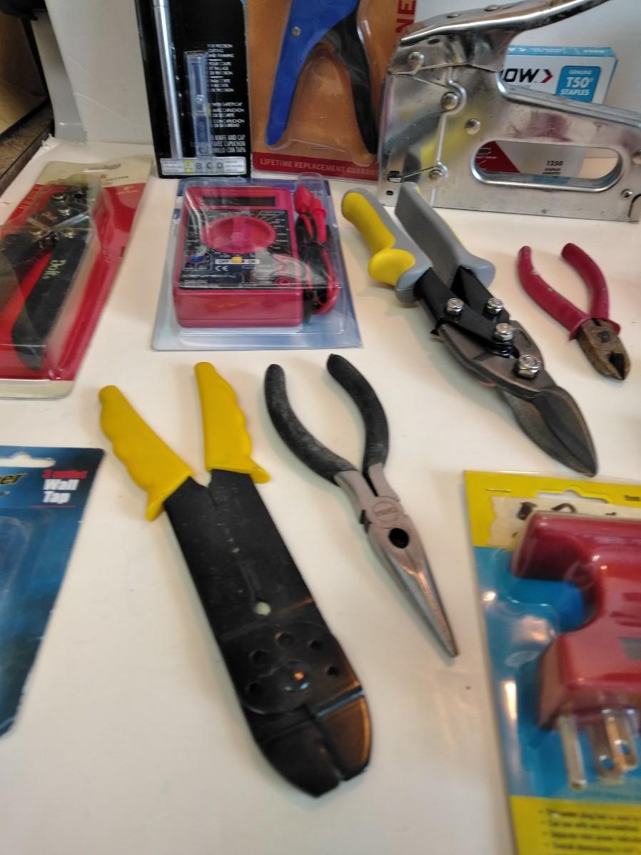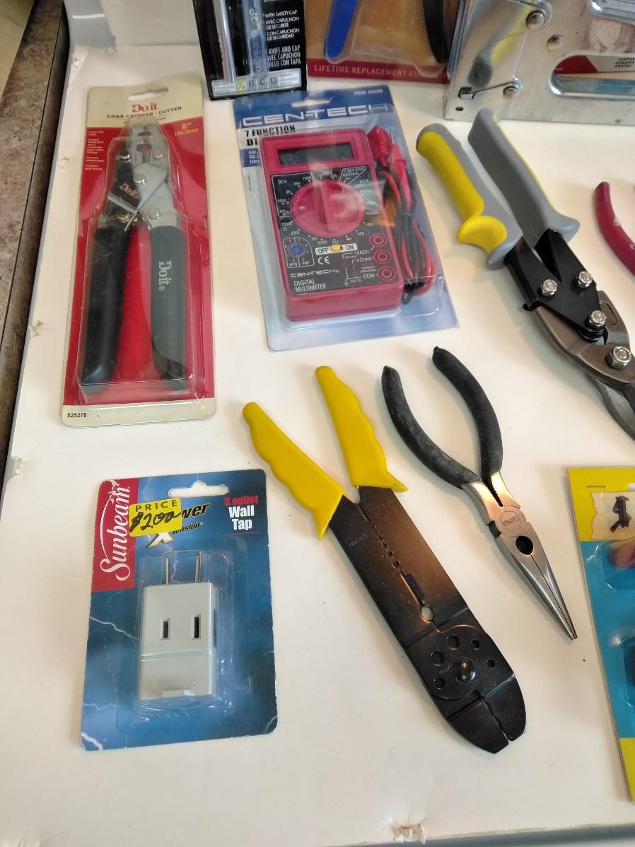 ELECTRONIC HAND TOOLS, ELECTRICAL TAPE ROLLS, SPEAKER WIRRE, MULTI-METER, WIRE STRIPPERS, PLIERS, SCREWDRIVERS, ZIP TIES AND MORE.