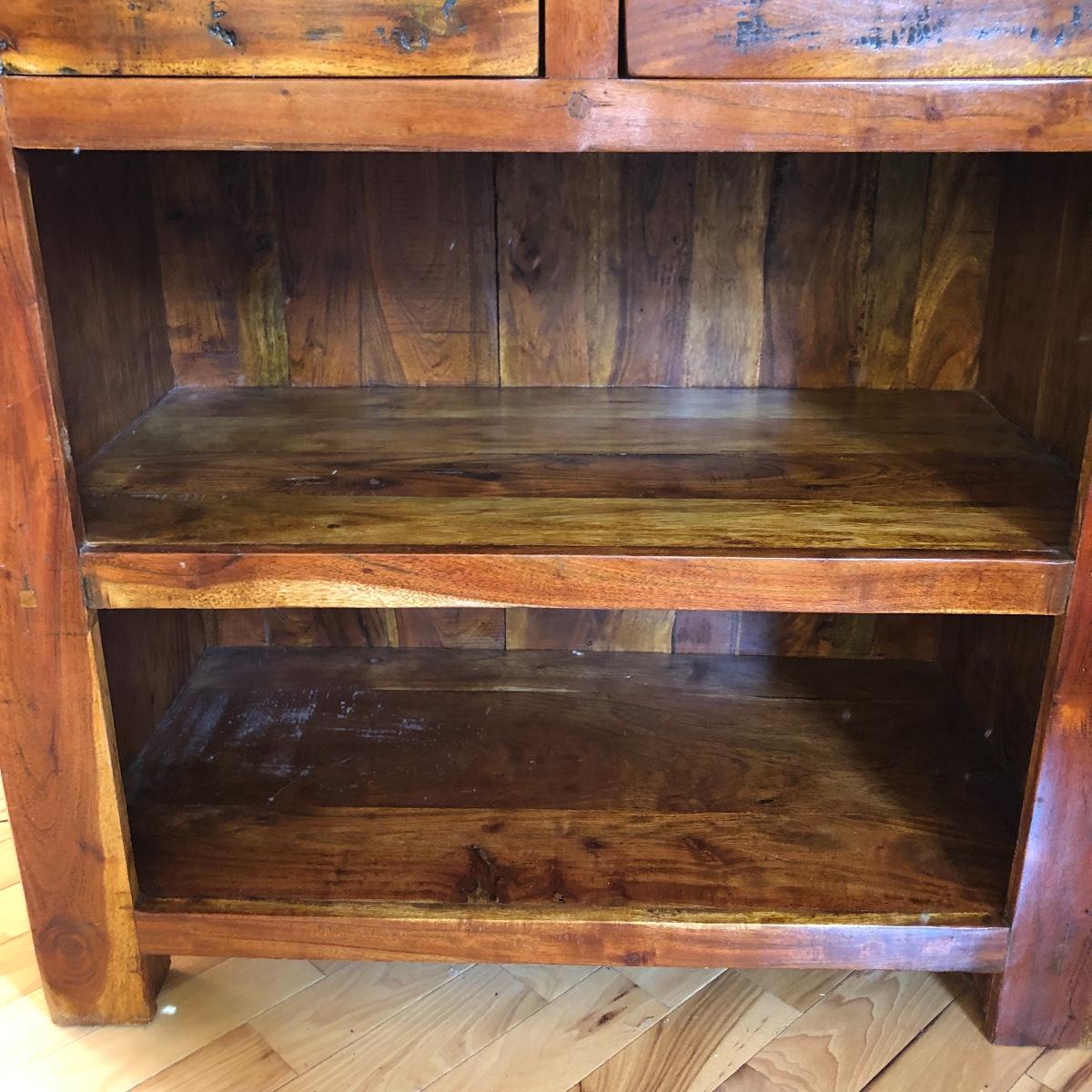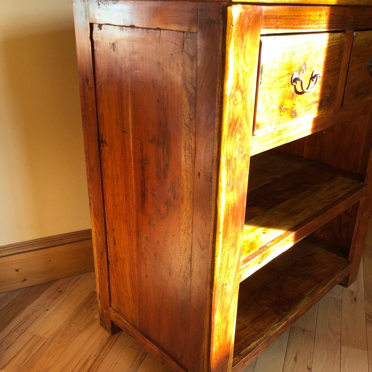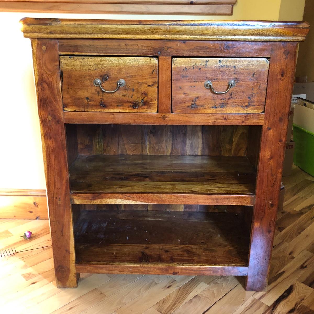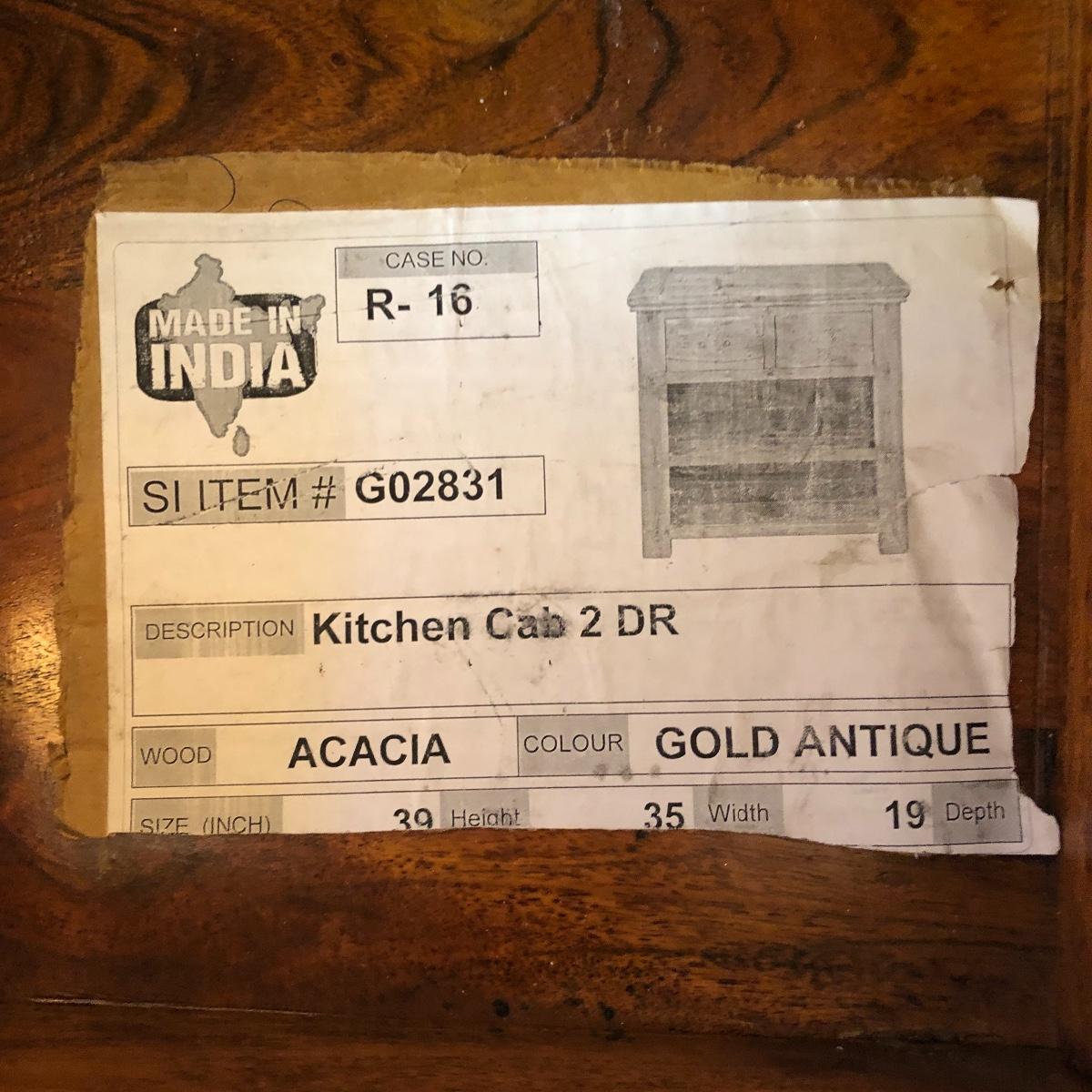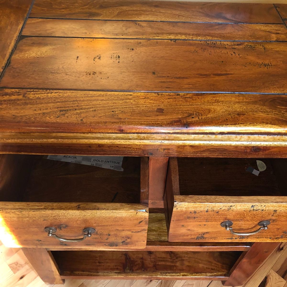 This cabinet is practical and good looking with two shelves underneath two drawers and is made in India from Acacia wood. Cabinet has a few scratches, see pictures. Cabinet measures 19” x 35” x 39.5”. Bring help item is substantial.