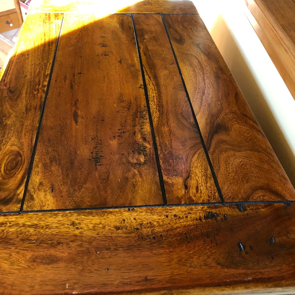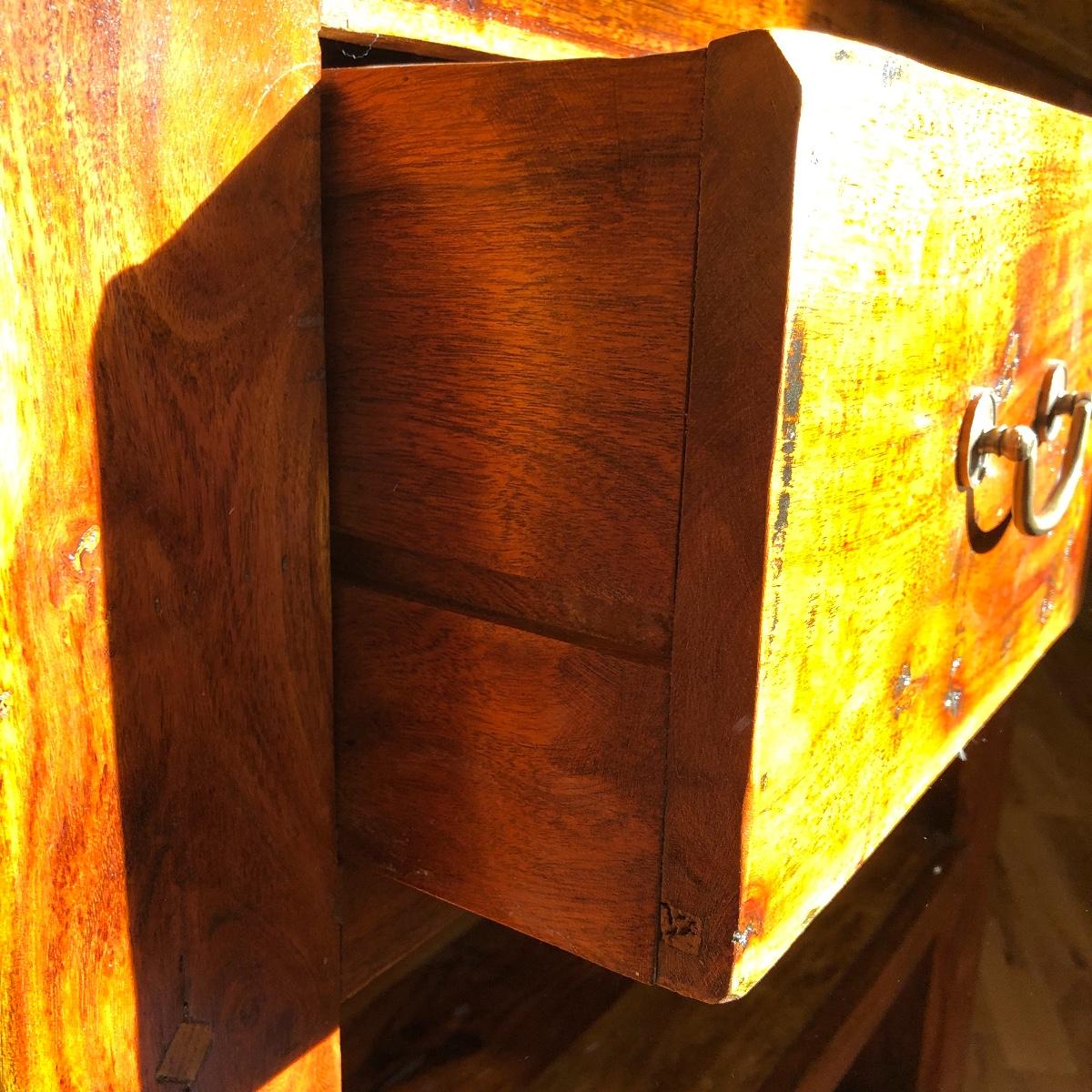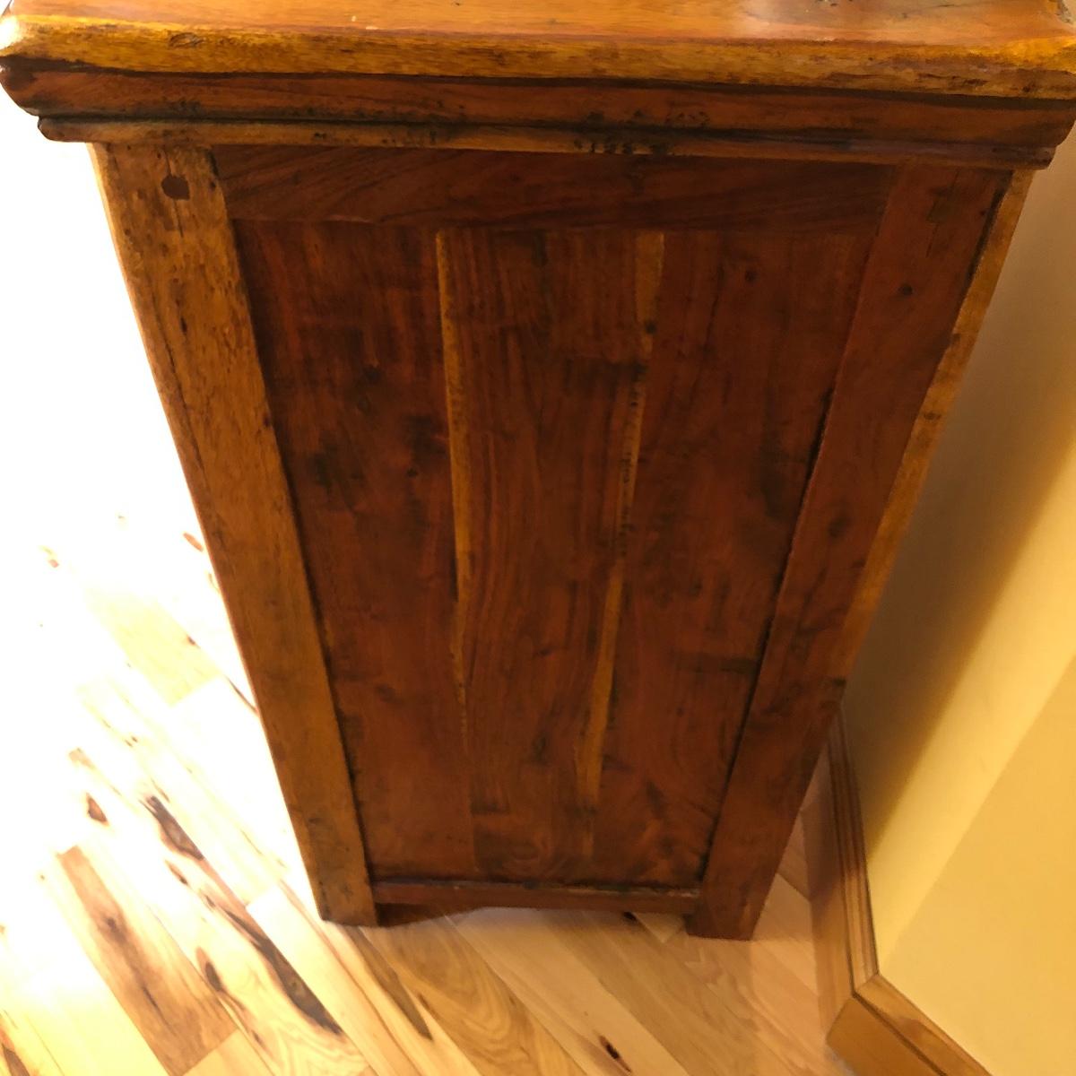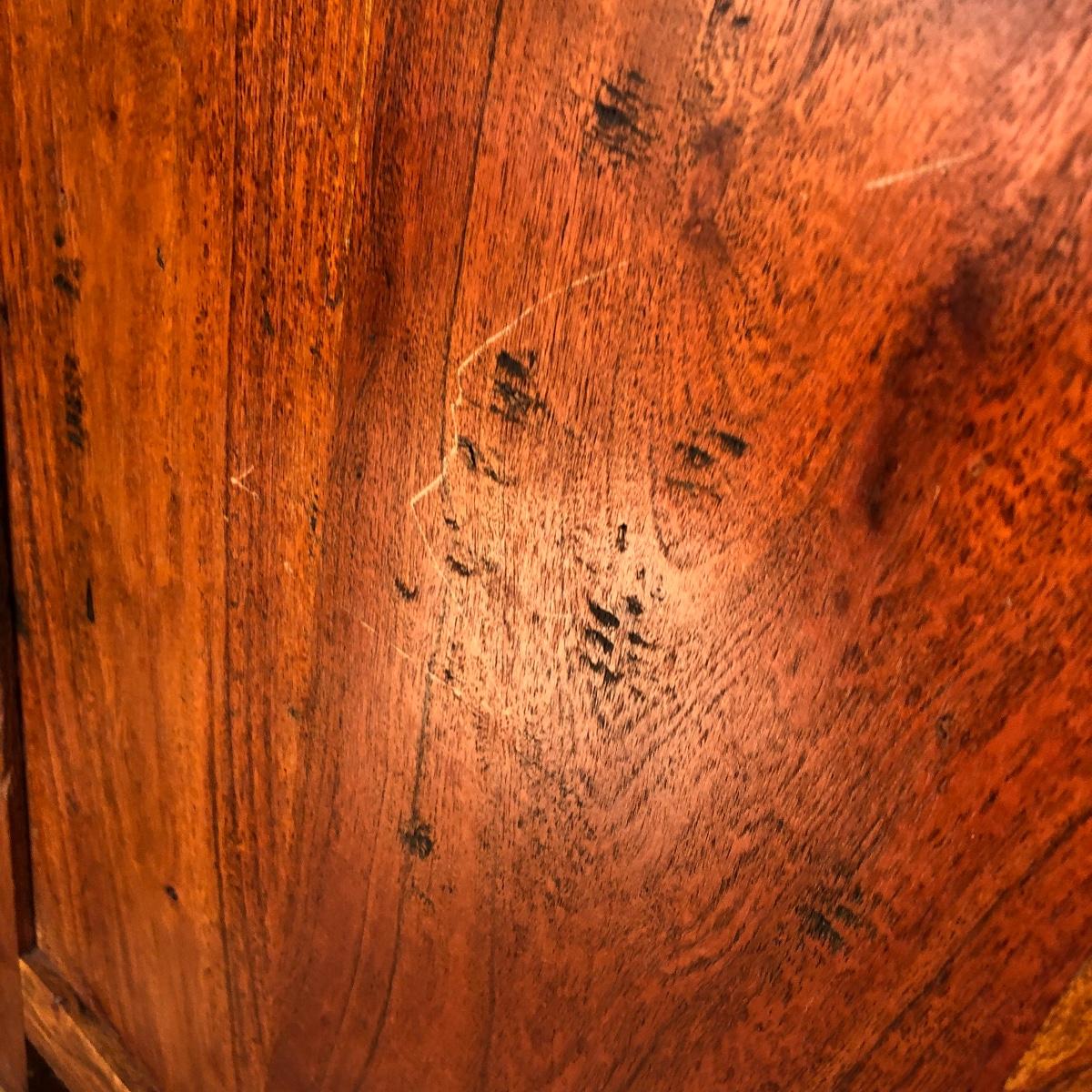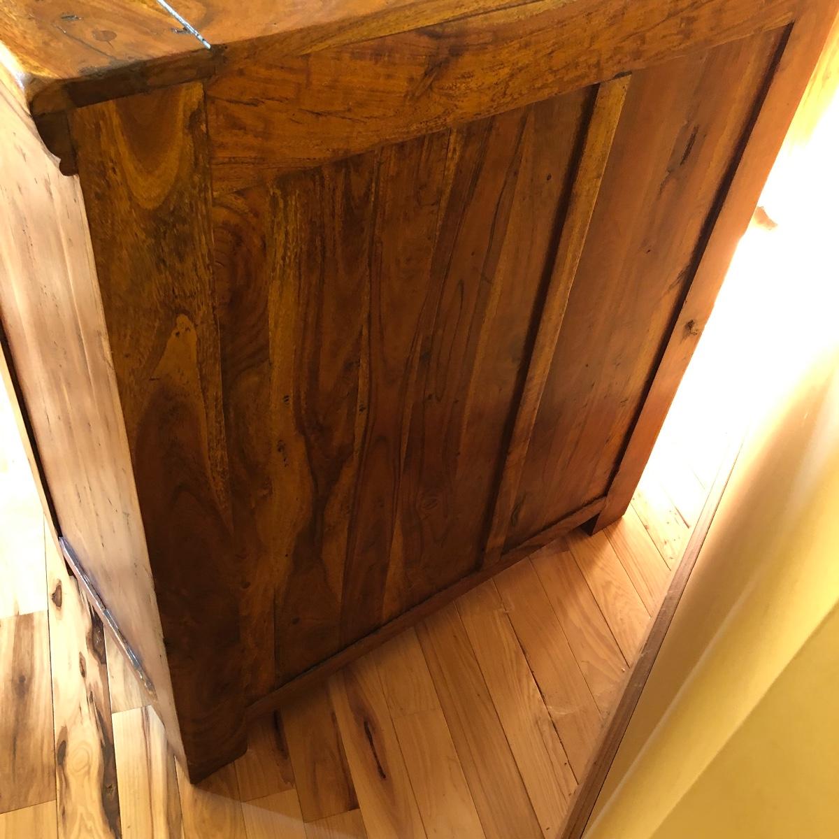 This cabinet is practical and good looking with two shelves underneath two drawers and is made in India from Acacia wood. Cabinet has a few scratches, see pictures. Cabinet measures 19” x 35” x 39.5”. Bring help item is substantial.