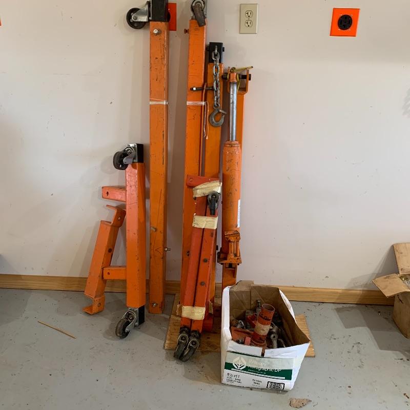 Already disassembled these two critical Motörhead necessities are an 8 ton long arm engine hoist and standard engine stand. We cannot guarantee all pieces are here but home owner disassembled to make easier for transport. All wheels are in good condition. Local pick up only.