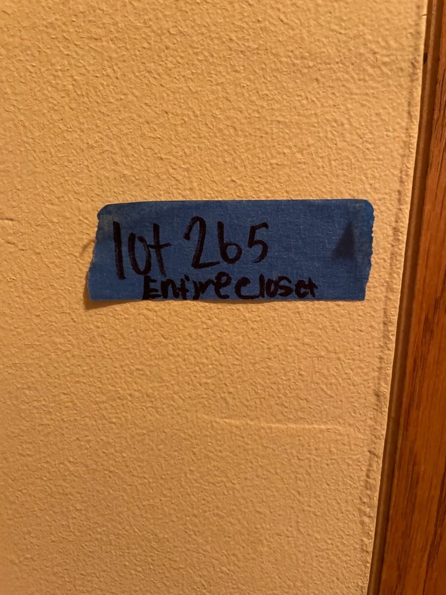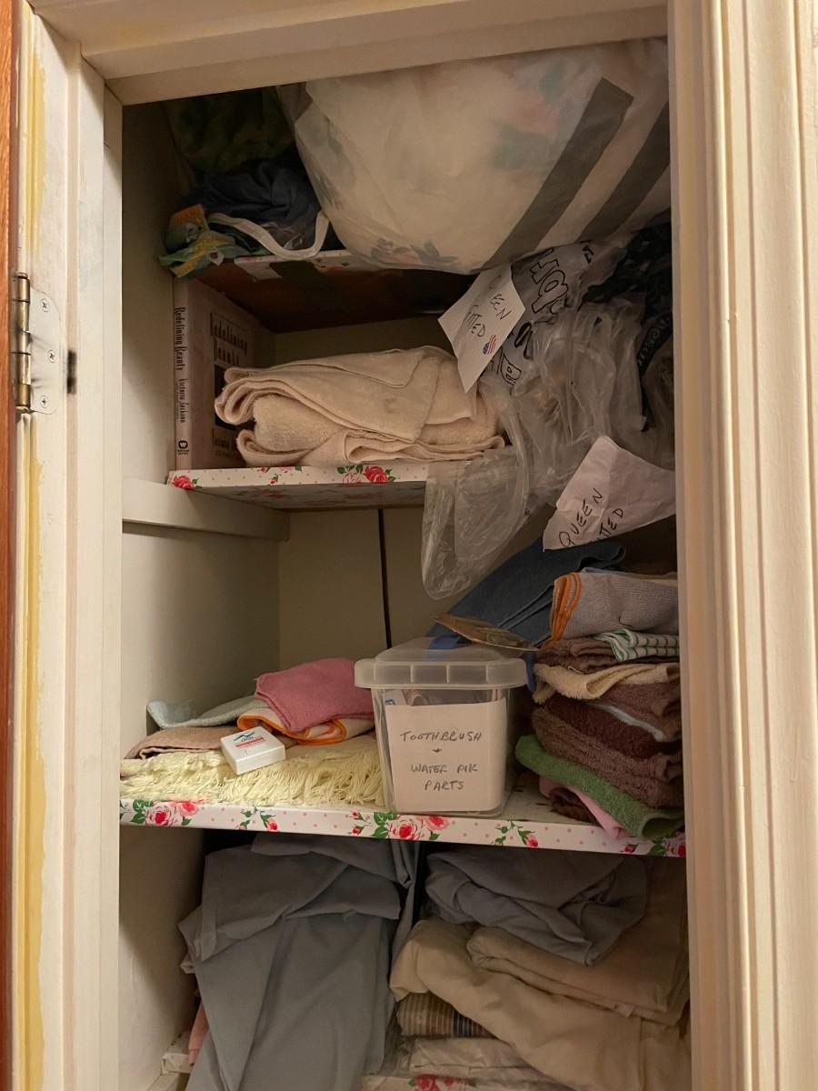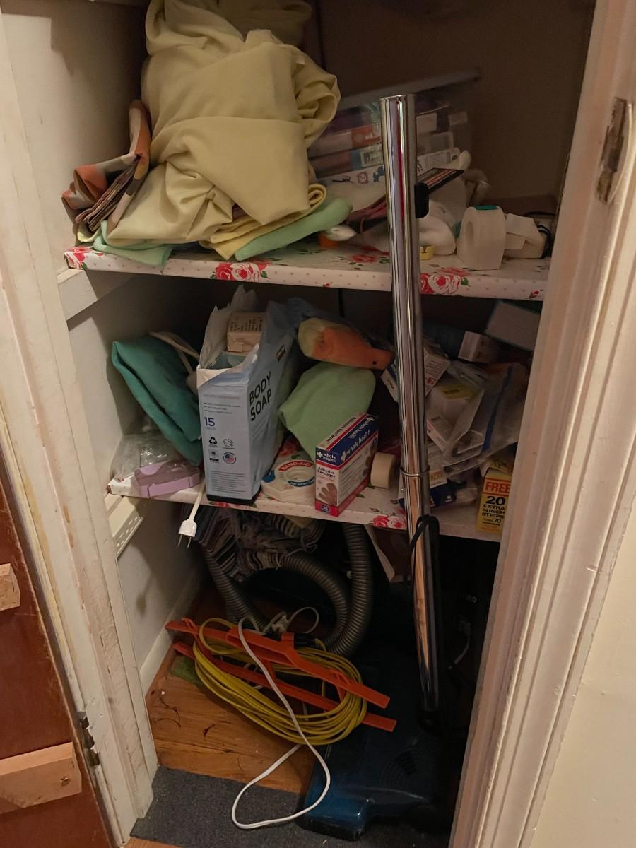 lot 265- closet with all contents linens, toiletries, vacuum, etc.