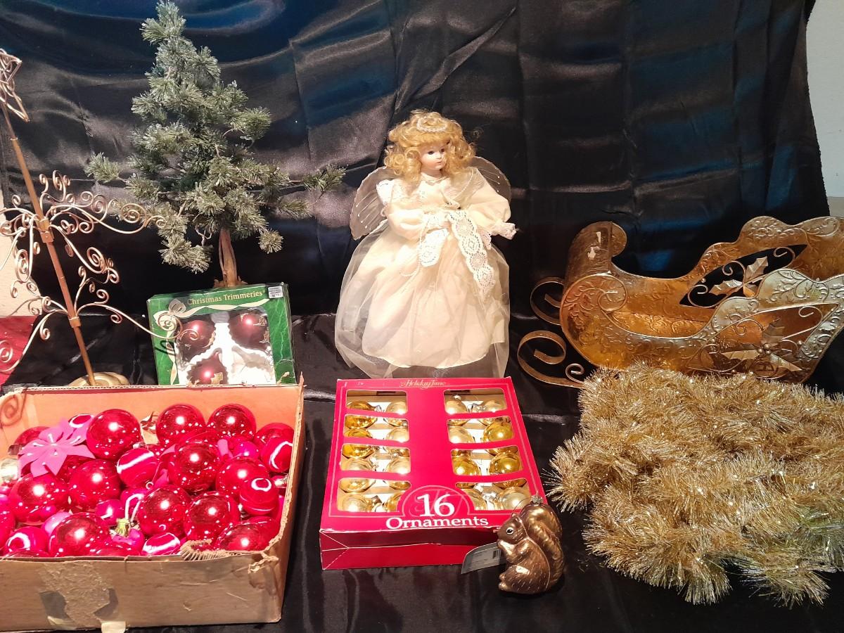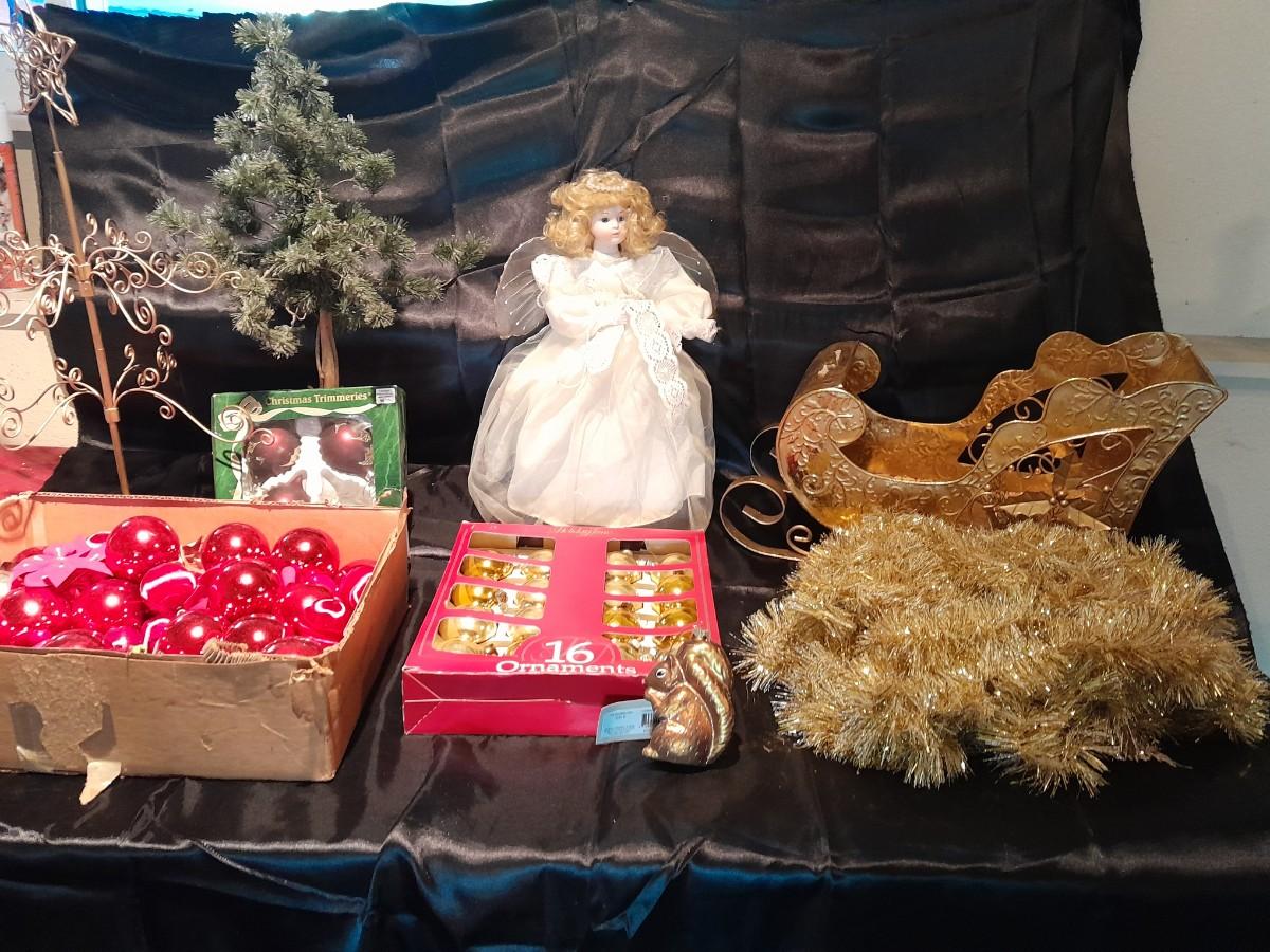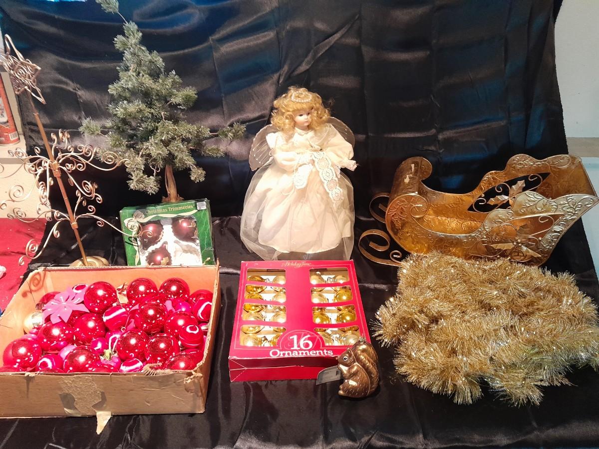 LOT 265 FIBER OPTIC FAIRY ANGEL LARGE GOLDEN SLEIGH, ORNAMENTS AND MORE
