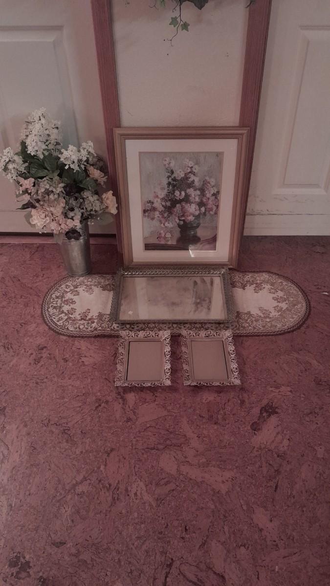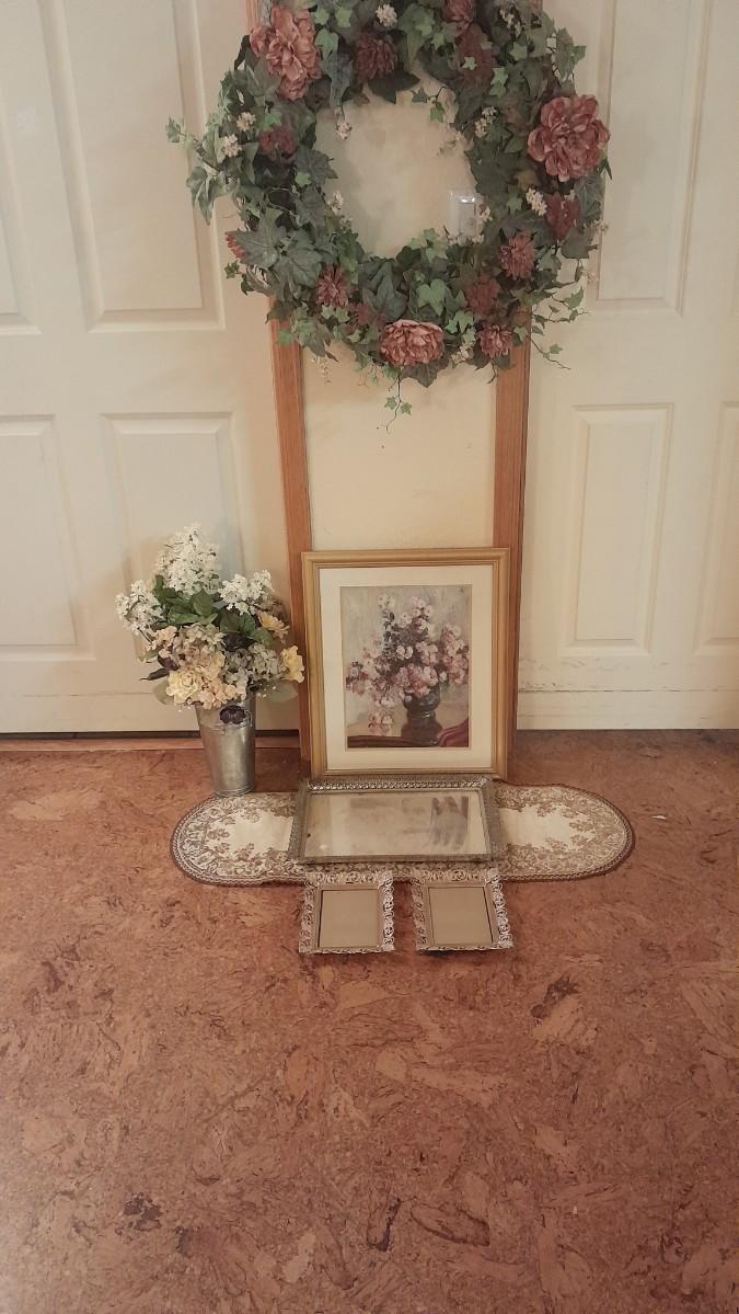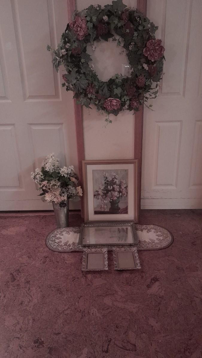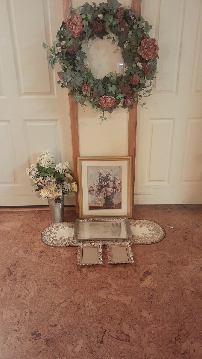 LARGE FAUX FLOWER WREATH, PICTURE, AND FAUX BOUQUET WITH DRESSER MIRROR AND TWO PICTURE FRAMES