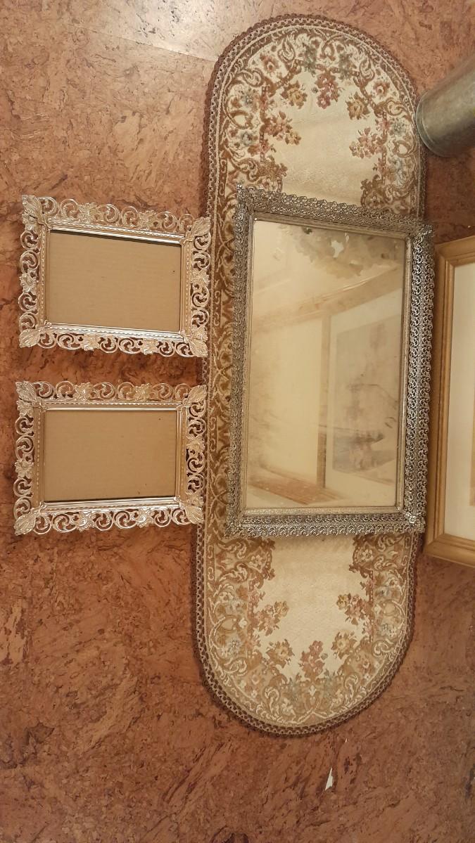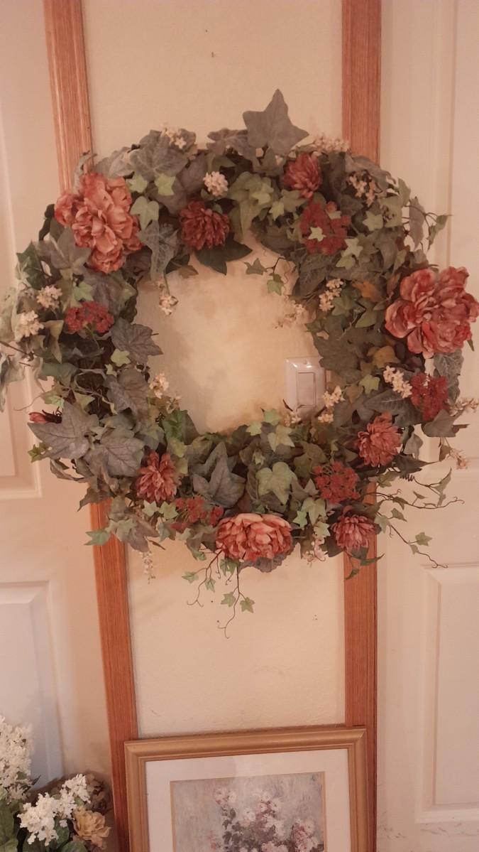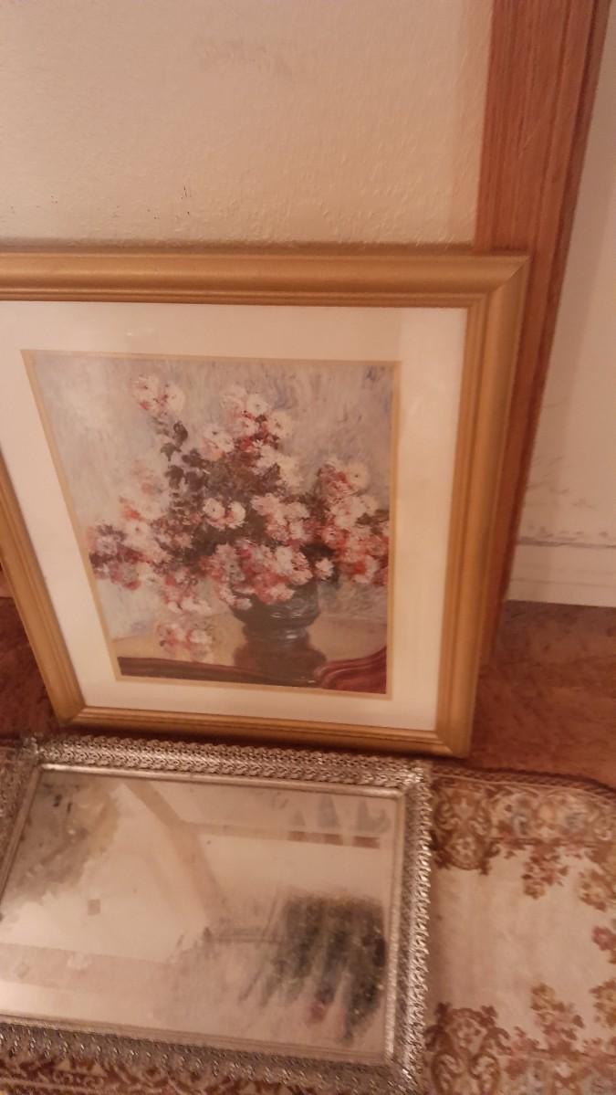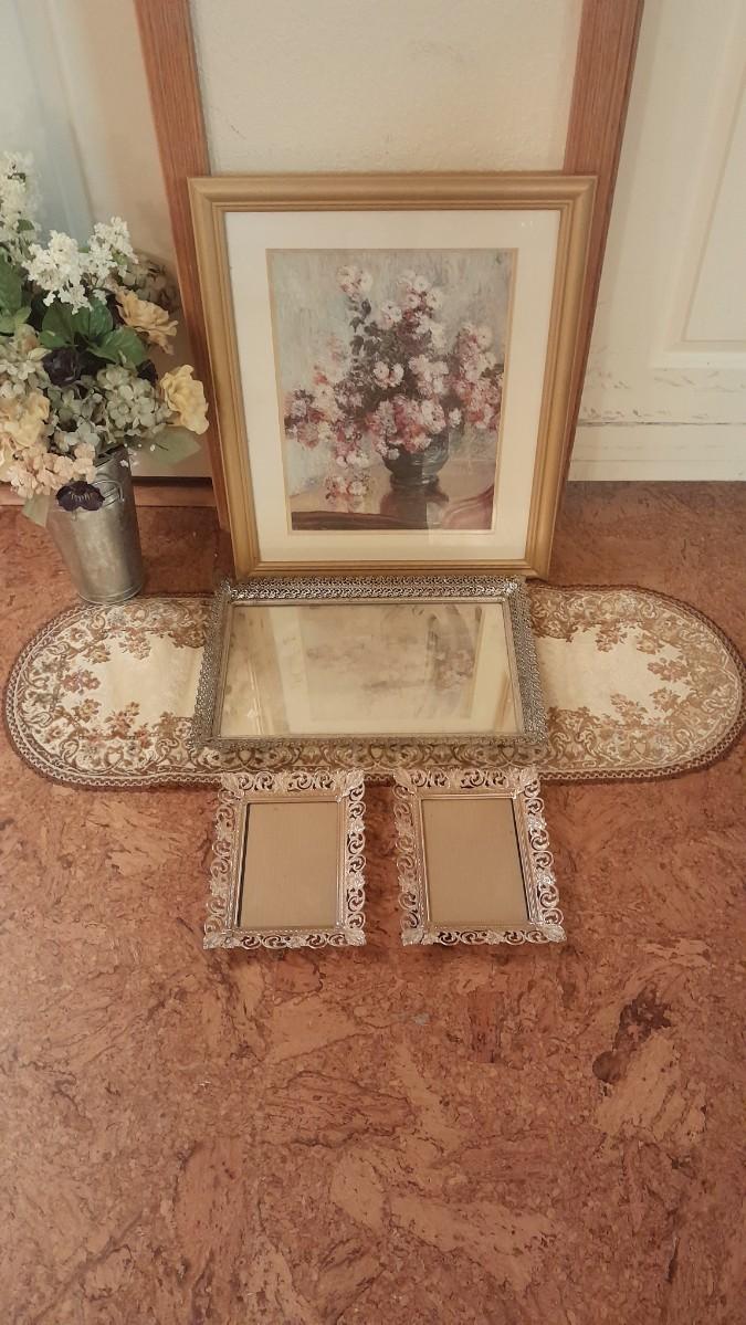 LARGE FAUX FLOWER WREATH, PICTURE, AND FAUX BOUQUET WITH DRESSER MIRROR AND TWO PICTURE FRAMES