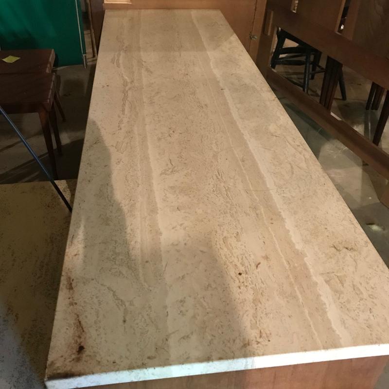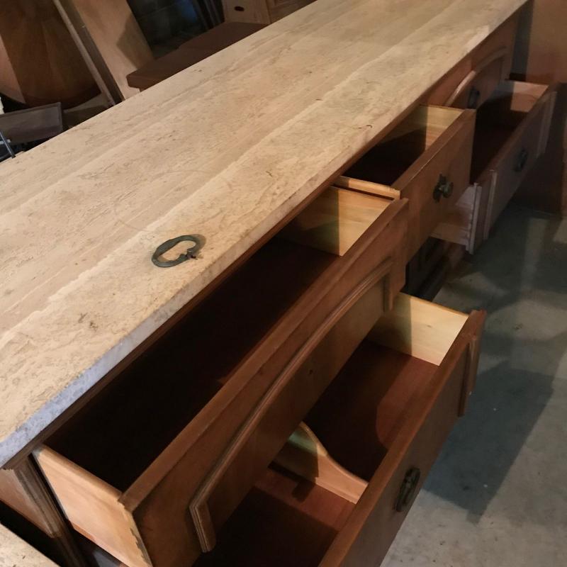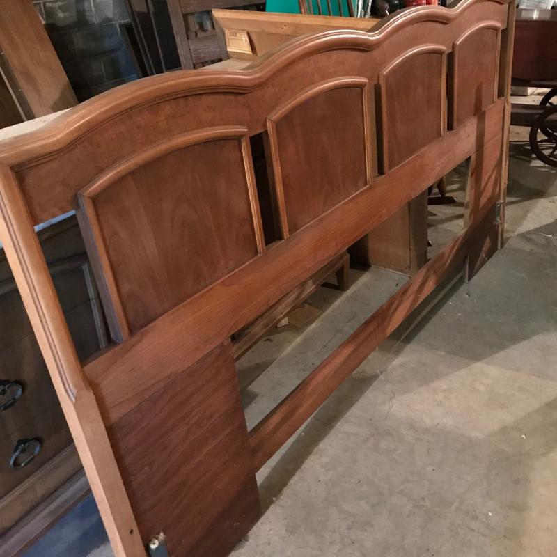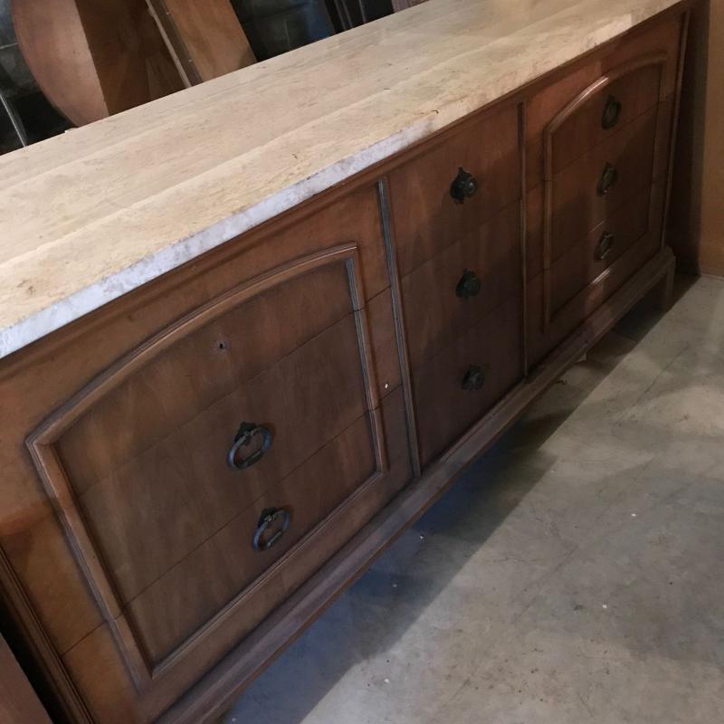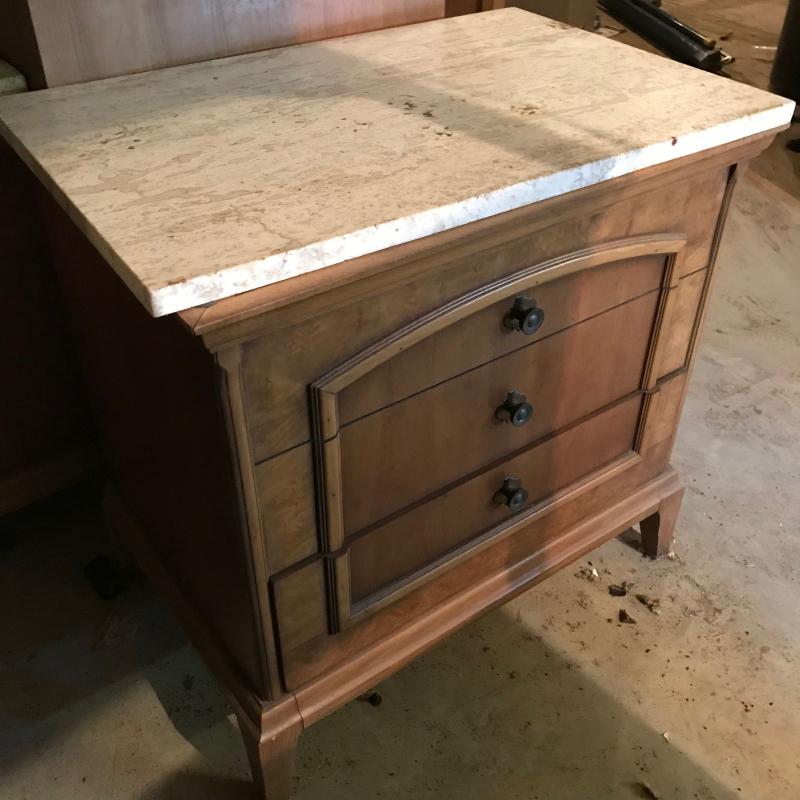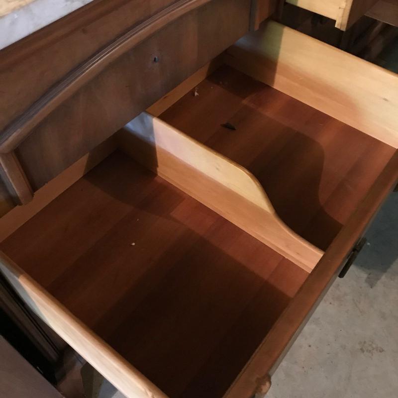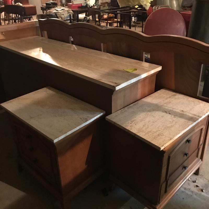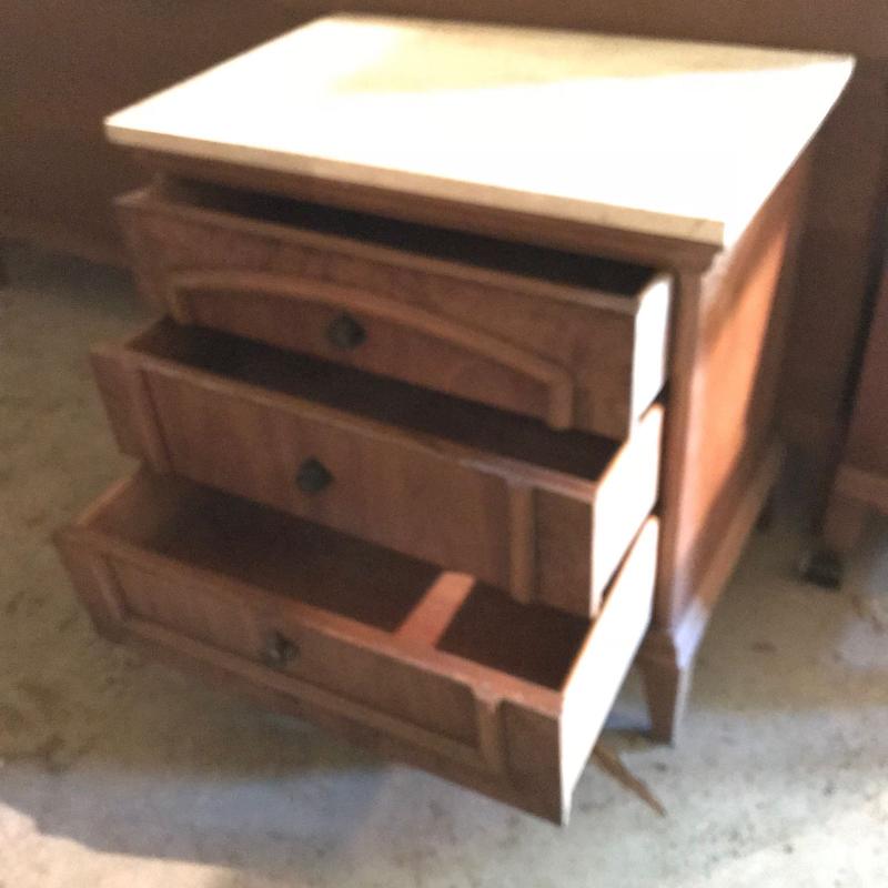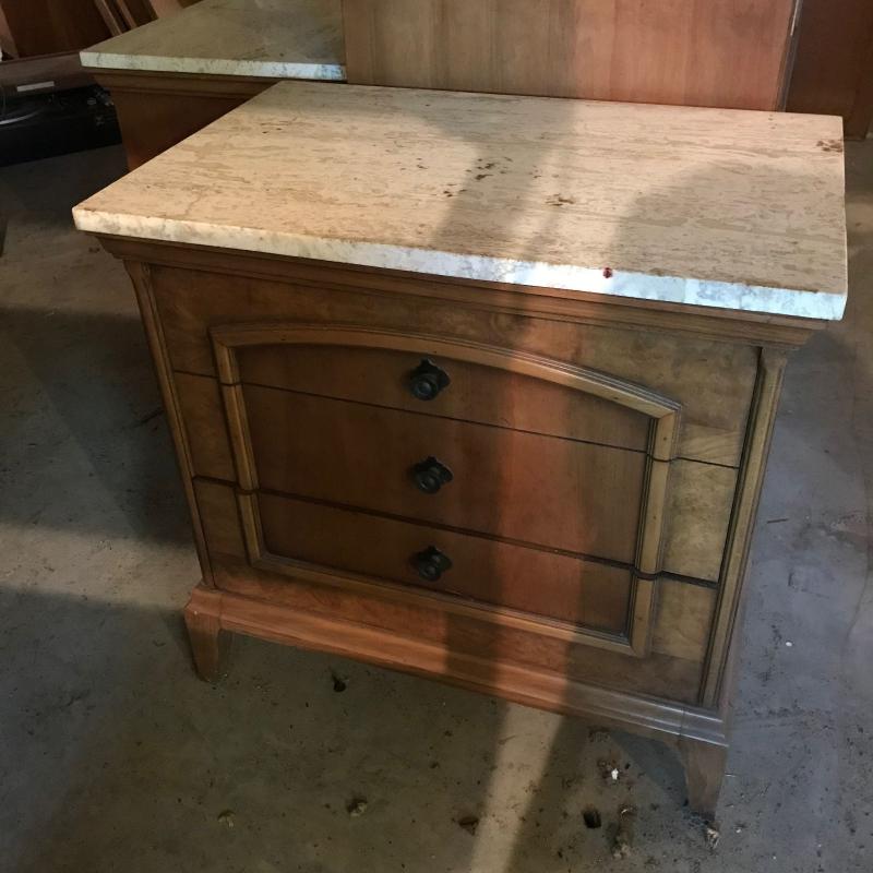 Very nice marble top side tables (24.5” x 16” x 24.5”h) and dresser (67” x 20” x 32”h) in this suite. Also includes a mirror with marble inlay can be attached to dresser or hung on a wall (48”x 30”). Bed frame is 79” x 41”. This set has been in a basement and has some swollen drawers but is otherwise in great condition.