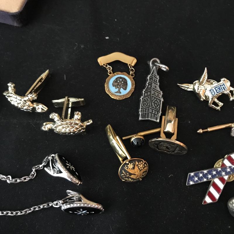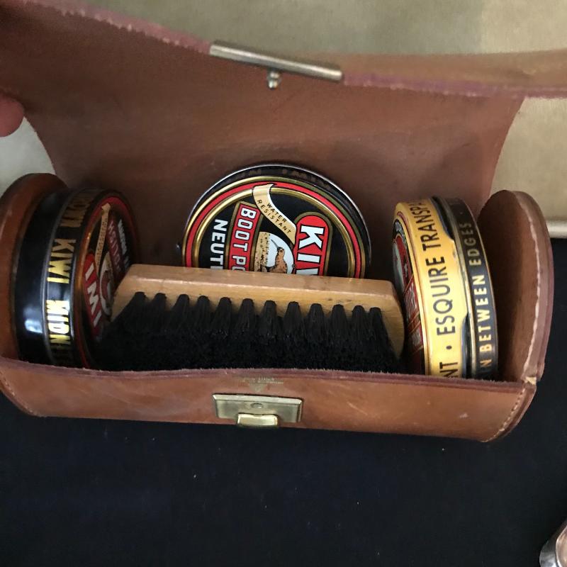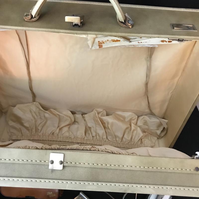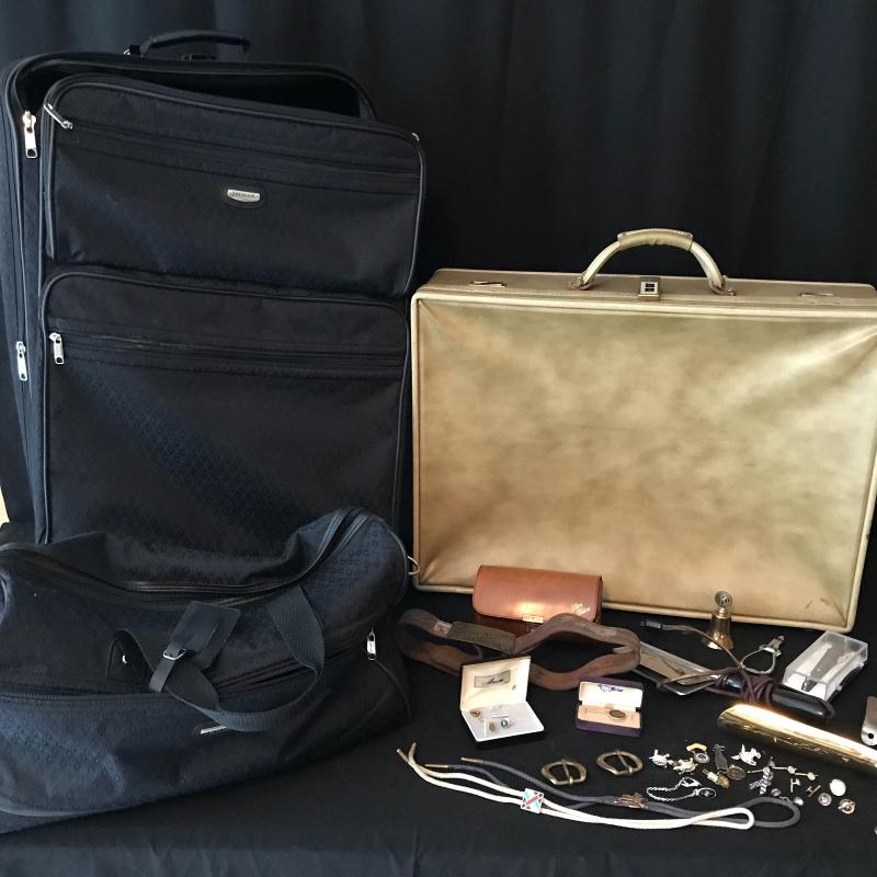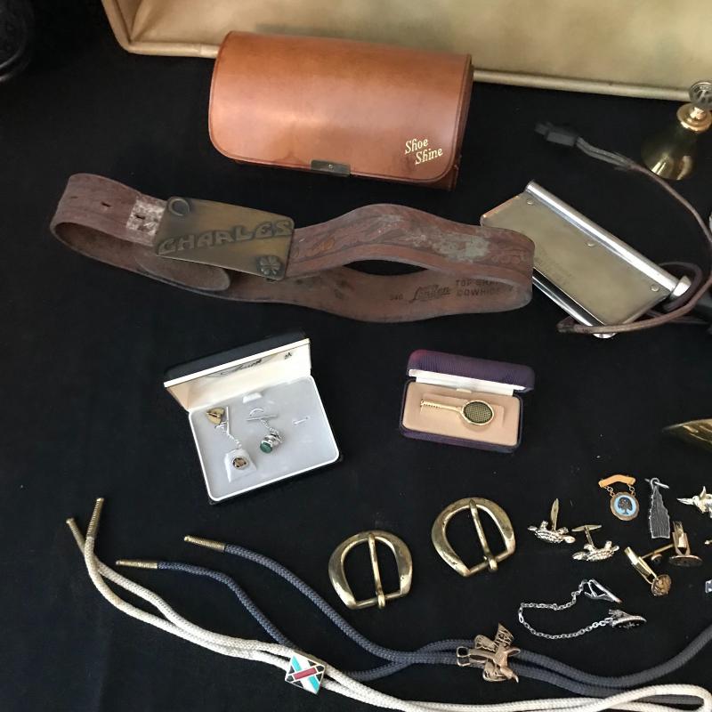 Lot includes many items for the stylish traveler including Jaguar suitcase and matching bag, vintage Hartmann suitcase (does not have key but locks can be replaced), Kiwanis Bell/pins and Mens cuff links, vintage Schivk razor in case, belt buckles, shoe horns and more. See pics. No shipping available. Local pickup only in Asheville, NC.