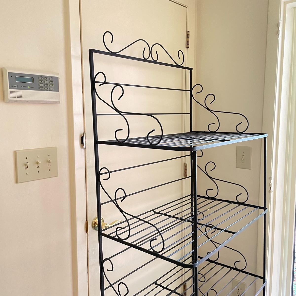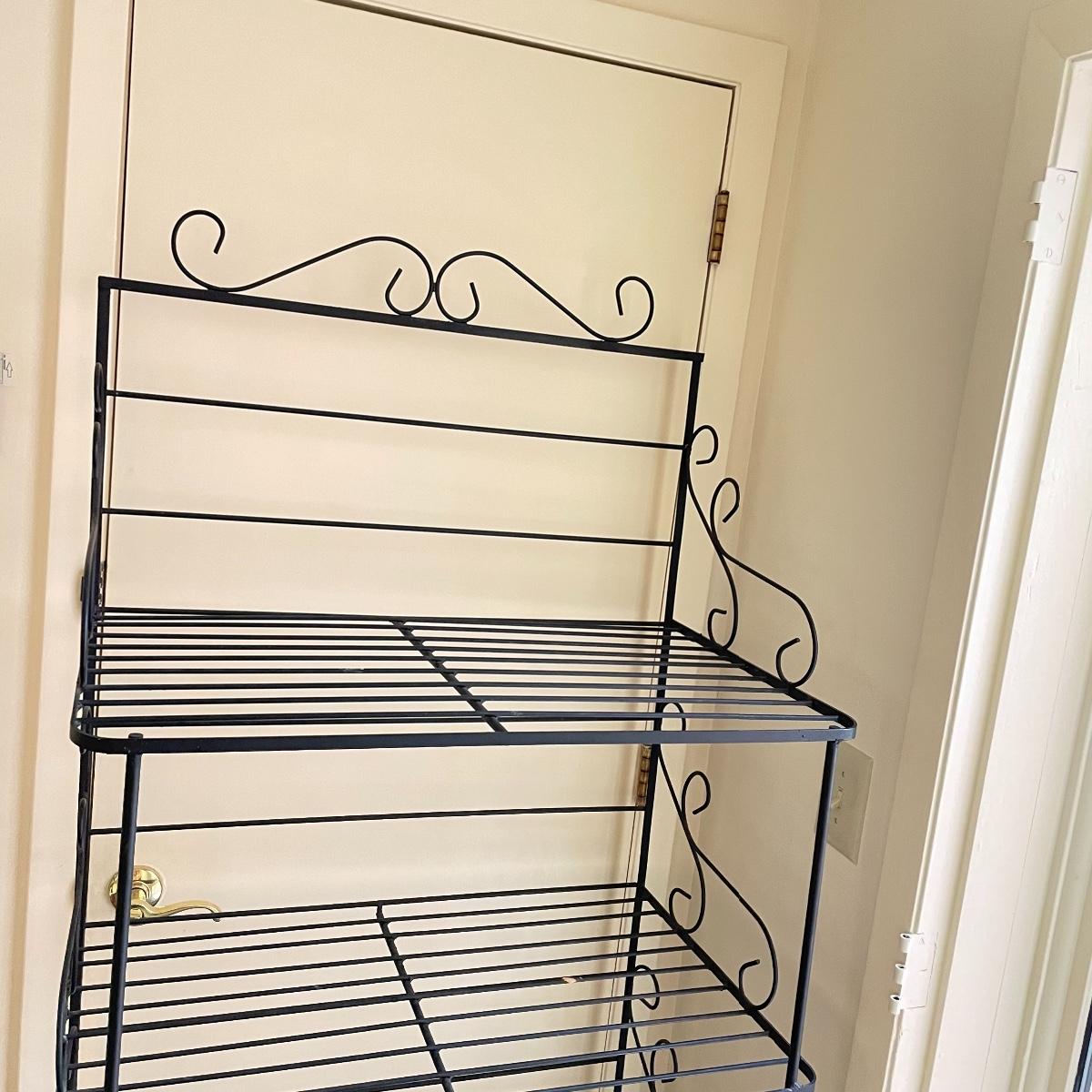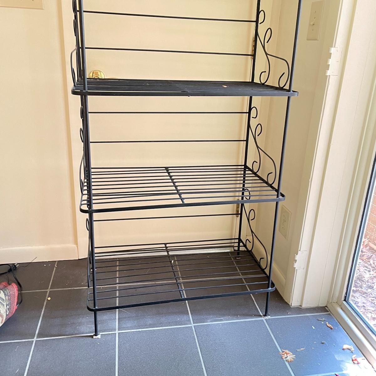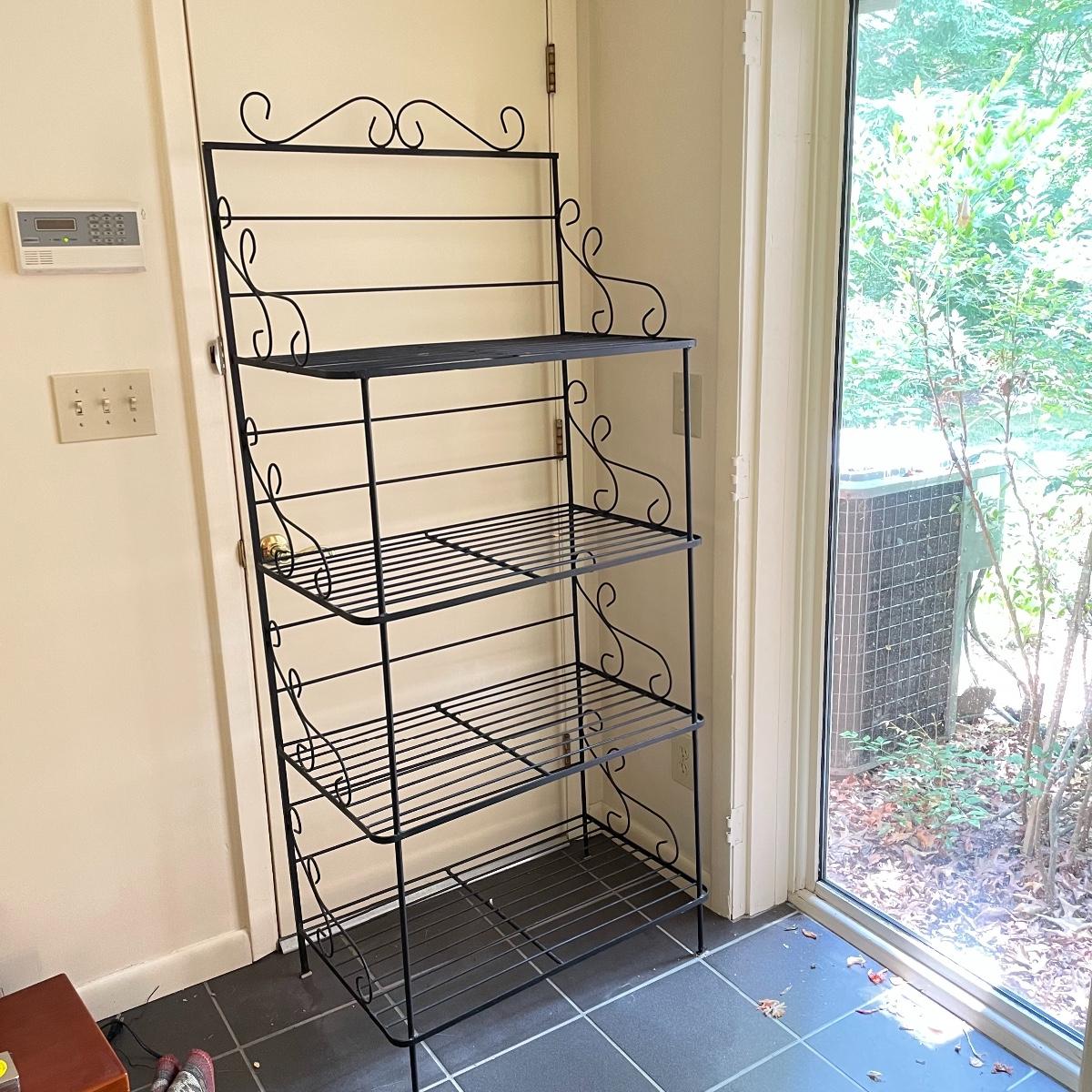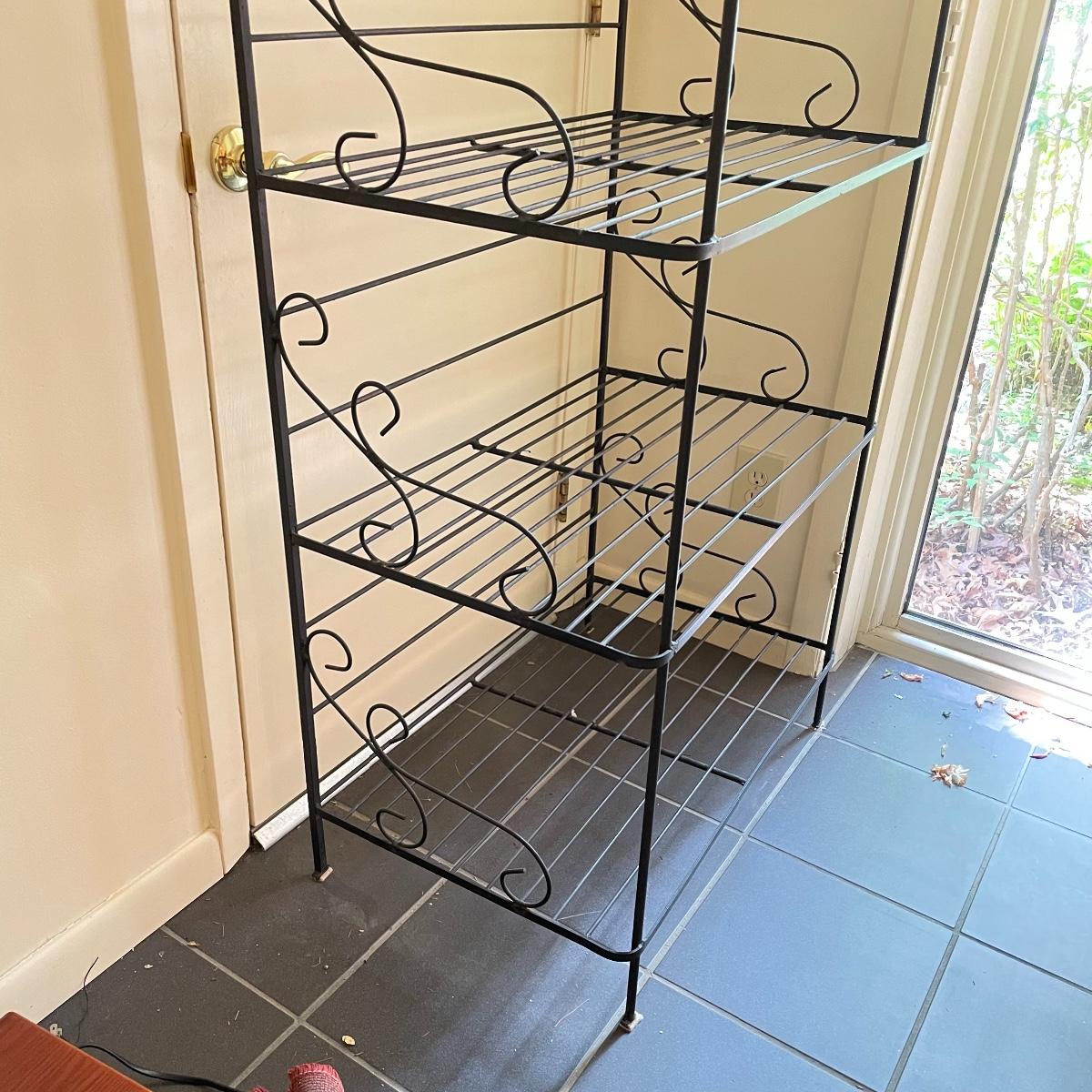 A sturdy black metal baker’s rack has a million uses. With simple designs, it looks great, but will also showcase whatever you choose to put on it. This rack is great for permanent decor or use as it does not fold up. It will also save you a lot of valuable space, measuring 30” x 18.5” x 69” with four shelves. See images. Local pick up only.