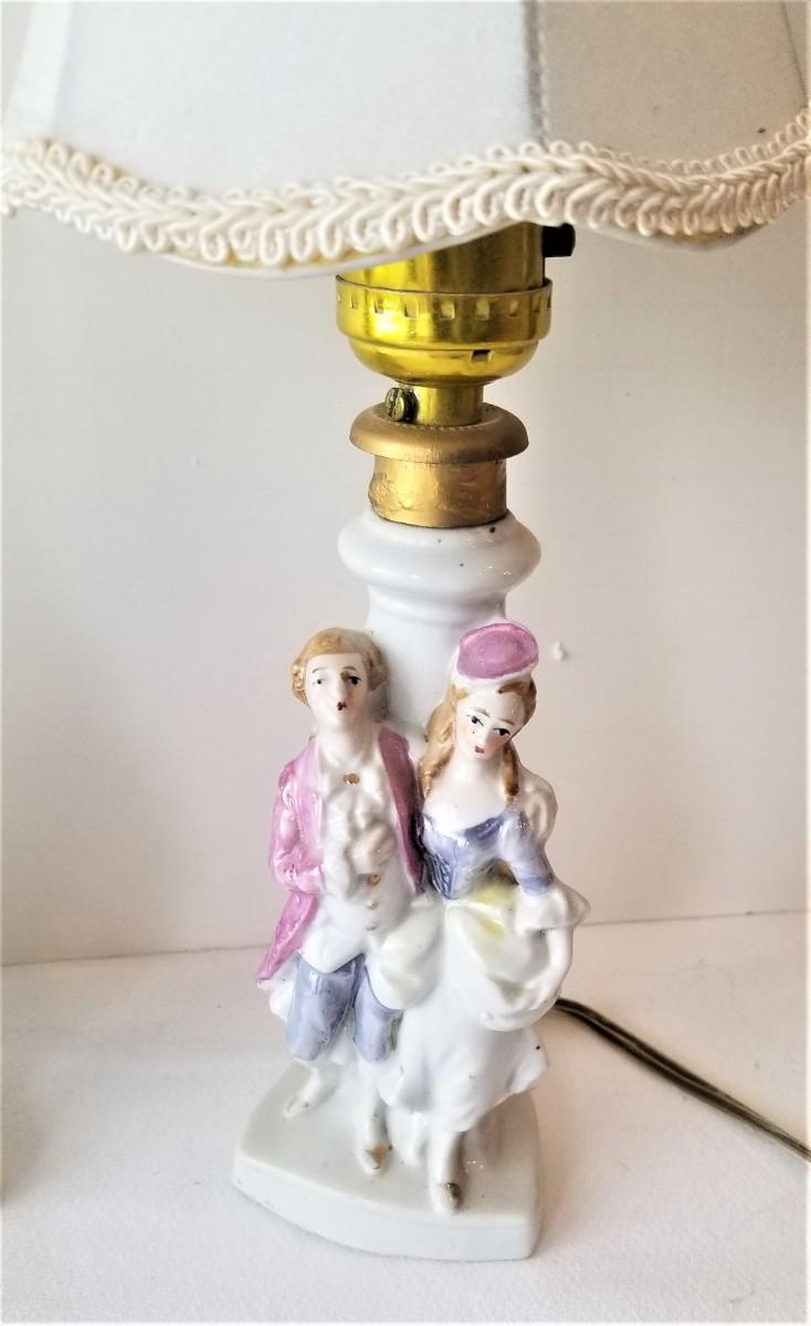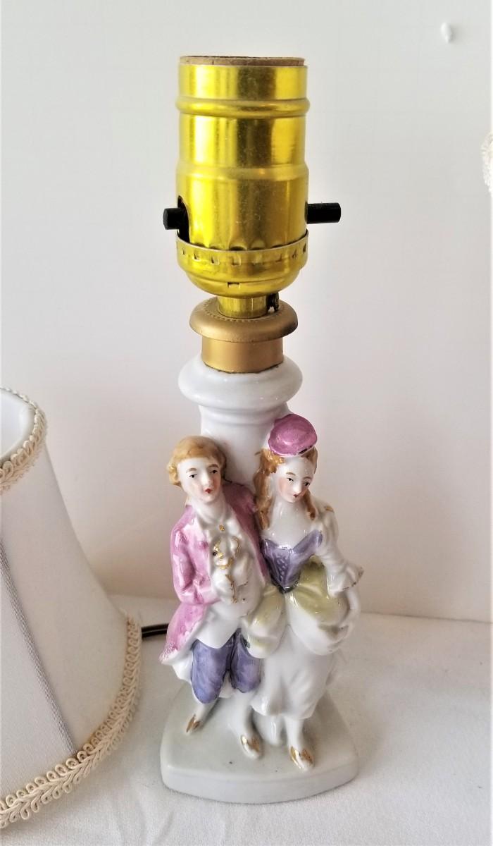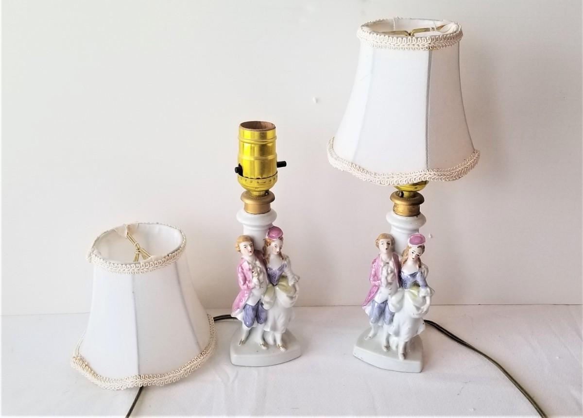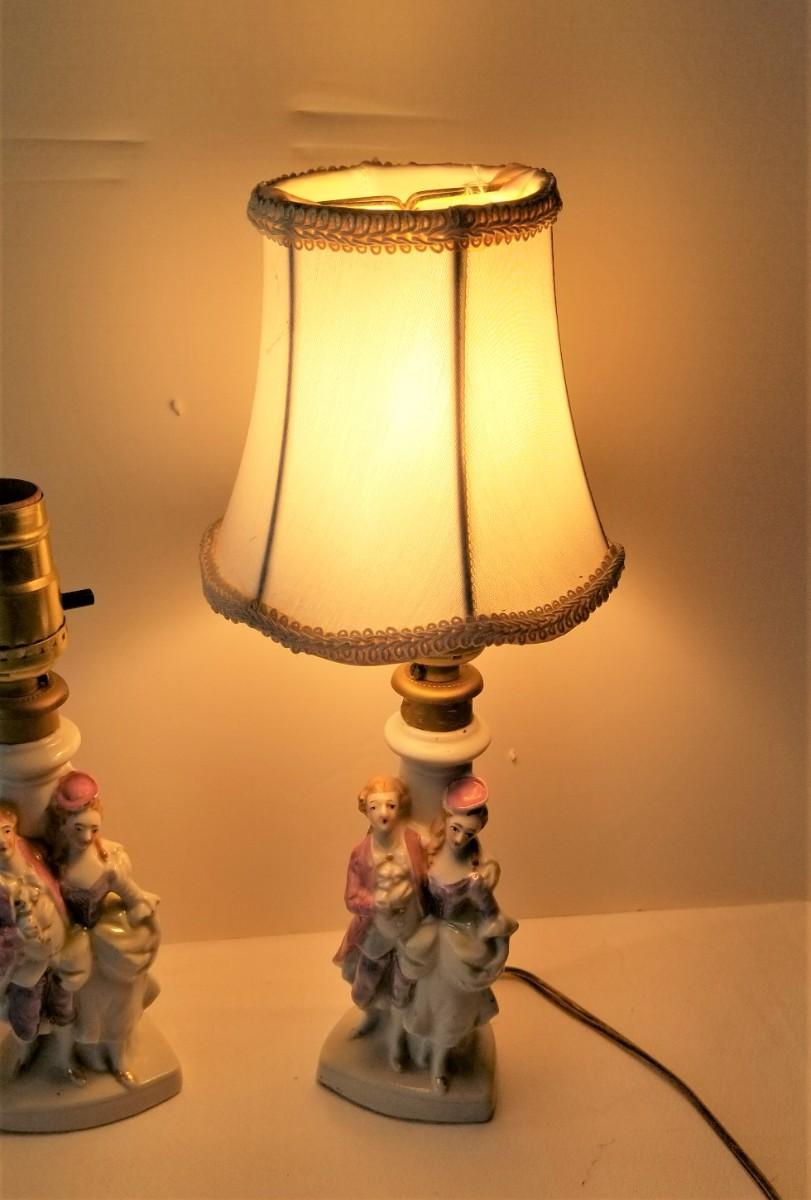 Cute pair of vintage ceramic boudoir lamps - working condition. Vintage plugs. Each is 12" tall with shade. These use chandelier bulbs.