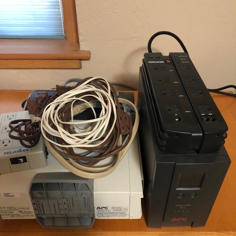 Large set of surge protectors, battery back up for computers, and various extension cords. Shipping available.