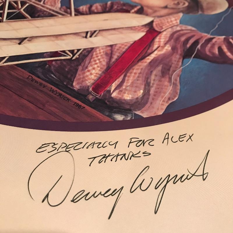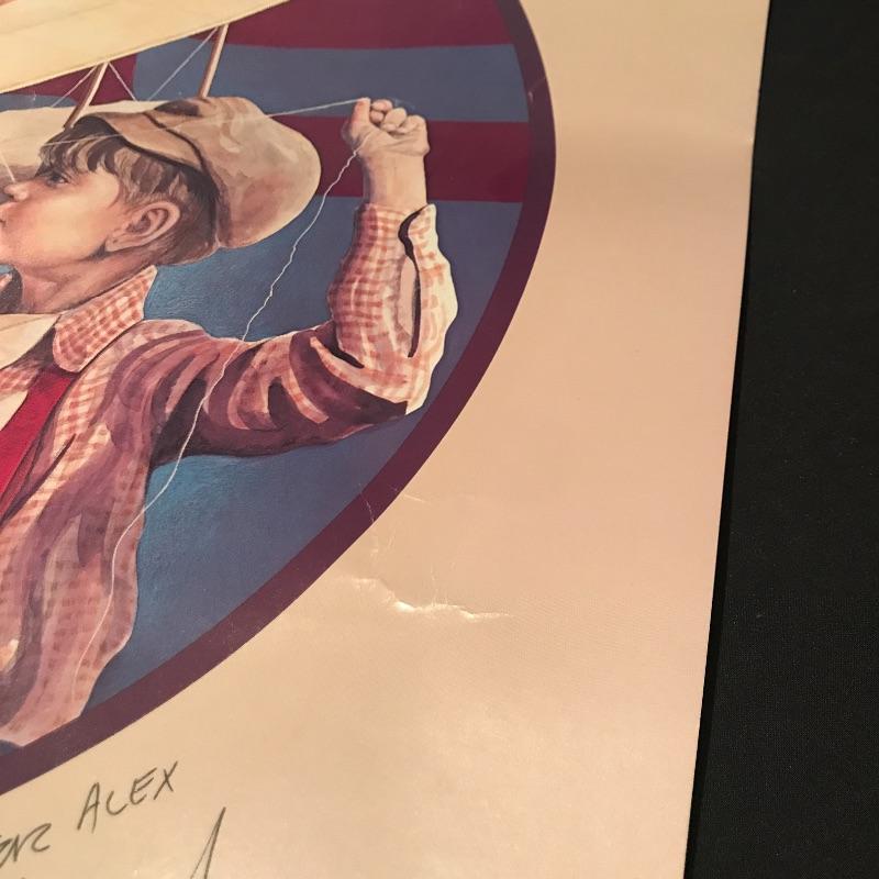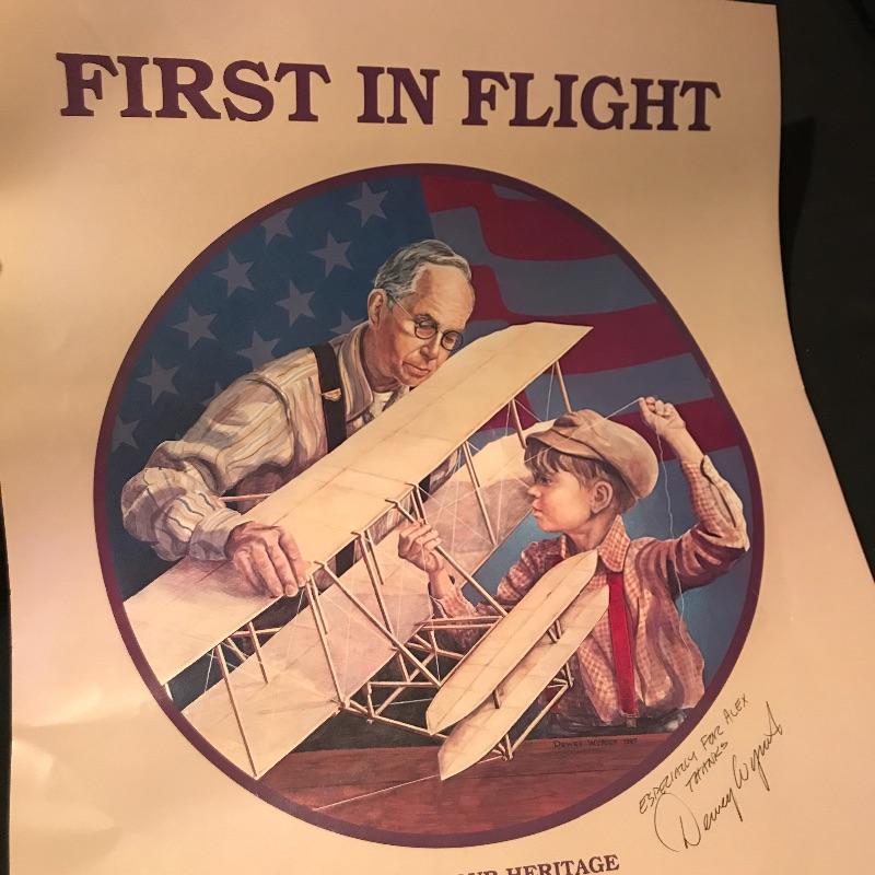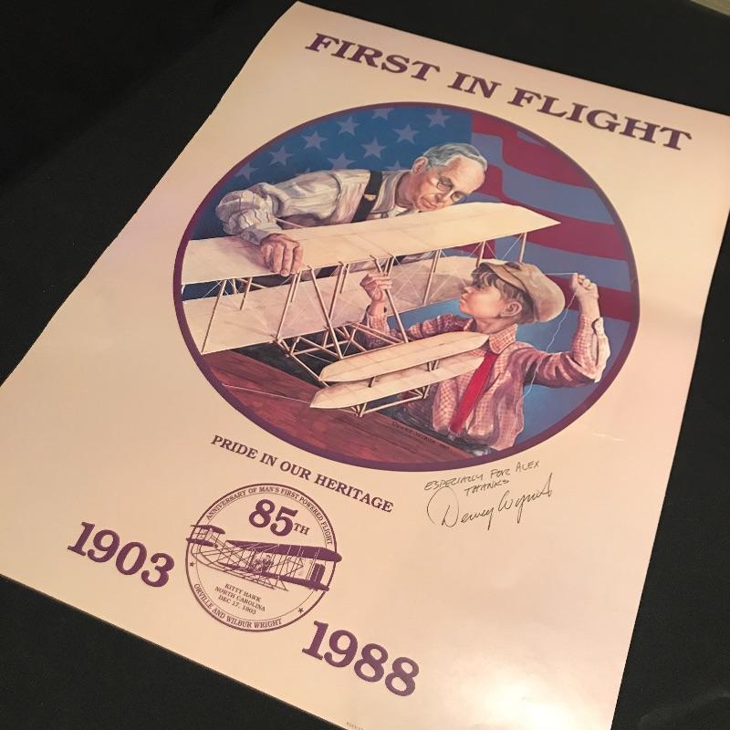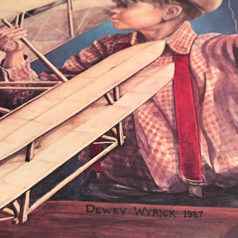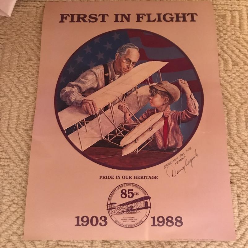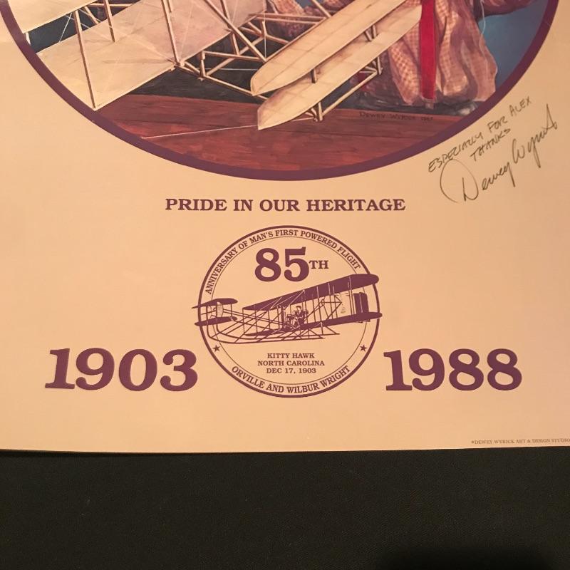 Poster artwork by Dewey Wyrick from 1987. This poster is unframed and depicts First in Flight on the 85th anniversary of the Wright Brothers Flight. Signed by the artist but no COA. Some small bends in paper 24” x 18” Shipping available.