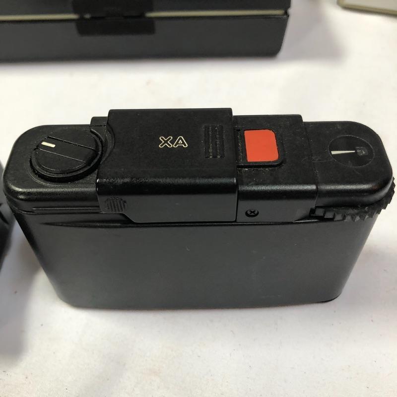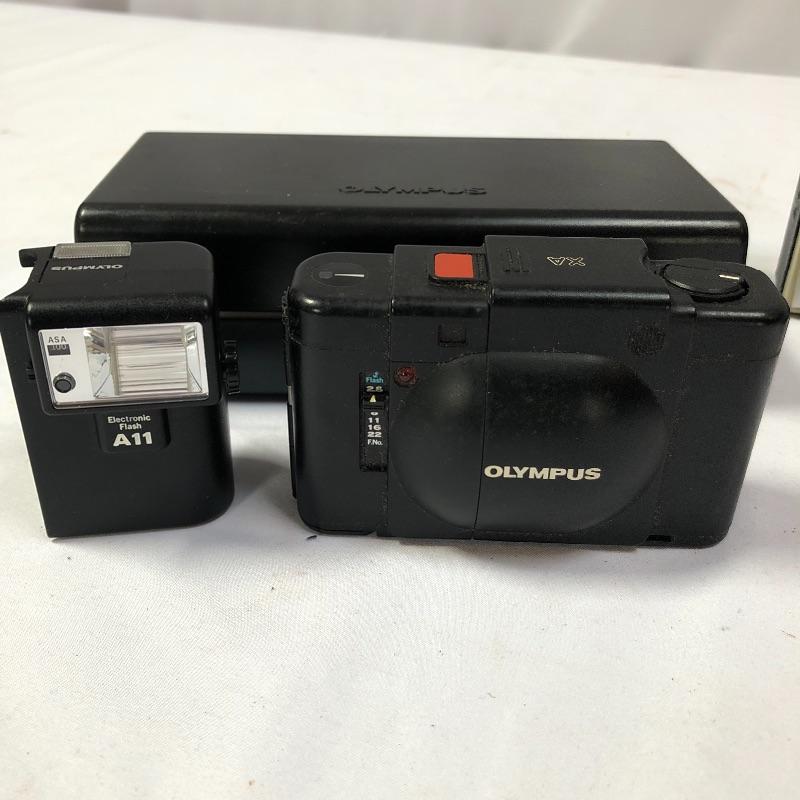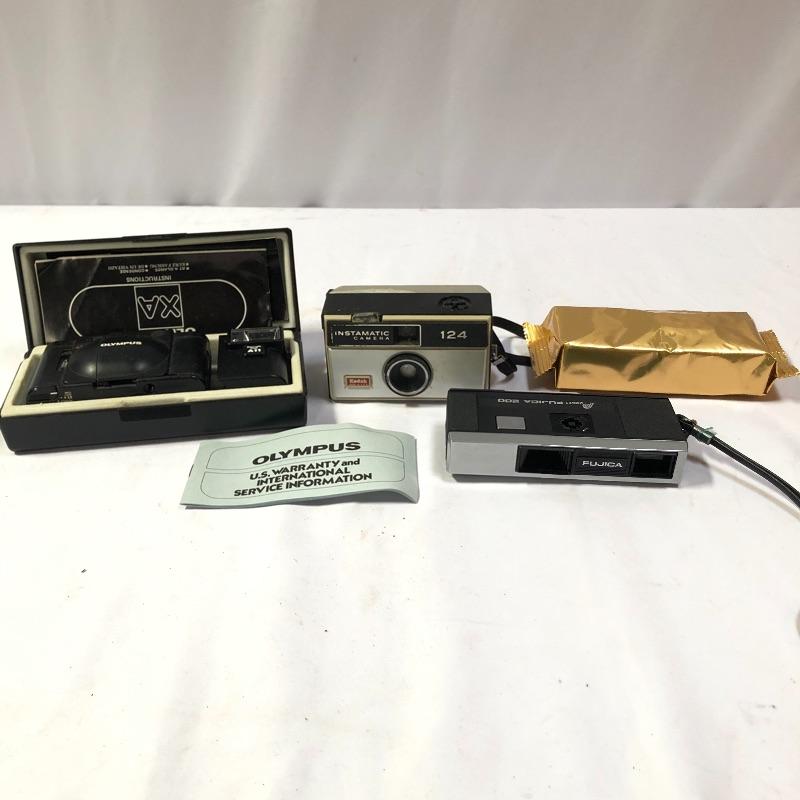 Four vintage cameras in this lot. The Olympus XA comes with original case, manuals and A11 electronic flash. The Kodak camera is a 124 Instamatic. Also included is a Fujica Pocket 200 and what appears to be a 4th camera in a sealed plastic pouch; we cannot say for sure what is inside.