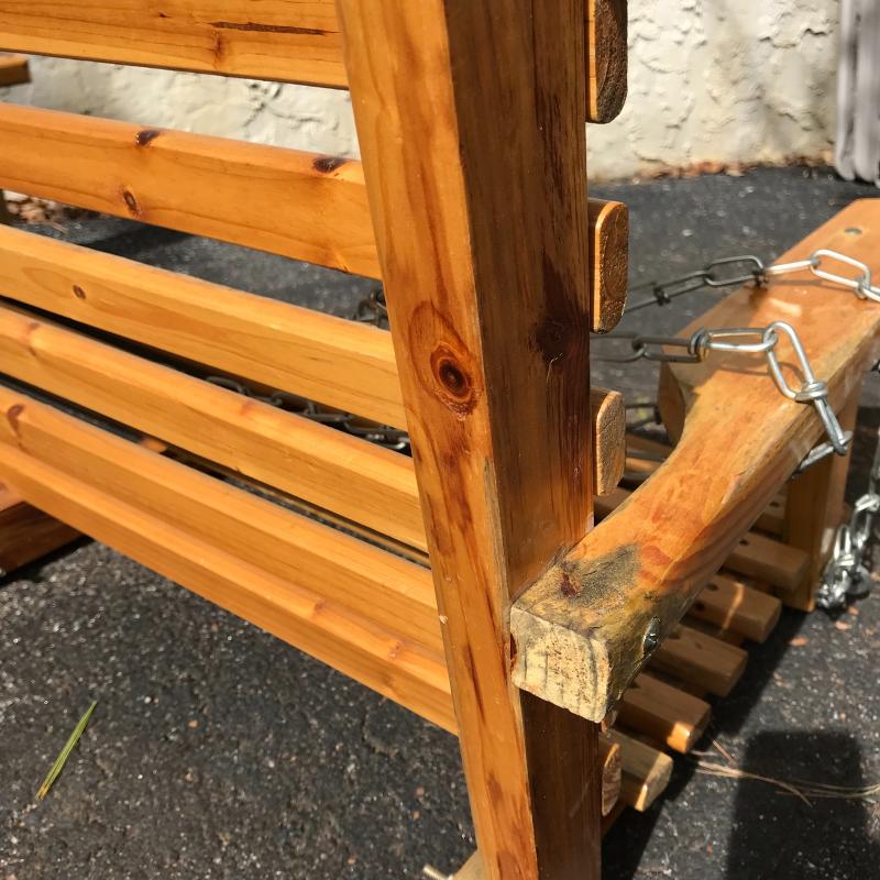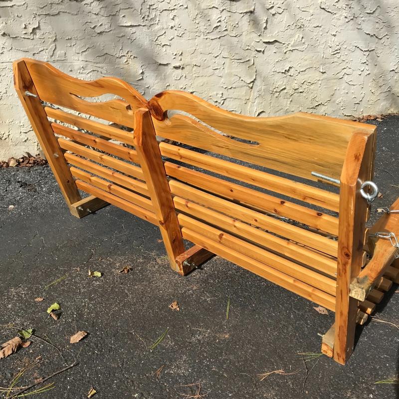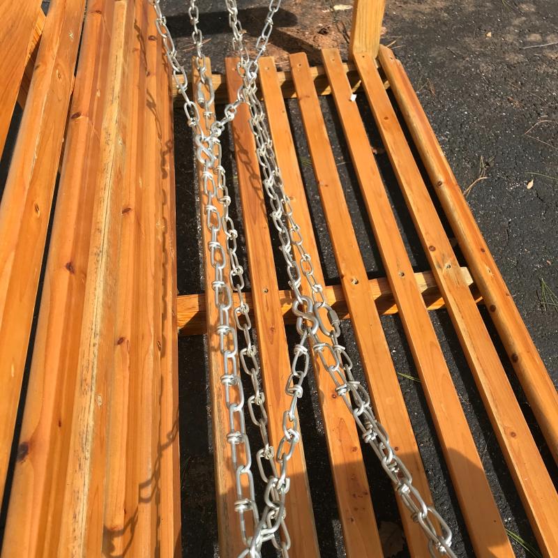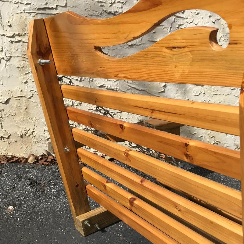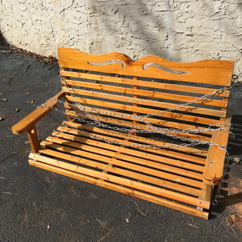 Gorgeous medium colored wooden porch swing with metal chains. Some wood is weathered in spots, but looks great overall. There is a little give in between the seat and back of swing, but it appears to be an easy fix. No shipping.