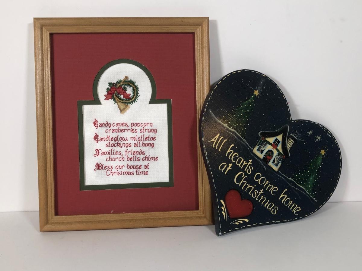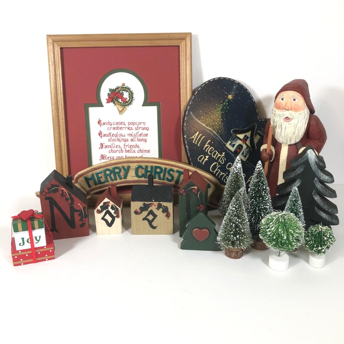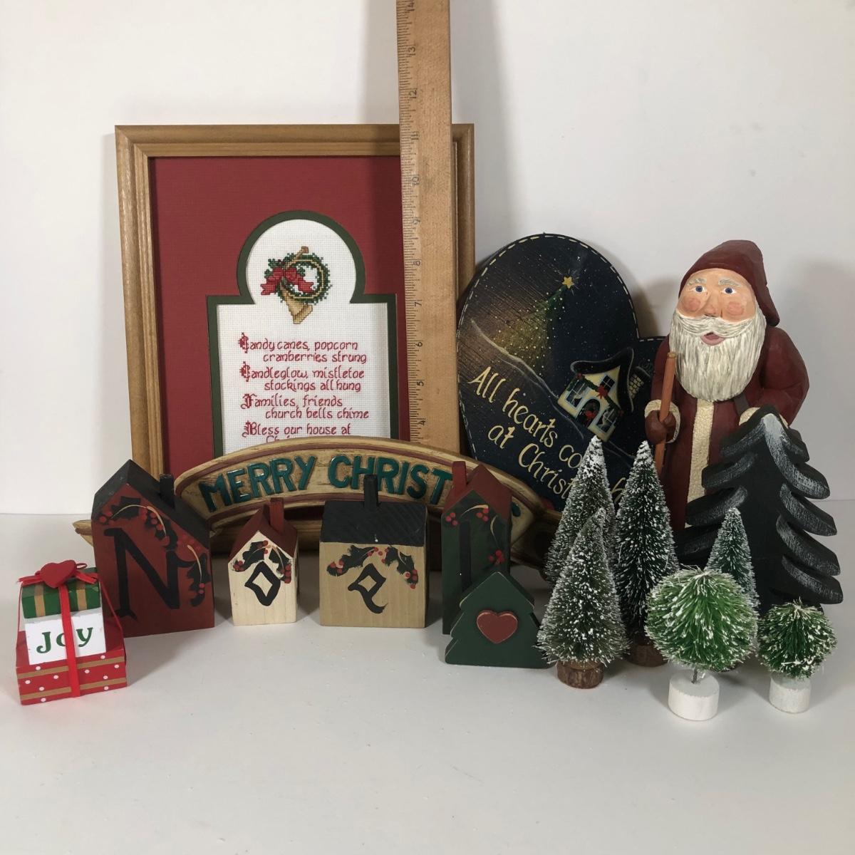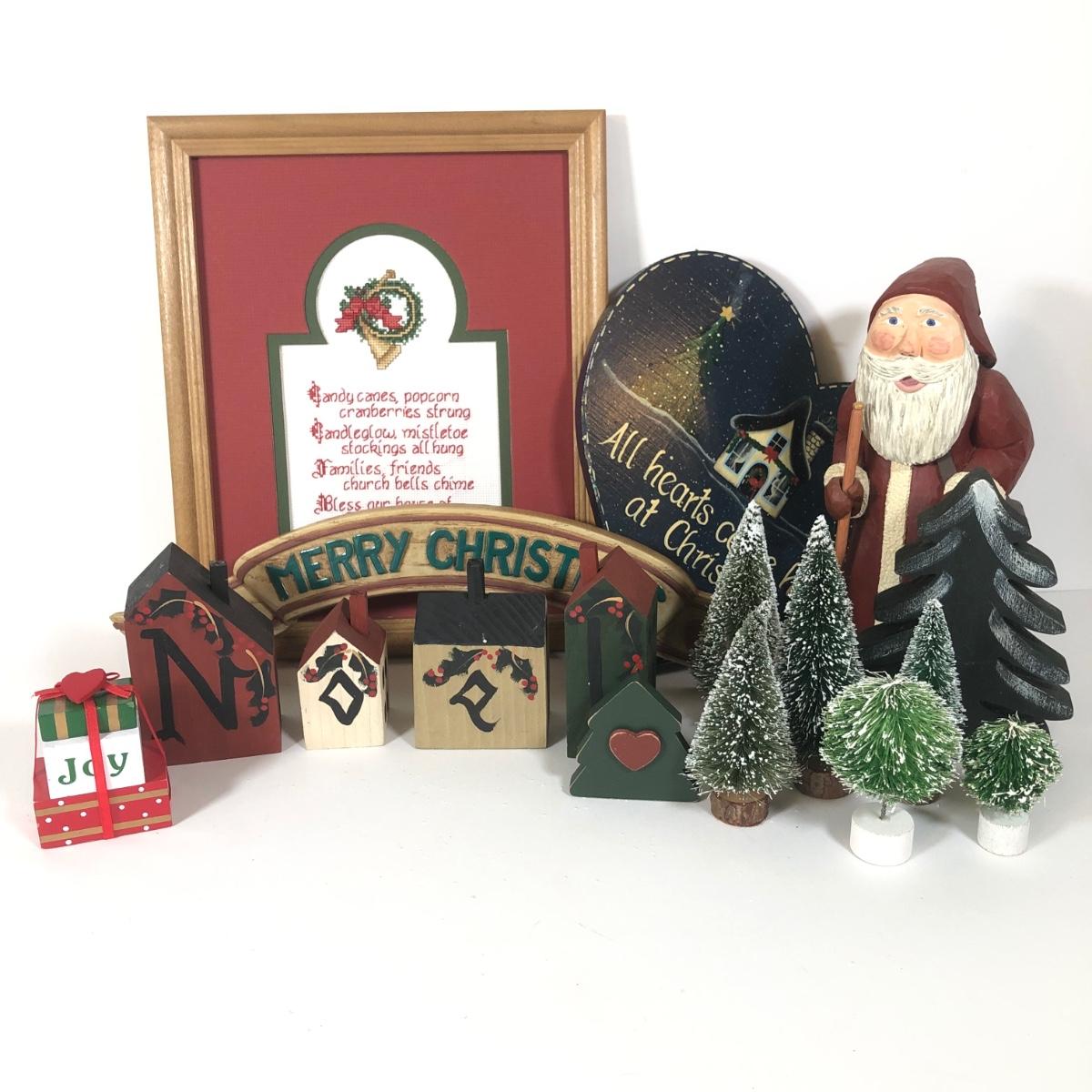 LOT 265L: Vintage Wooden Christmas Decor, Framed Cross Stitch & Bottle Brush Trees