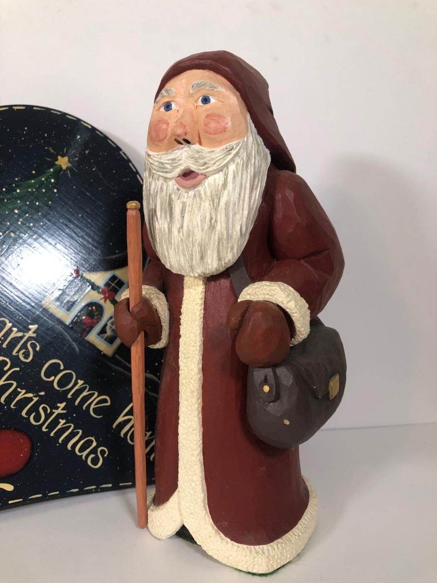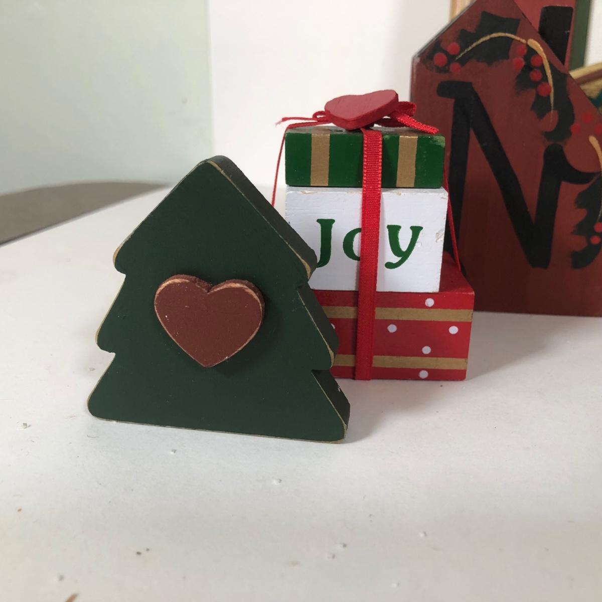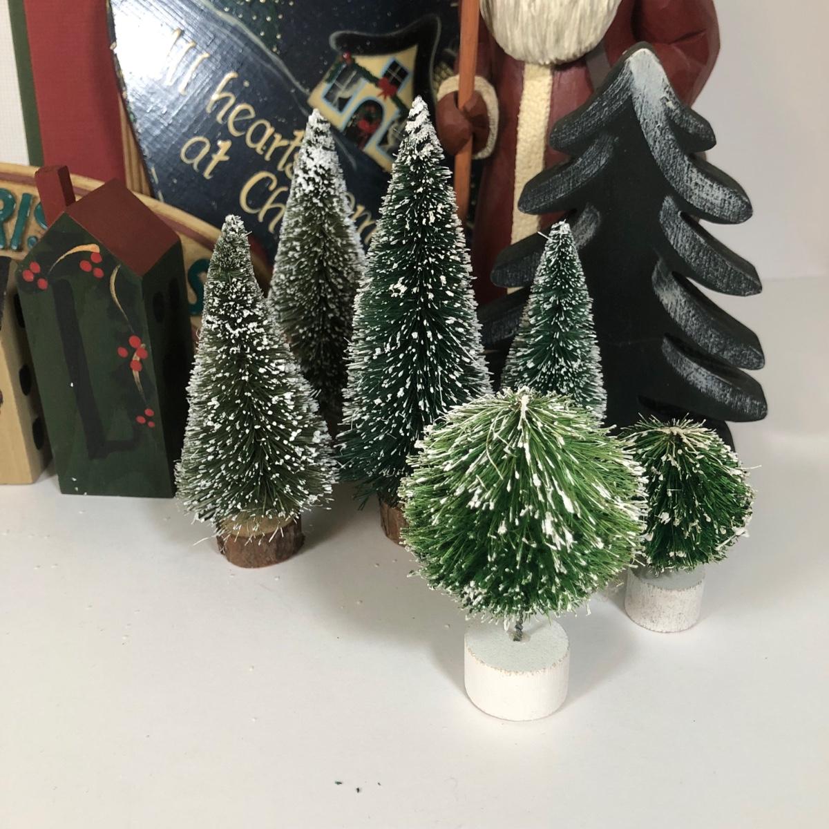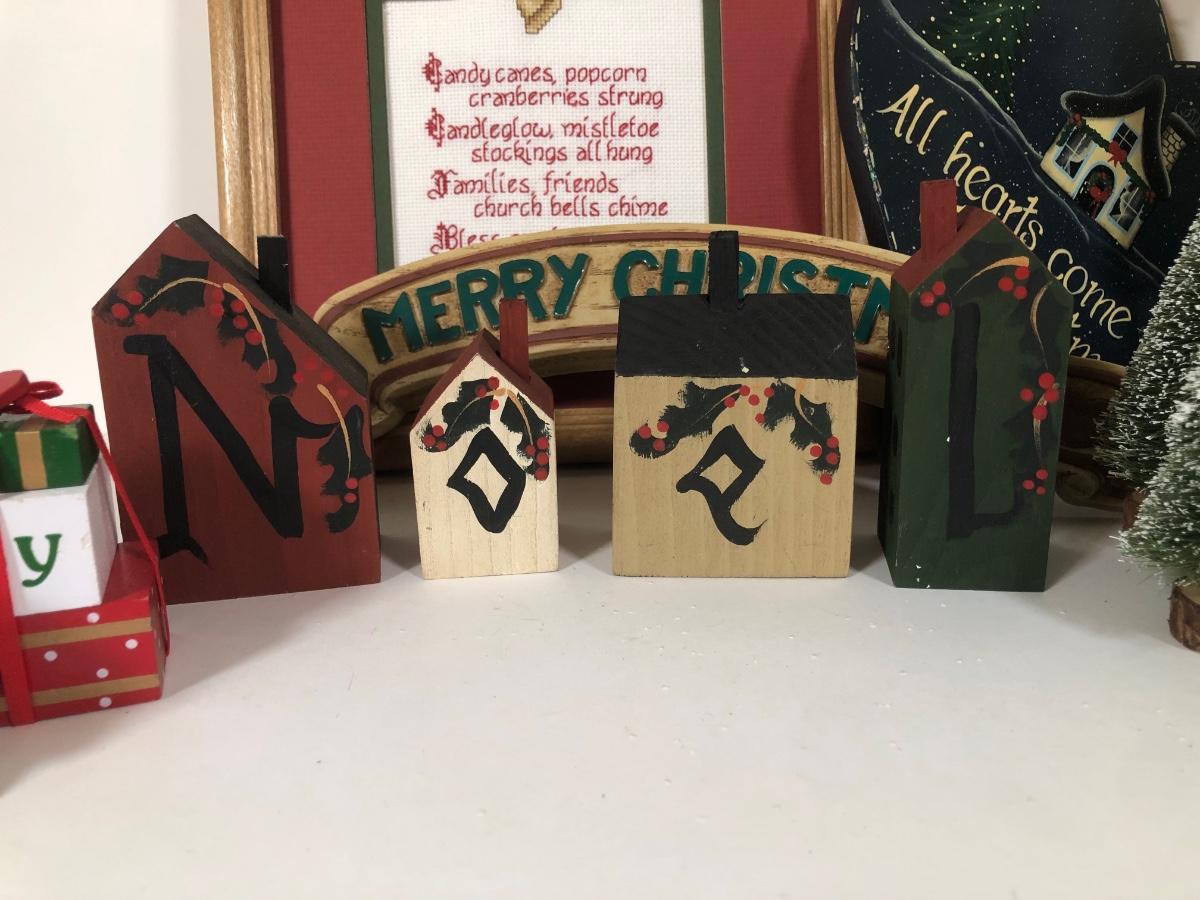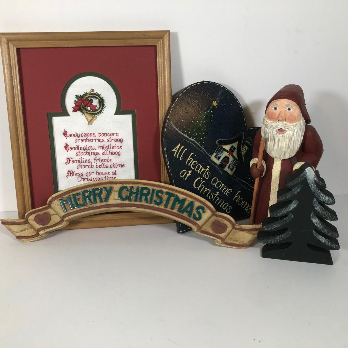 LOT 265L: Vintage Wooden Christmas Decor, Framed Cross Stitch & Bottle Brush Trees
