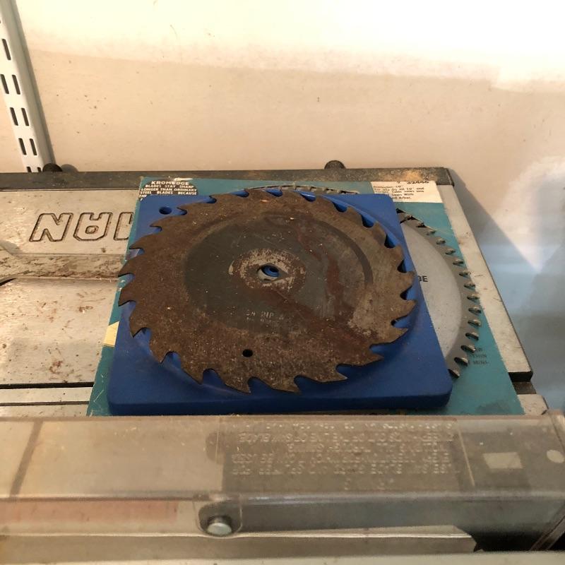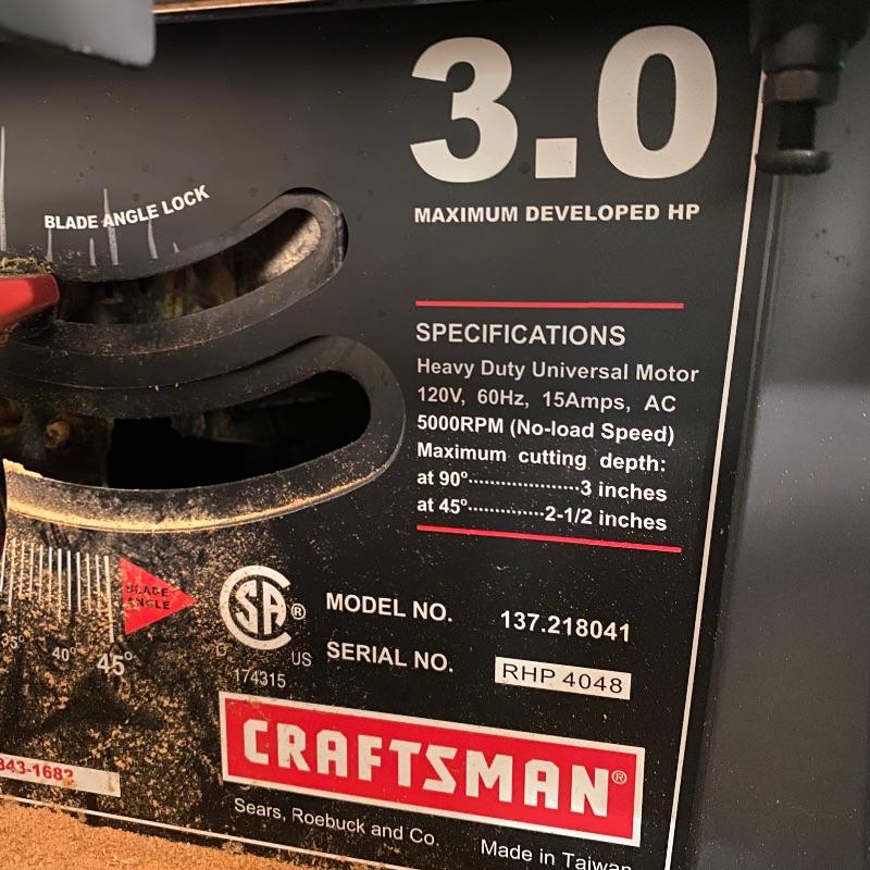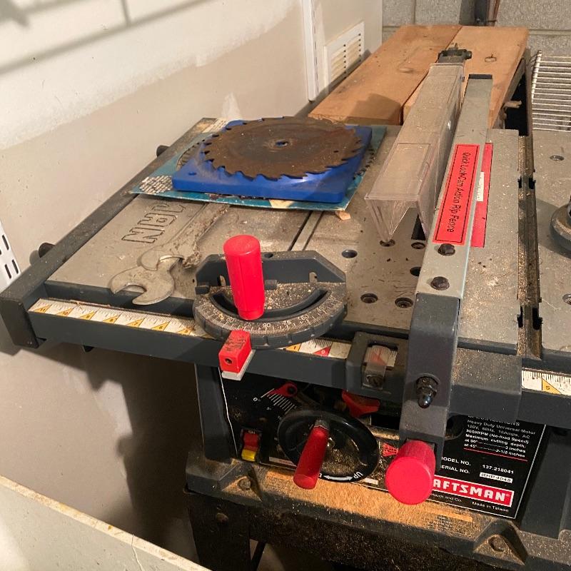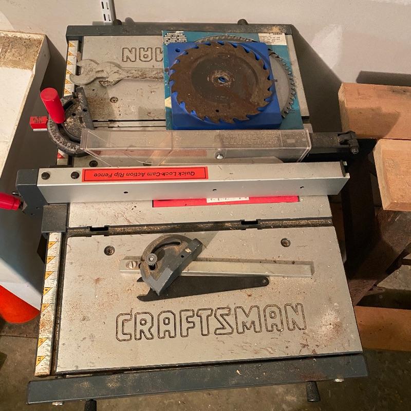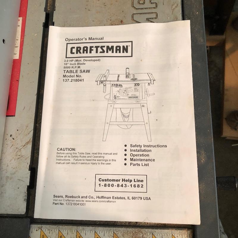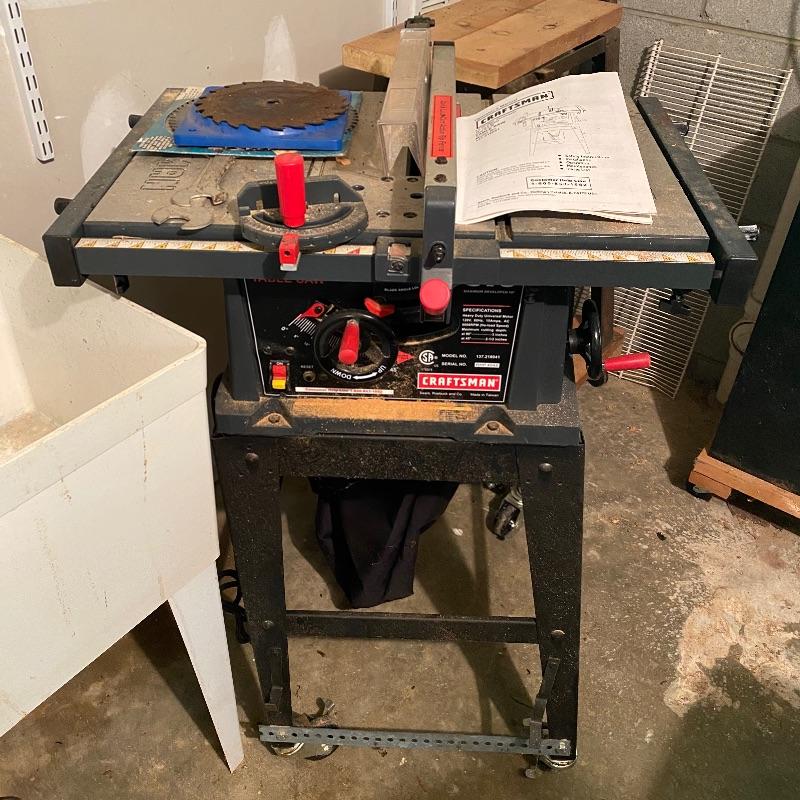 This lot includes a Craftsman table saw on a metal material rolling trolly and an owners manual. Table (including trolly) measures 41” tall. Local pick up only.