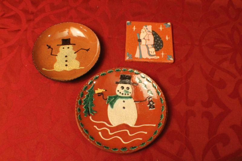 LOT #266: (2) Turtlecreek Potteryâ„¢ Snowman Plates & (1) Unknown Maker Santa Tile