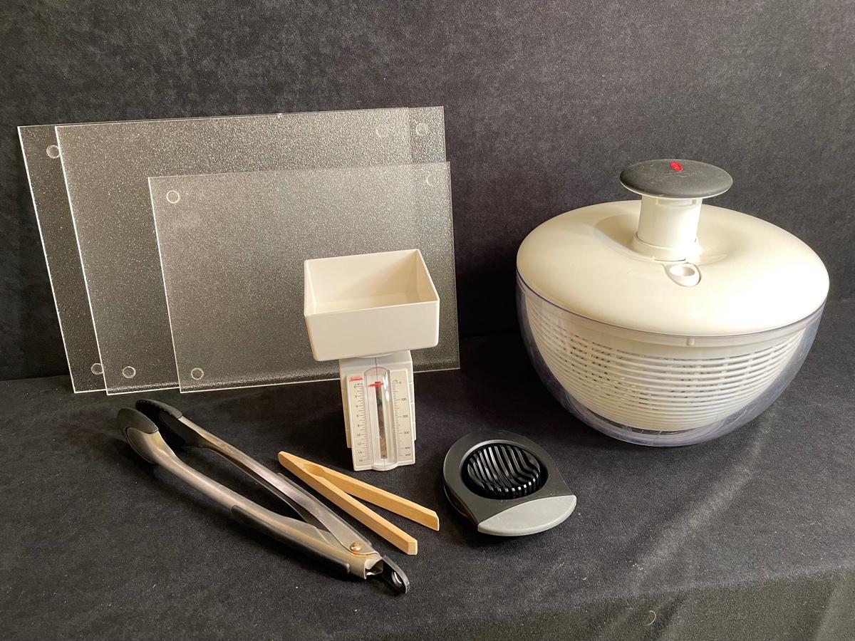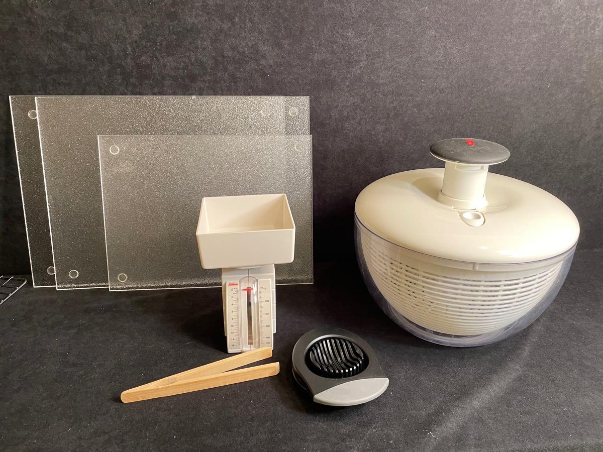 Three glass cutting boards, salad spinner, food scale, egg slicer and bamboo tongs