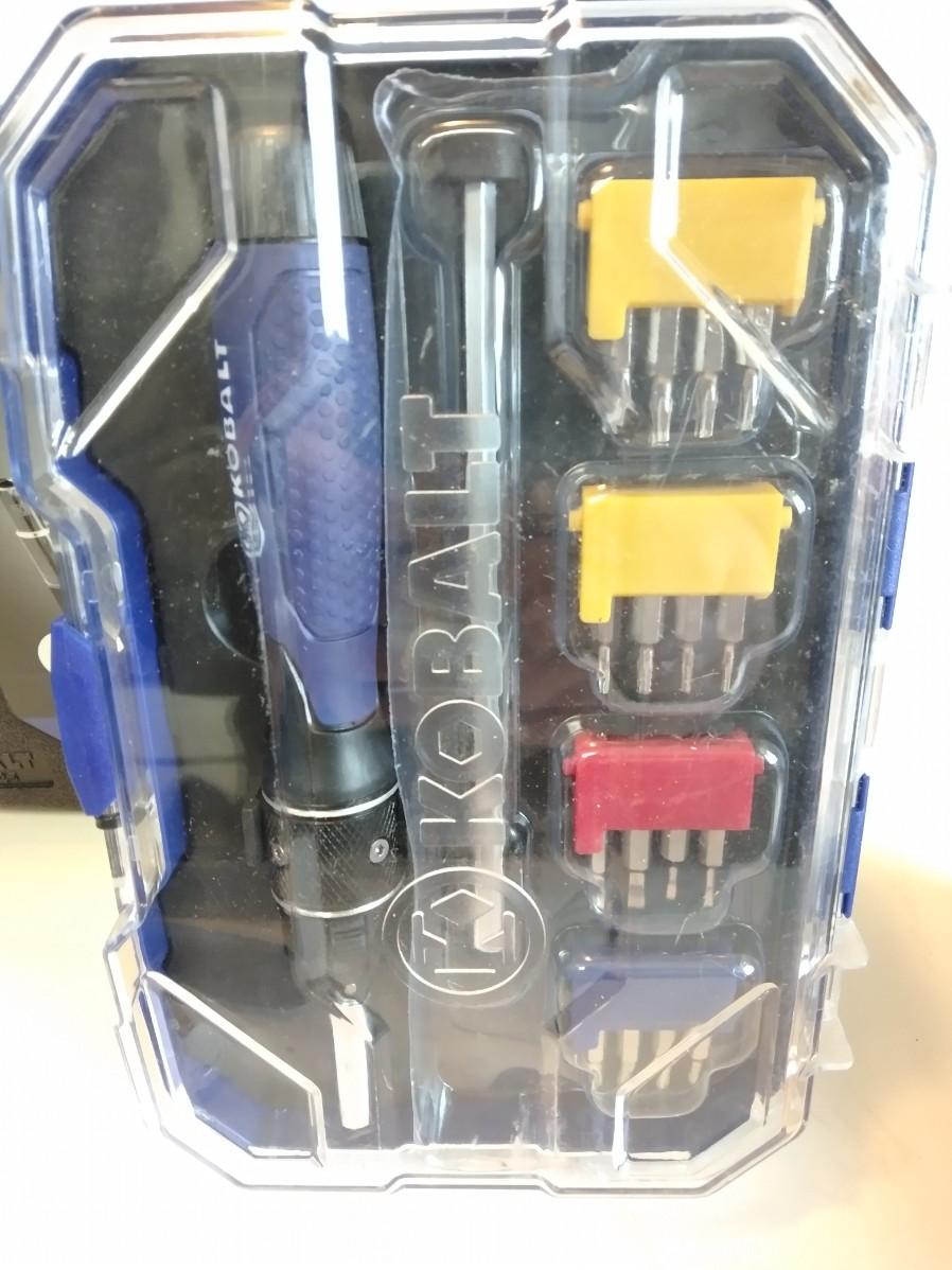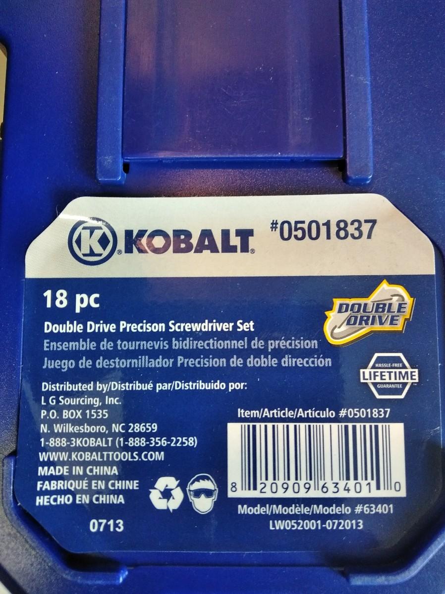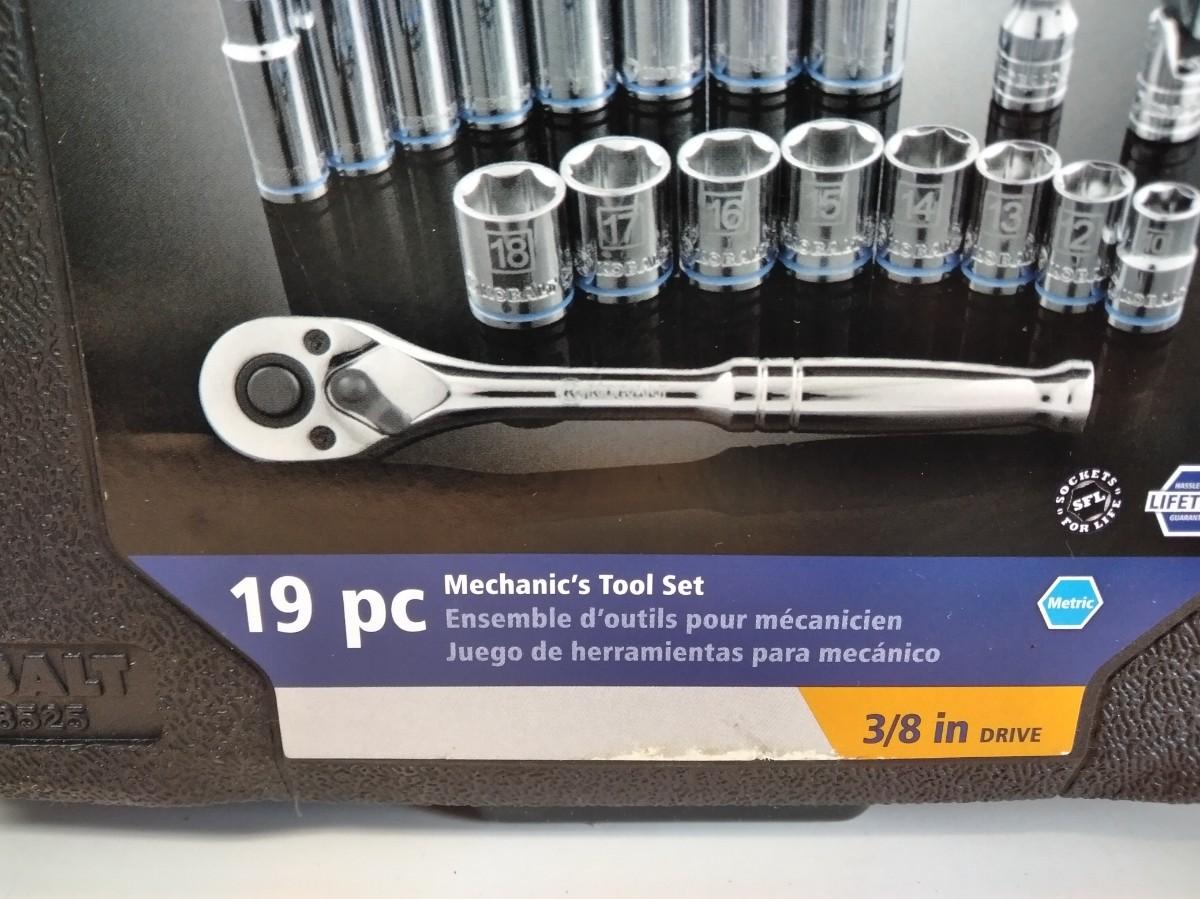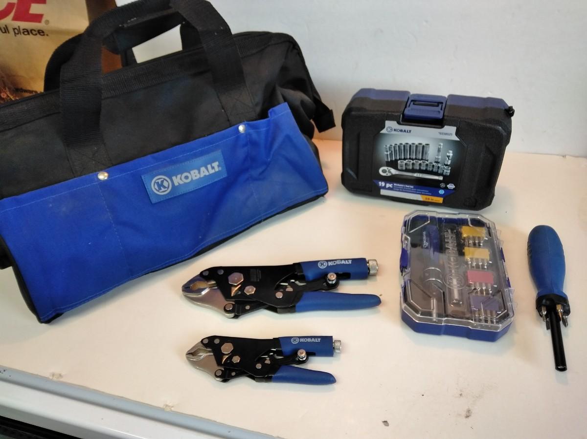 18 IECE DOUBLE RIVE PRECISION SCREWDRIVER SET, 19 PIECE MECHANICS TOOL SOCKET SET, KOBALT TOOL BAG, AND SOME PLIERS.