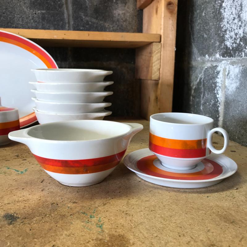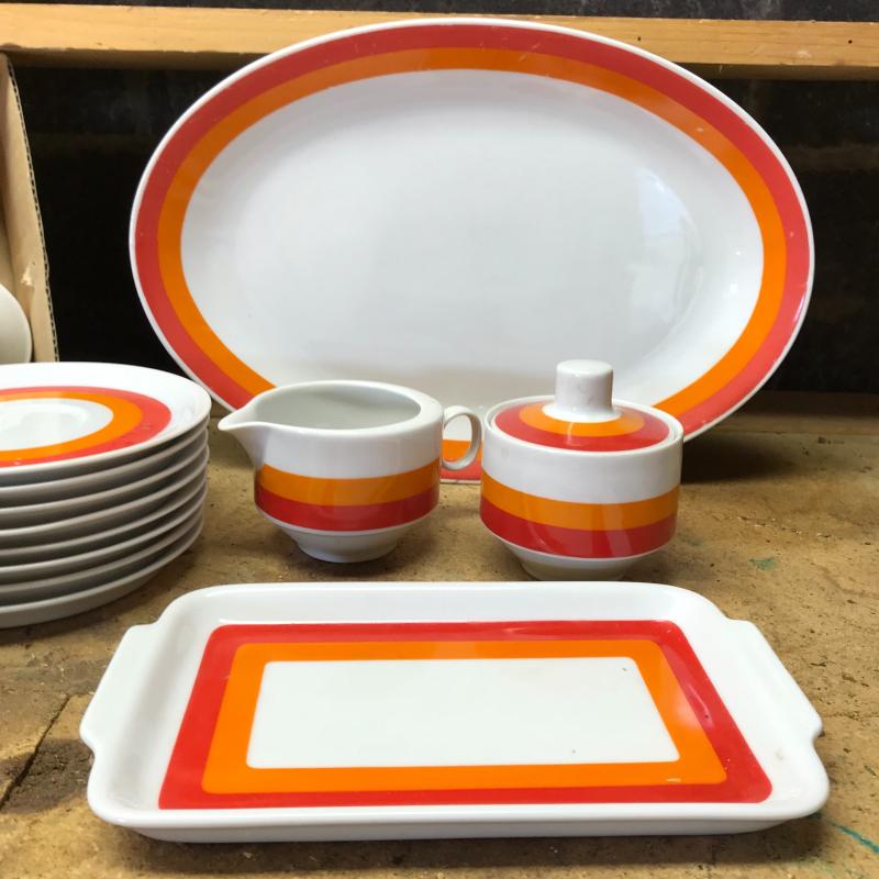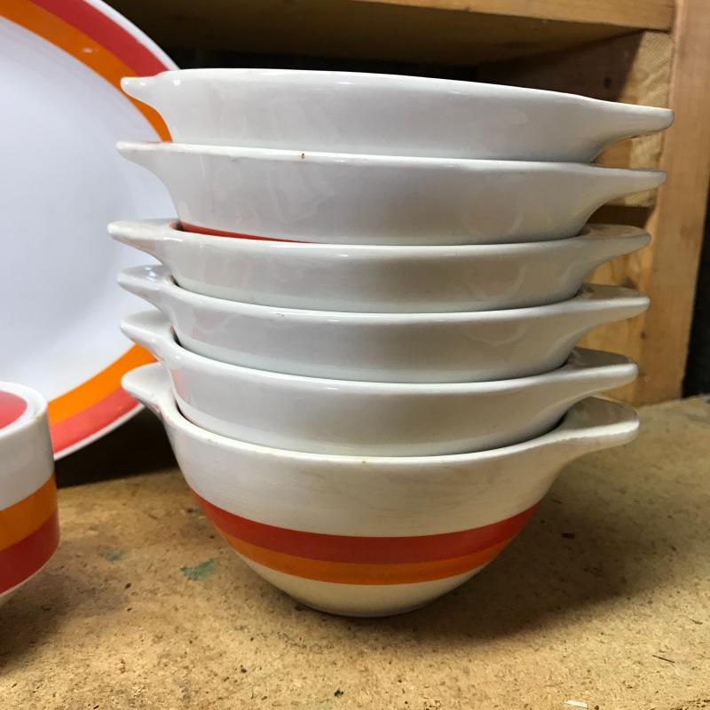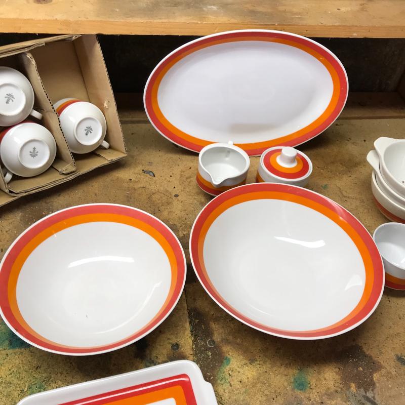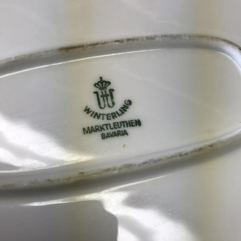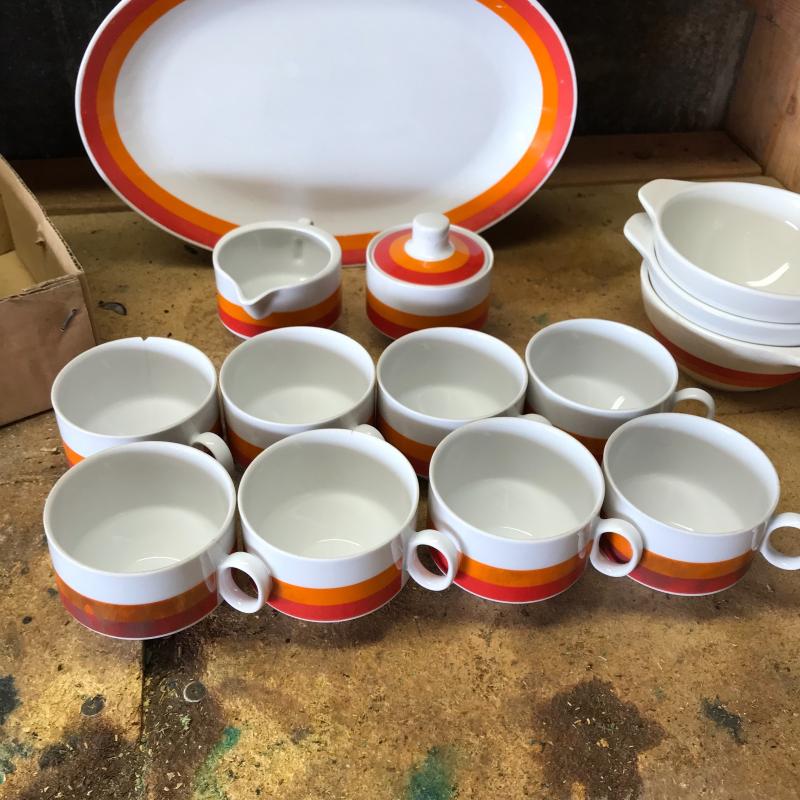 Simple and fun! What a great personality addition to any party! Eight mugs and nine saucers, sugar, creamer, six dining bowls and two serving bowls. Lot also includes a small rectangle plate and larger oval platter measuring 13” x 9”. Moderate crackling and discoloring in some dishes and a couple chips, see photos. All dishes are Bavarian Winterling except the dining bowls which have a Moulin Des Louis France stamp. Shipping available.