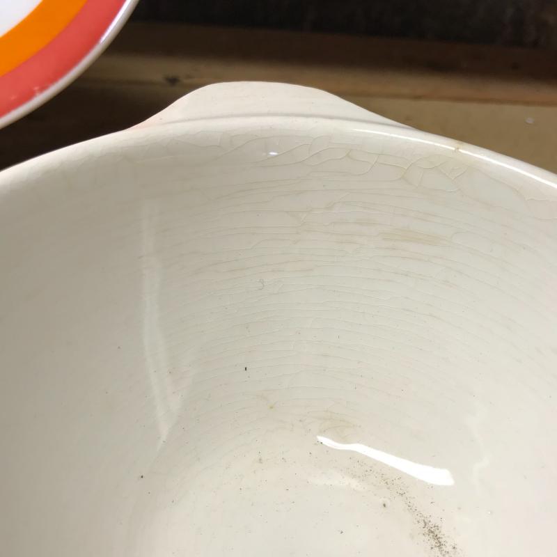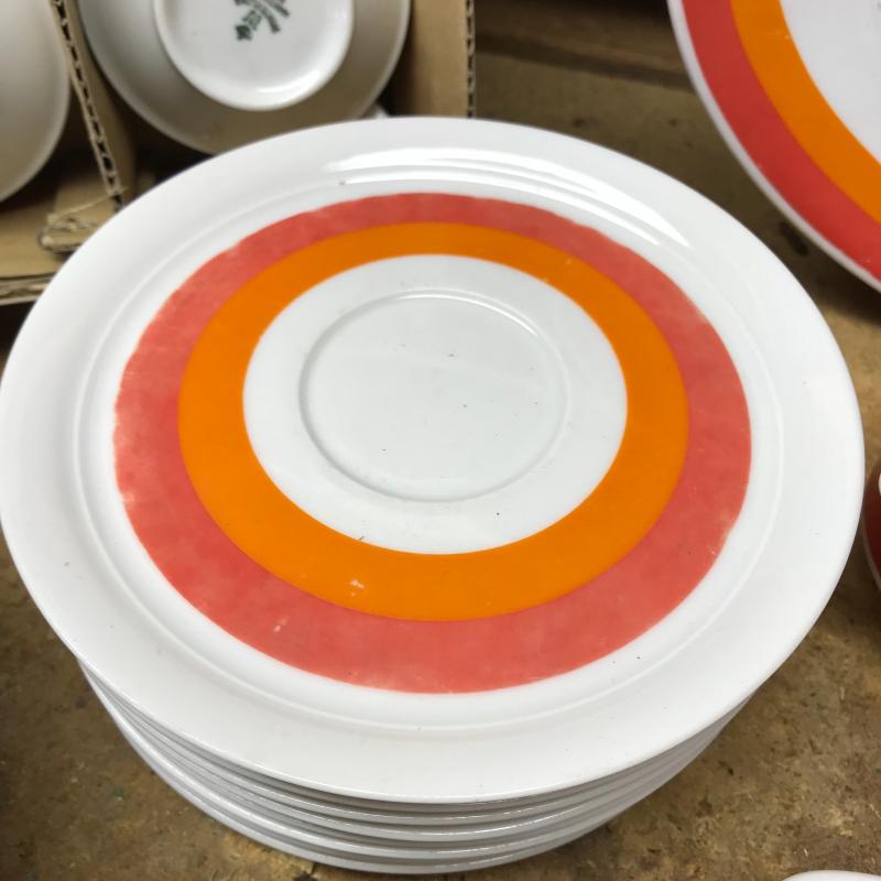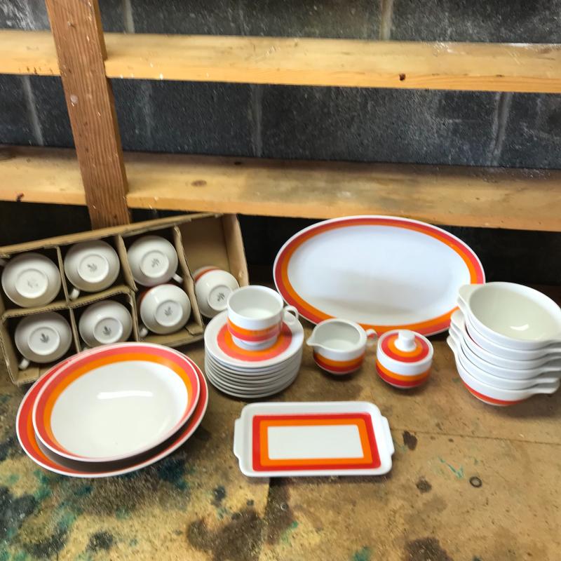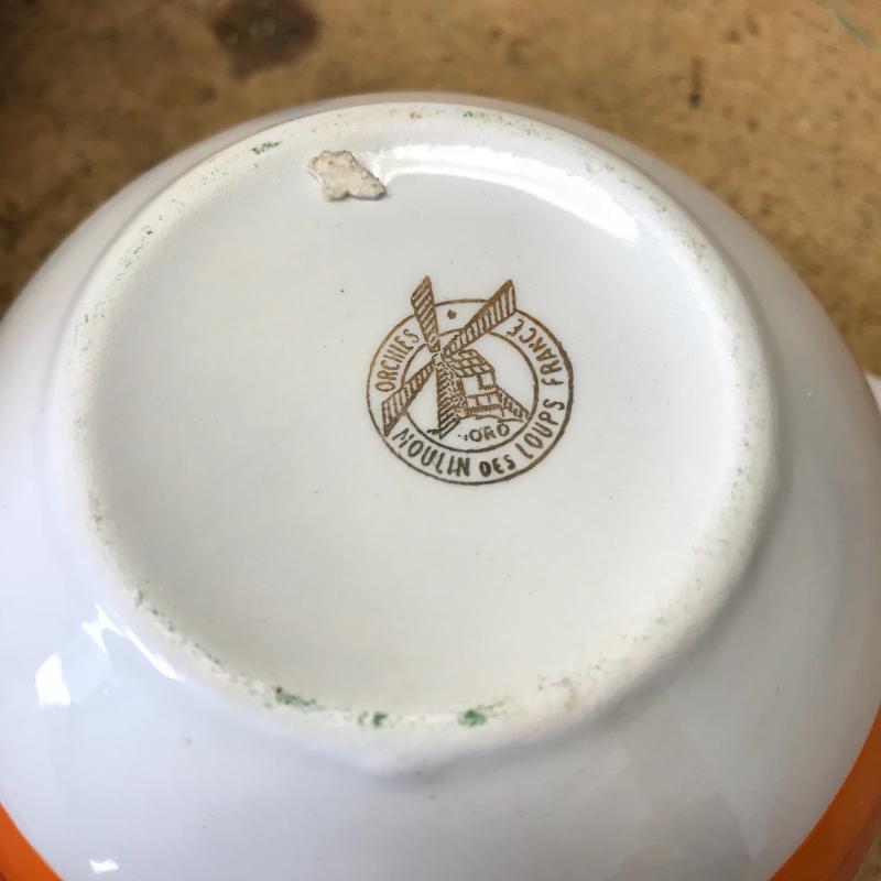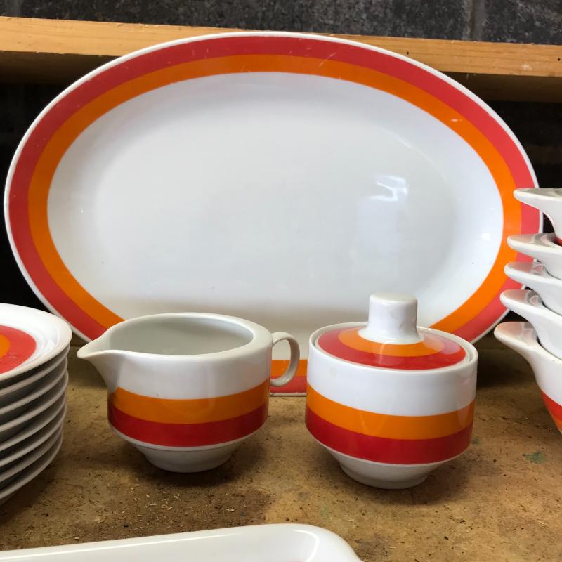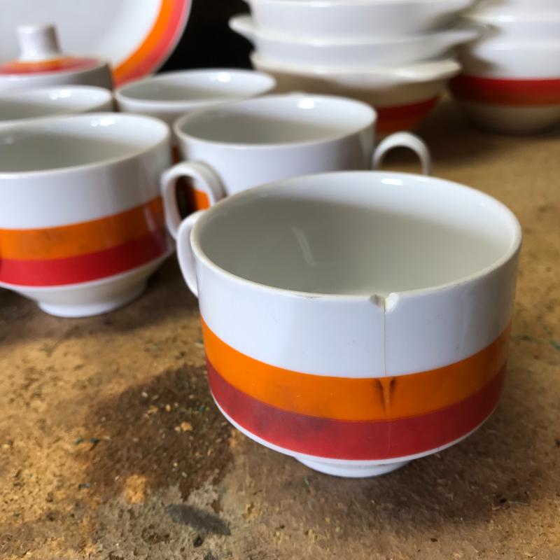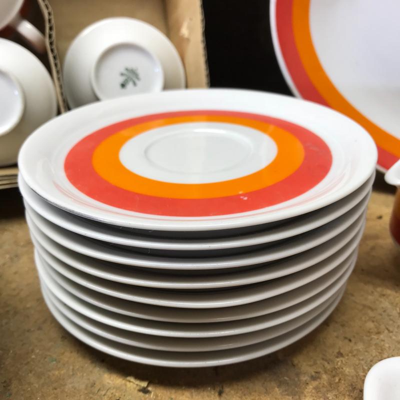 Simple and fun! What a great personality addition to any party! Eight mugs and nine saucers, sugar, creamer, six dining bowls and two serving bowls. Lot also includes a small rectangle plate and larger oval platter measuring 13” x 9”. Moderate crackling and discoloring in some dishes and a couple chips, see photos. All dishes are Bavarian Winterling except the dining bowls which have a Moulin Des Louis France stamp. Shipping available.