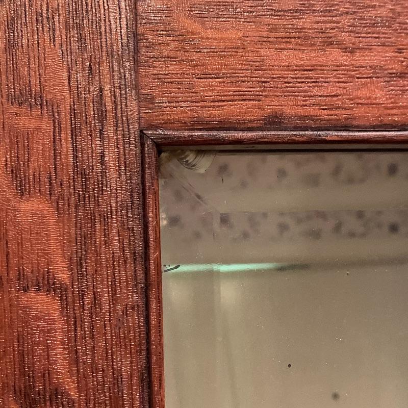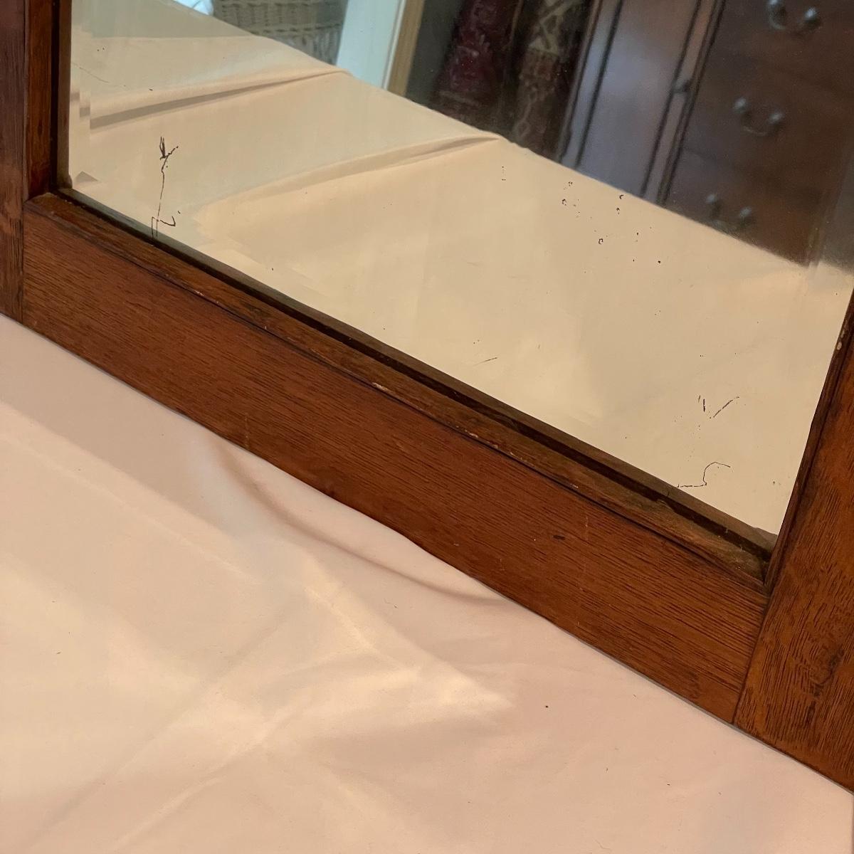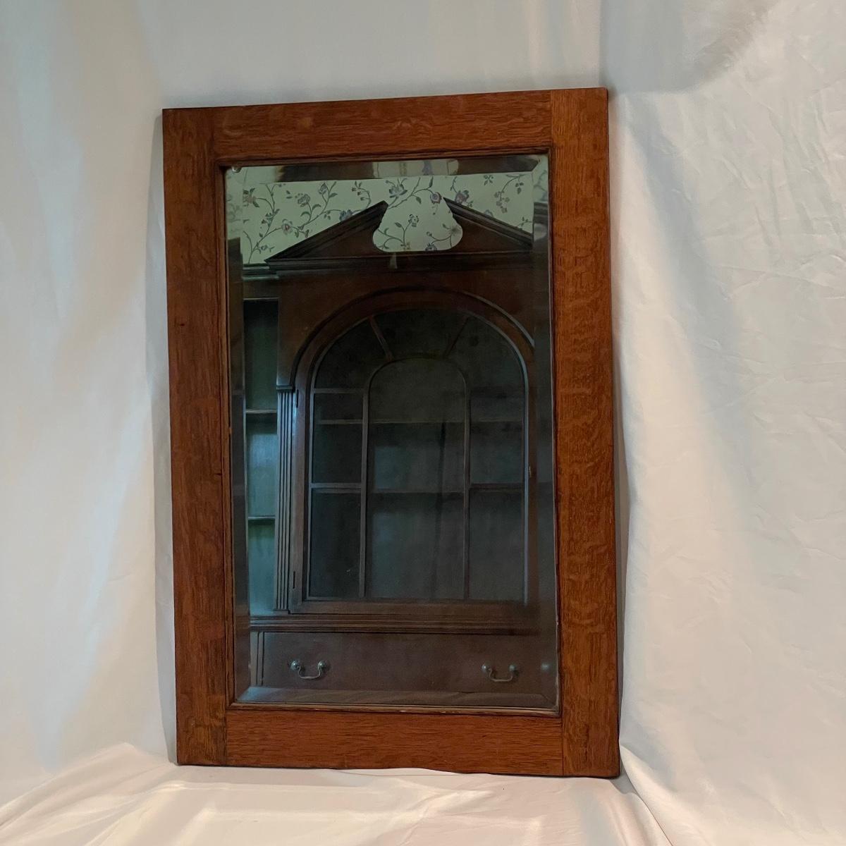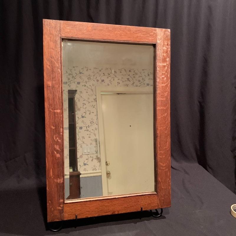 This mirror comes in a beautiful and sturdy varnished wooden frame. The mirror is beveled. It has a few blemishes, but none that distract from the loveliness or functionality of the mirror. The frame measures 21.25” x 31.5”. It is quite heavy. There is a strong rope attached to the back for hanging on the wall. Shipping available, but understand this item is heavy. Please call UPS with dimensions at 828-252-6930 for a quote prior to bidding.