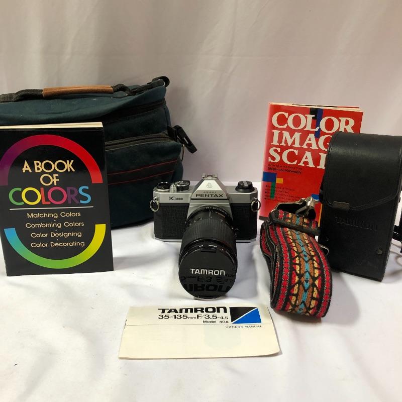 This vintage Pentax camera comes with a 35-135mm Tamron lens and it’s case. Also included is a camera case, nice camera strap and a couple of camera related books.