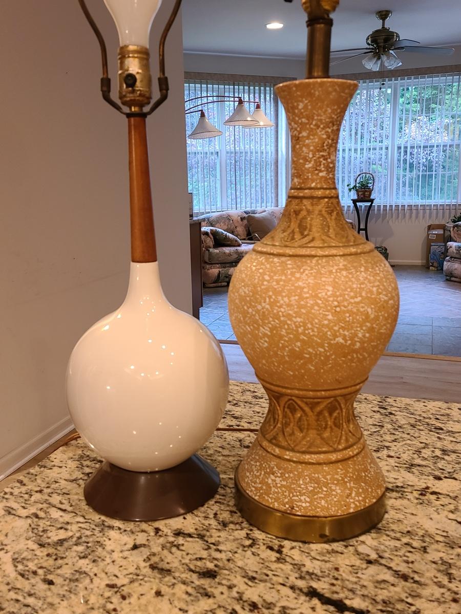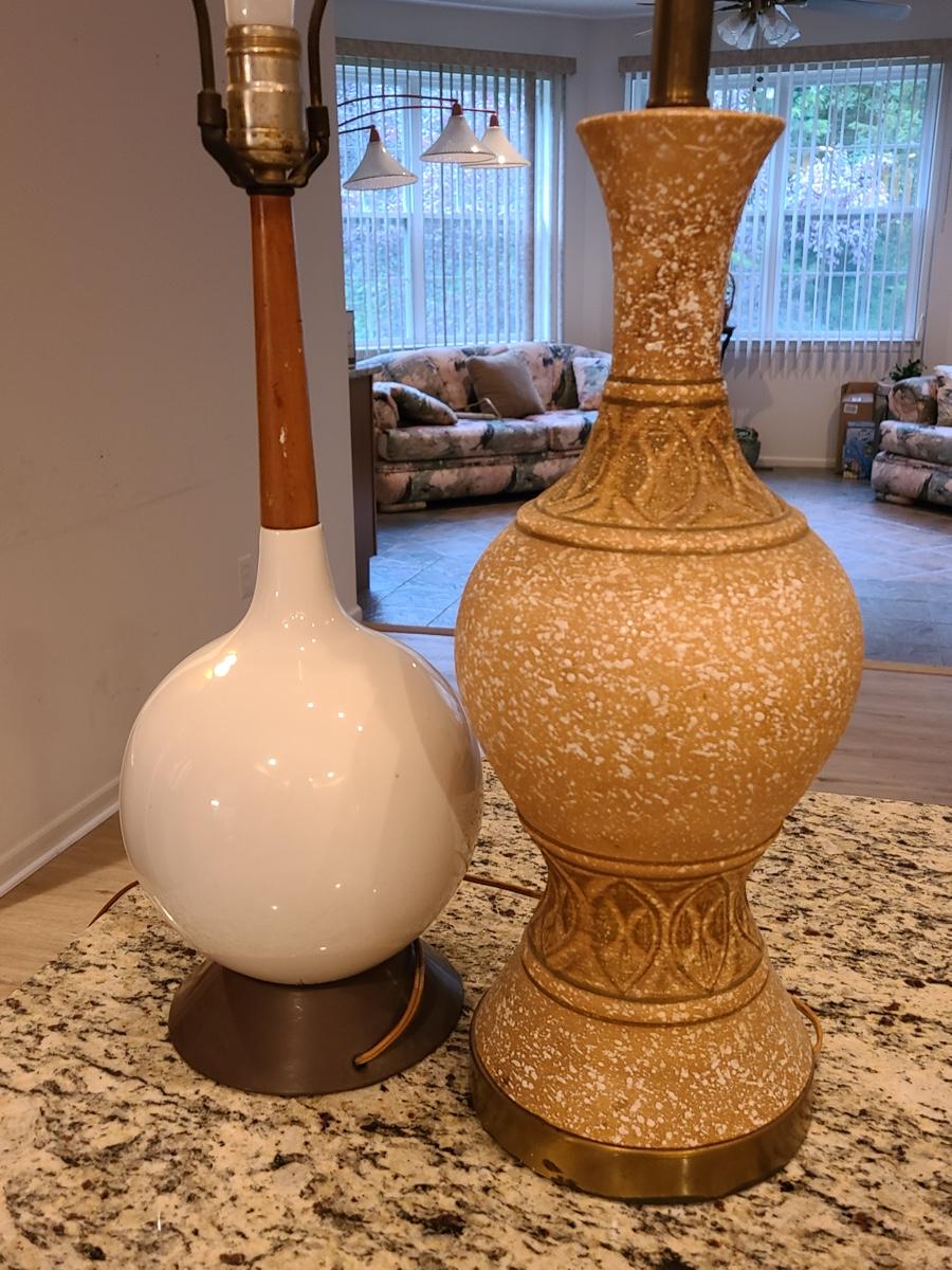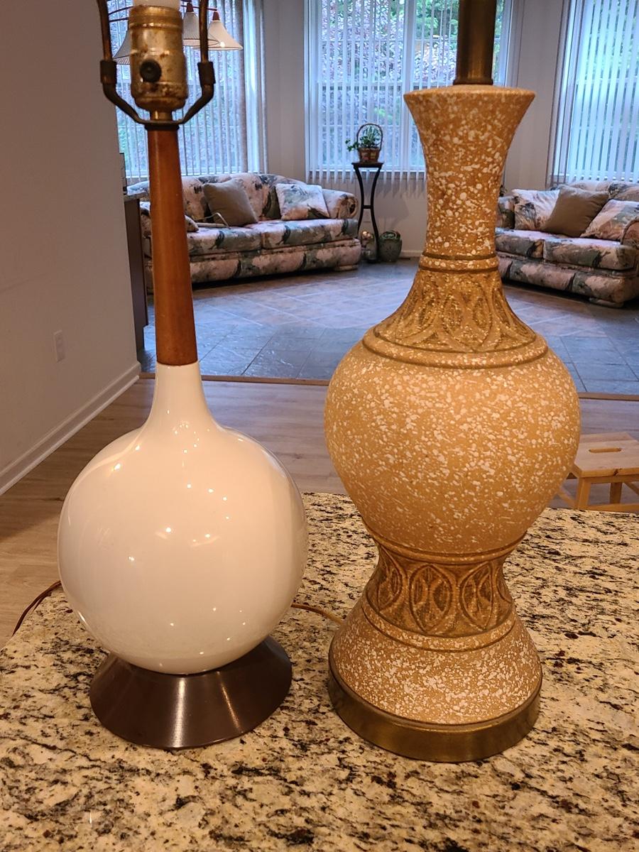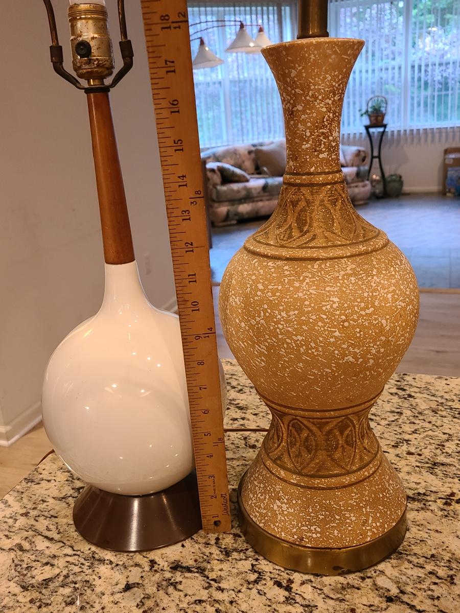 These two unique vintage lamps show style while being functional. They do not come with shades. They both work great. The white bulb, with teak arm, has a metal base. The other is pottery. Please see all pictures as they are the best representation of the items. The pictures show condition, measurements if taken, and what is included in the lot. Due to the large amount that we photograph and the time frame, we are not always able to take measurements. All items unless noted, are pre-owned and have been used. If you purchased furniture, you must bring help. We do not allow one person to carry large furniture out on their own. Bring help, tools and a truck for the safety of our client’s homes, and your personal safety. Company policy. Thank you.