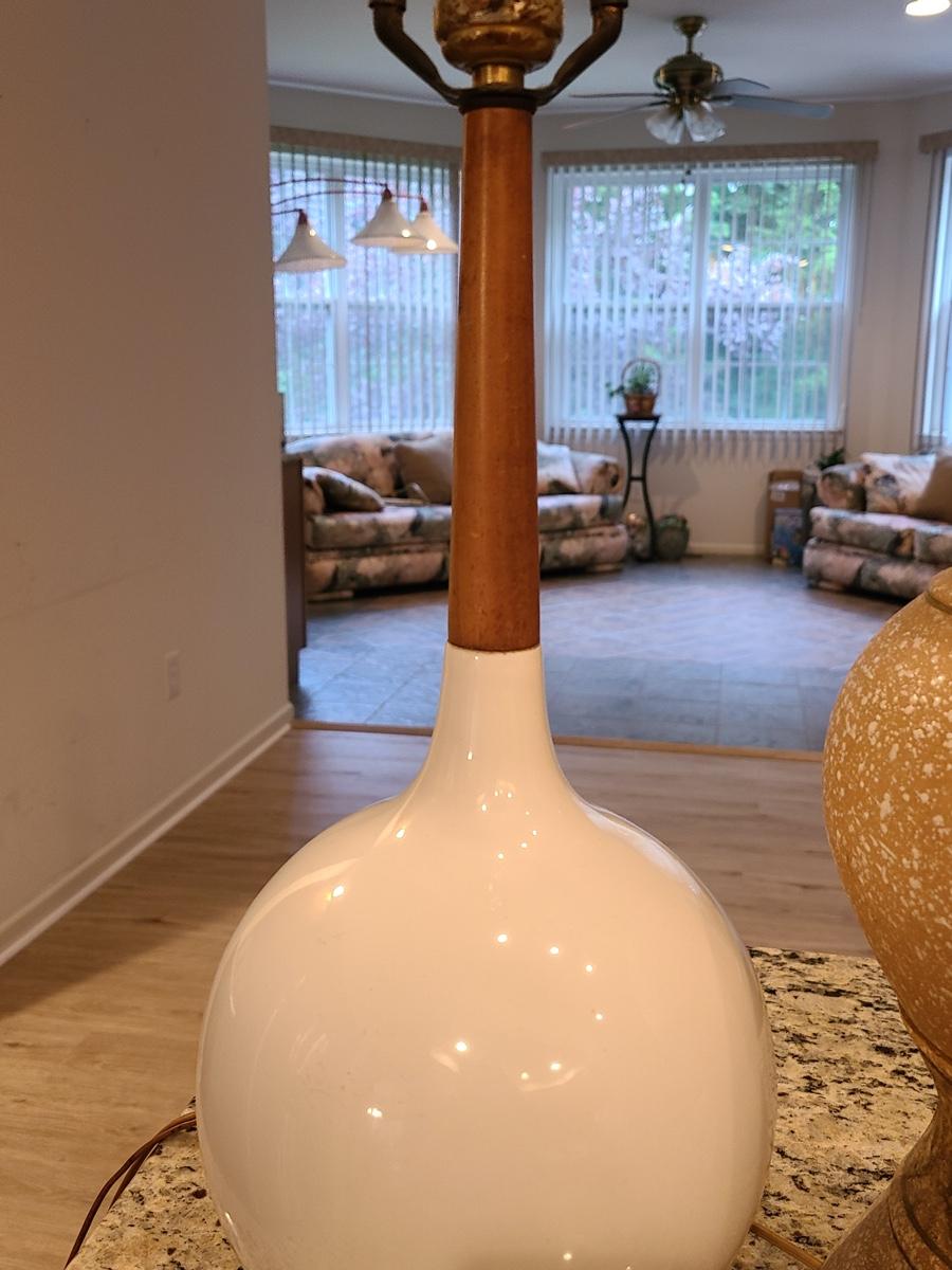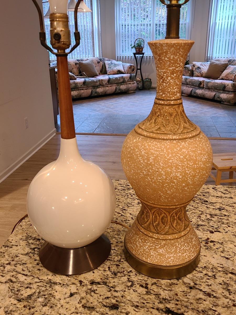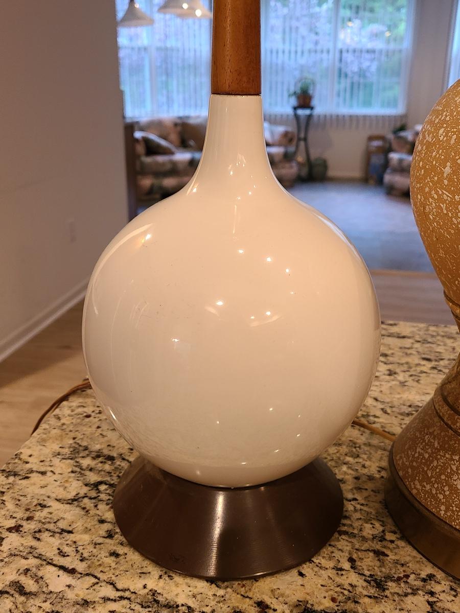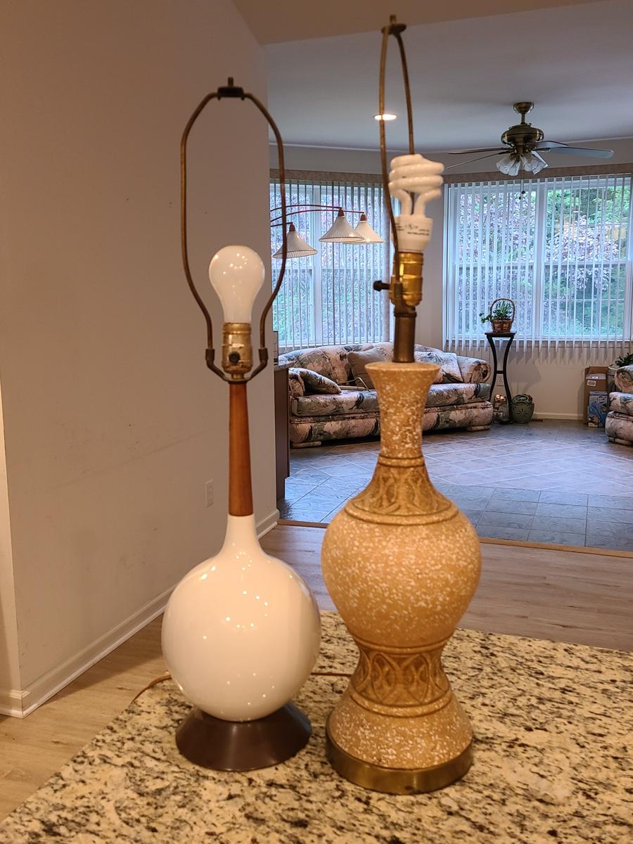 These two unique vintage lamps show style while being functional. They do not come with shades. They both work great. The white bulb, with teak arm, has a metal base. The other is pottery. Please see all pictures as they are the best representation of the items. The pictures show condition, measurements if taken, and what is included in the lot. Due to the large amount that we photograph and the time frame, we are not always able to take measurements. All items unless noted, are pre-owned and have been used. If you purchased furniture, you must bring help. We do not allow one person to carry large furniture out on their own. Bring help, tools and a truck for the safety of our client’s homes, and your personal safety. Company policy. Thank you.