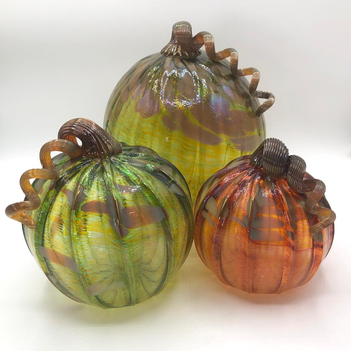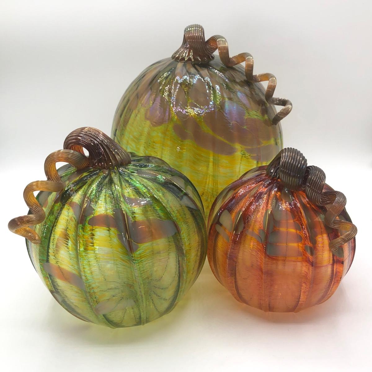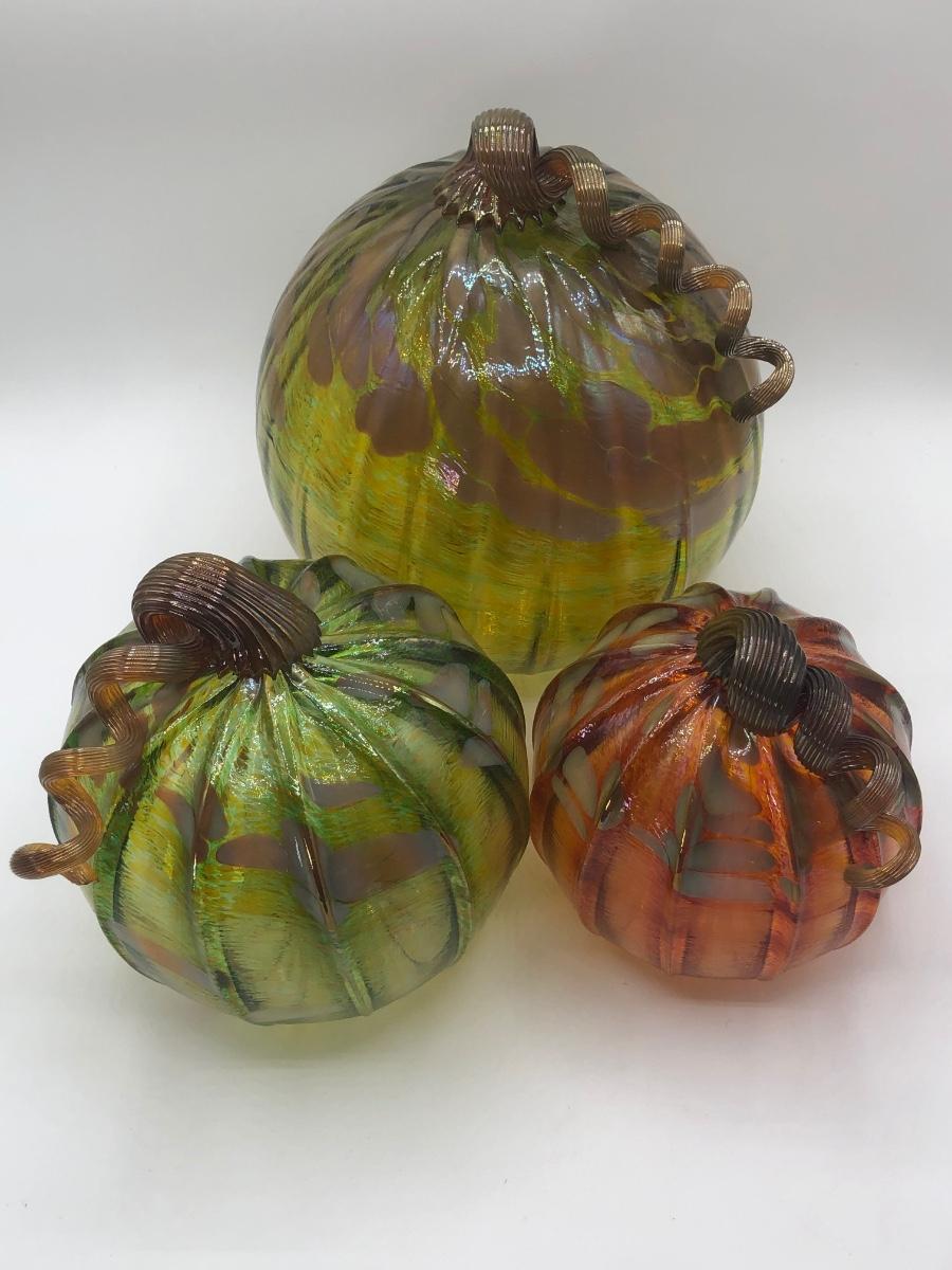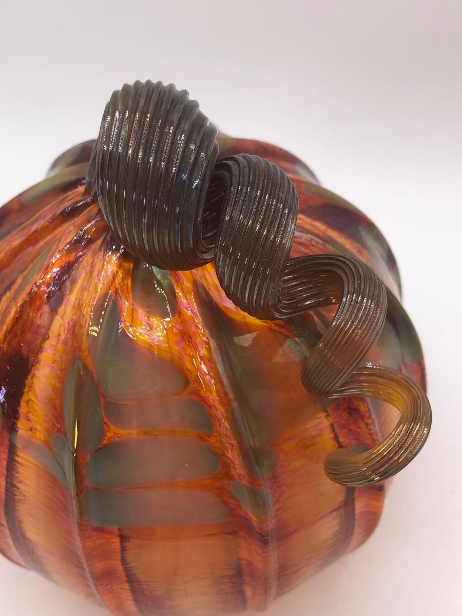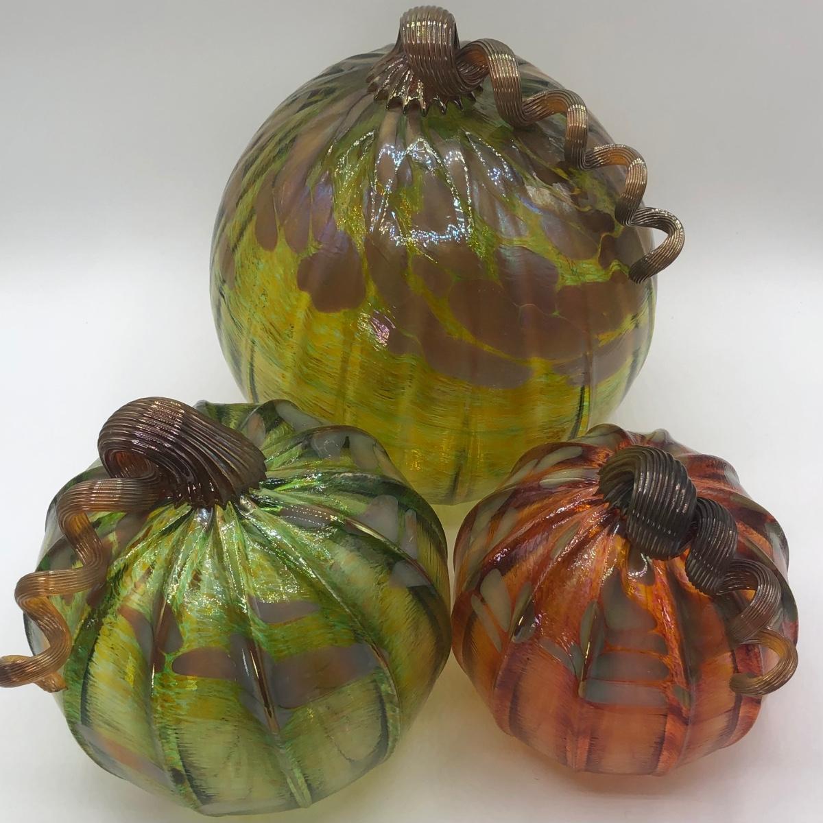 LOT 266L: Trio of Beautiful Artist Signed Luke Adams Art Glass Pumpkins w/ Spiral Stems