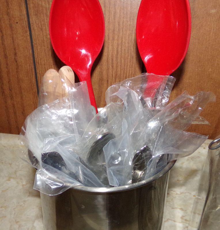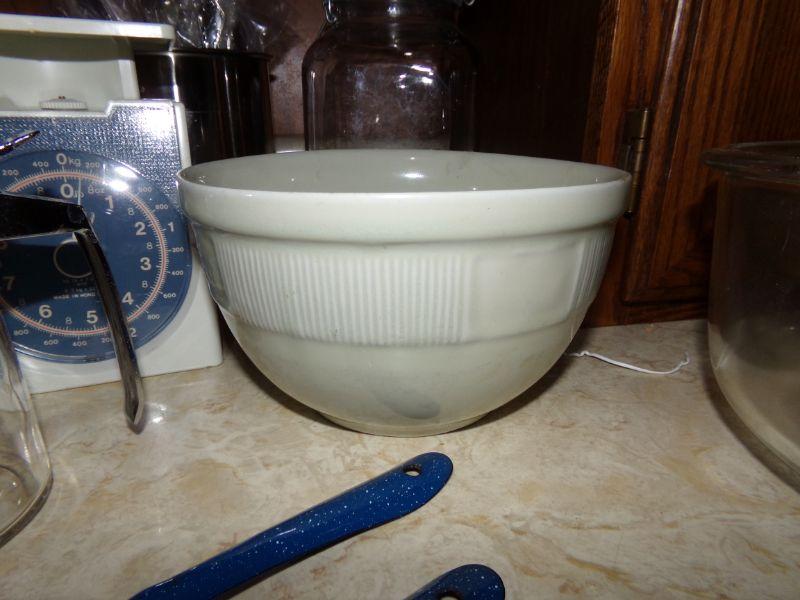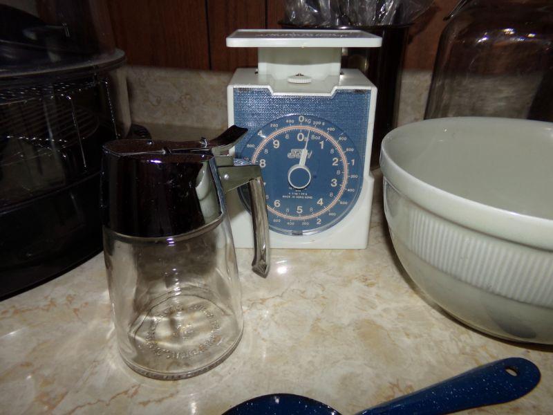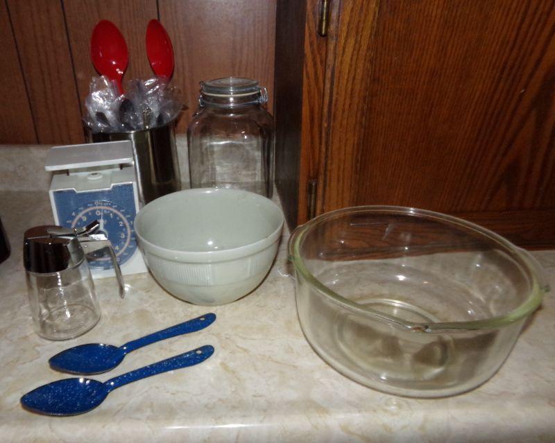 NEW FLATWARE, 2 MIXING BOWLS, SCALE, SYRUP SERVER, HINGED JAR, 2 PUREE, WILTON CAKE DECORATING KIT AND 4 SERVING SPOONS