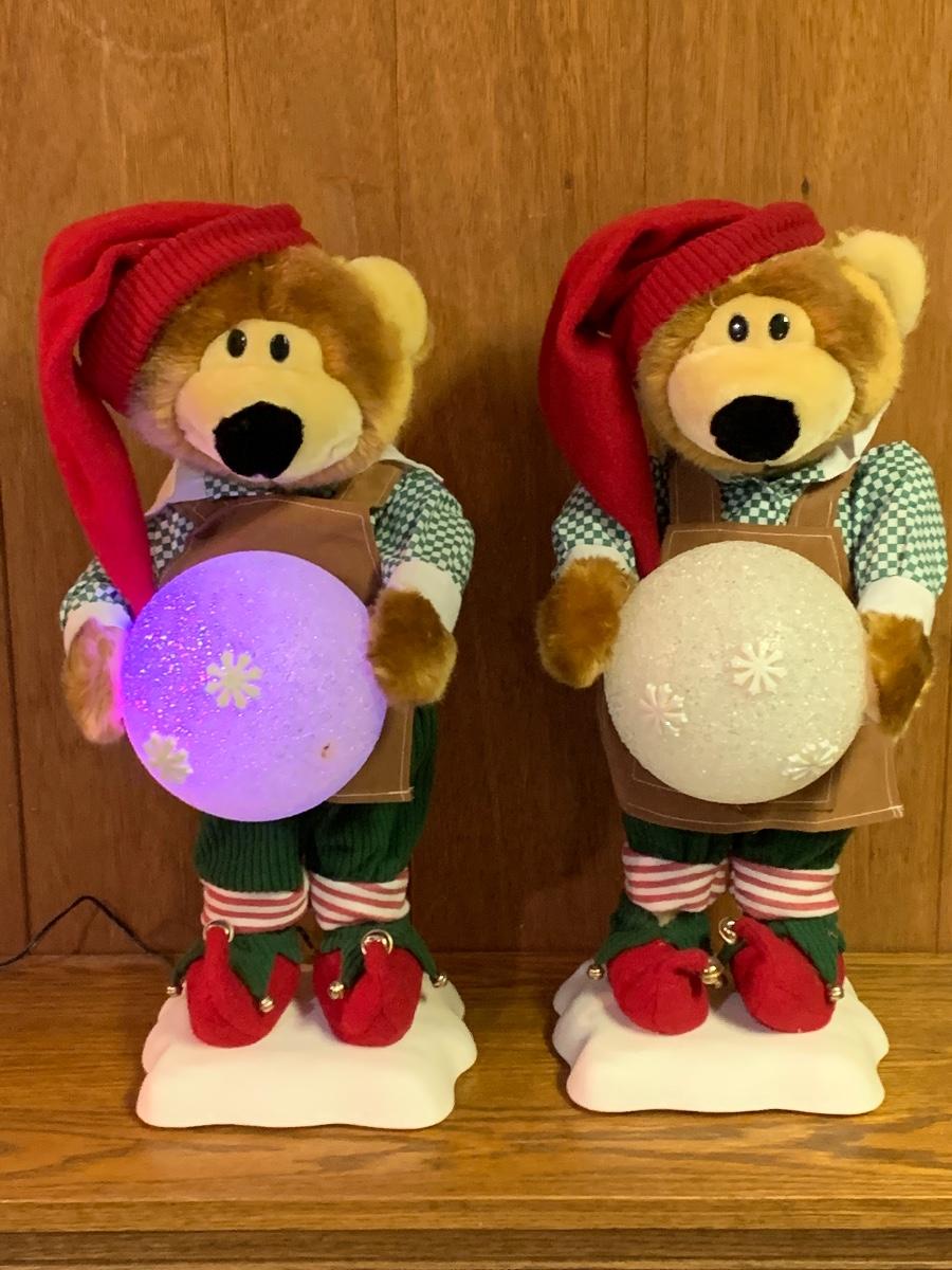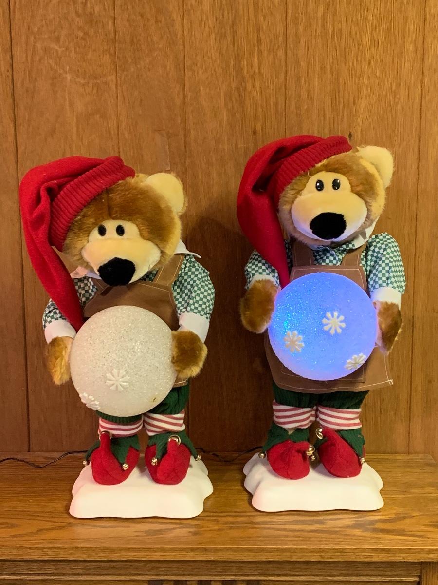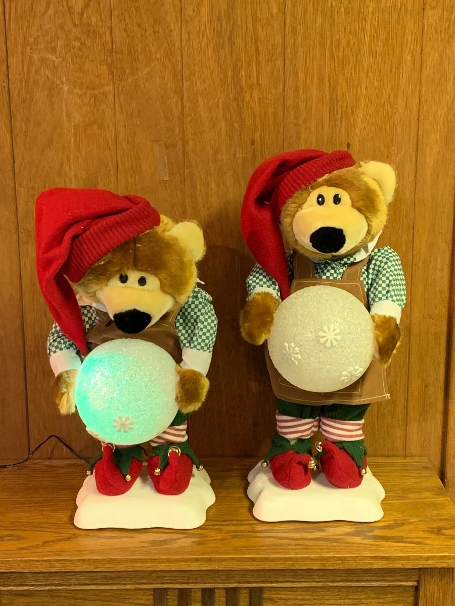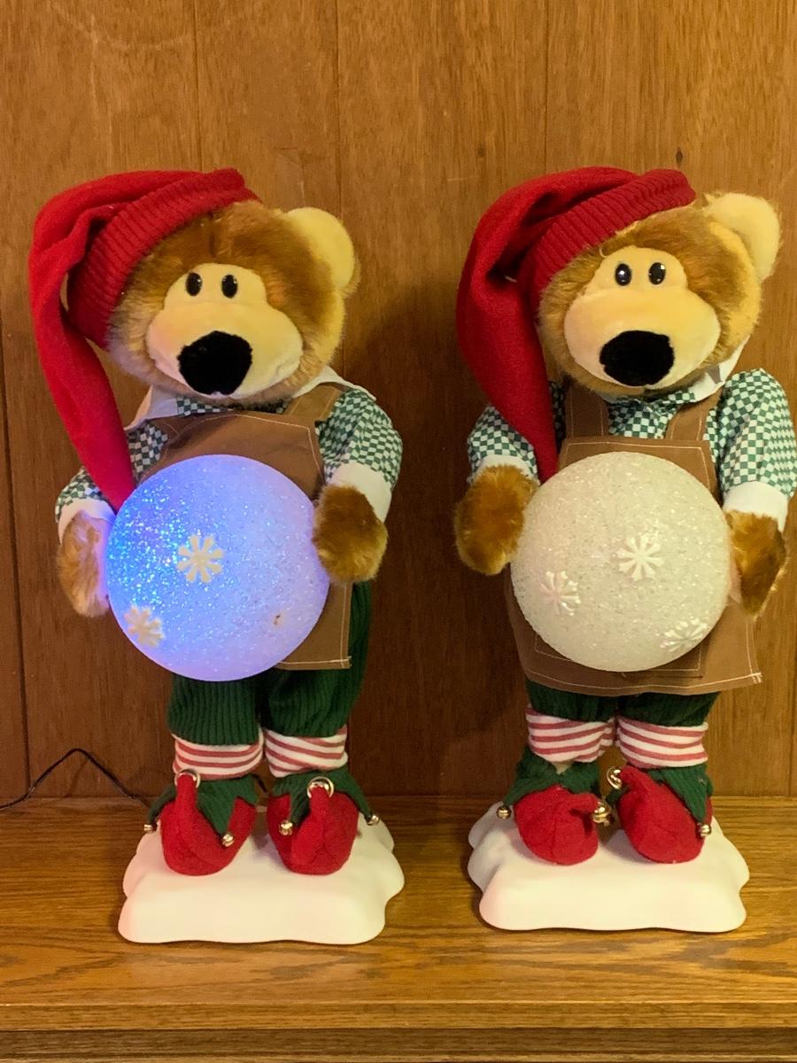 Pair of animated holiday bears with boxes. These both work and are so fun. The boxes do show wear from storage.