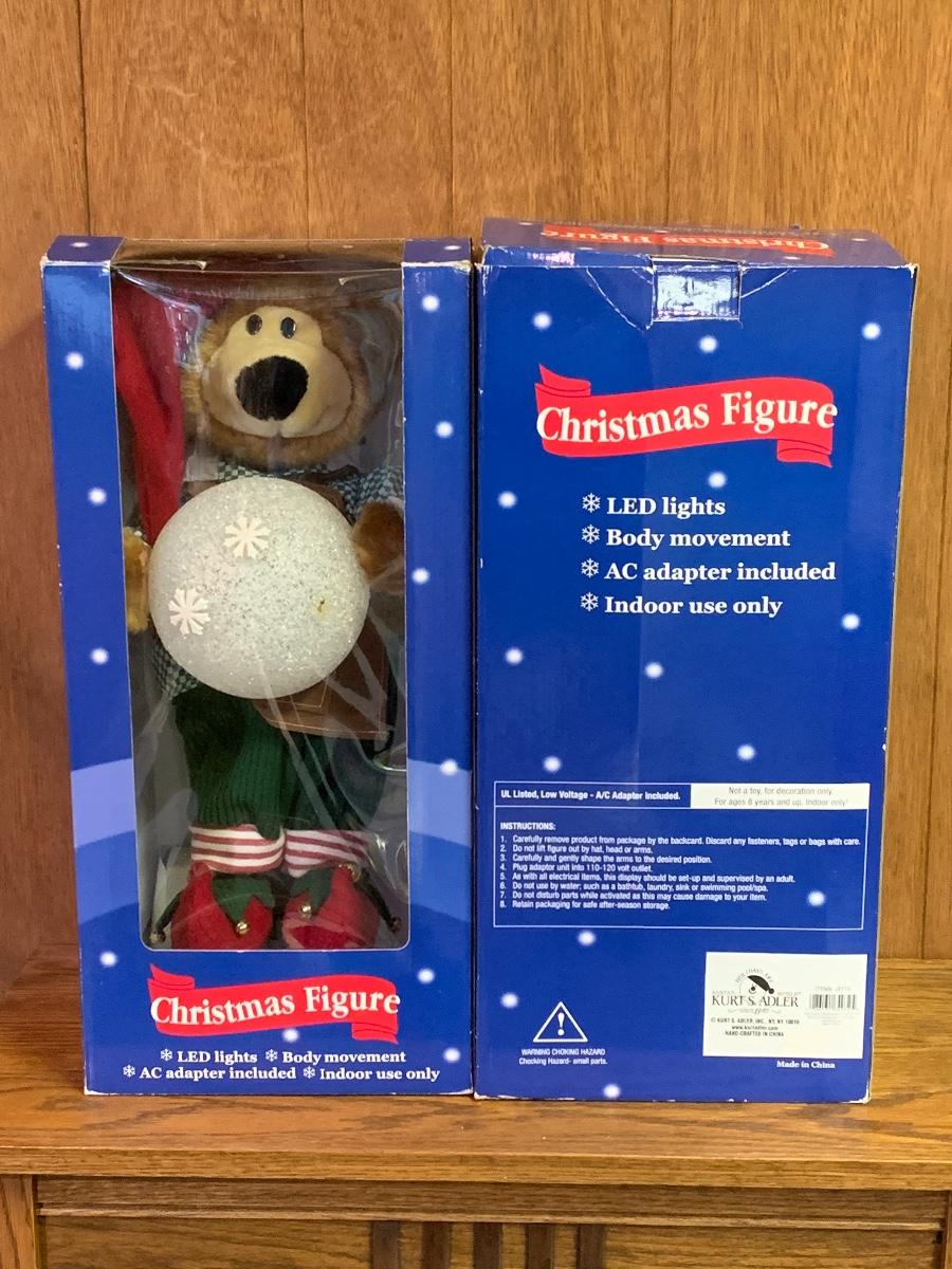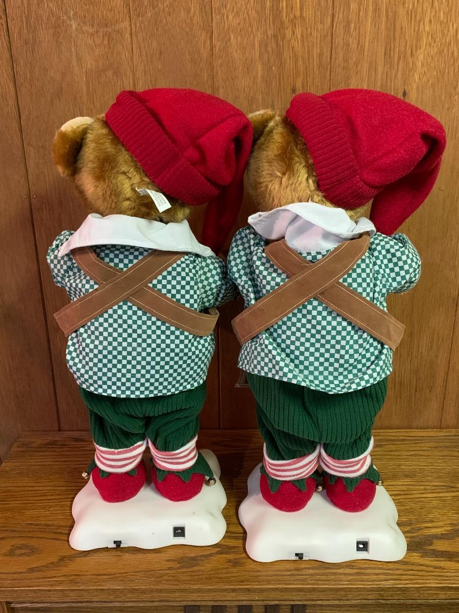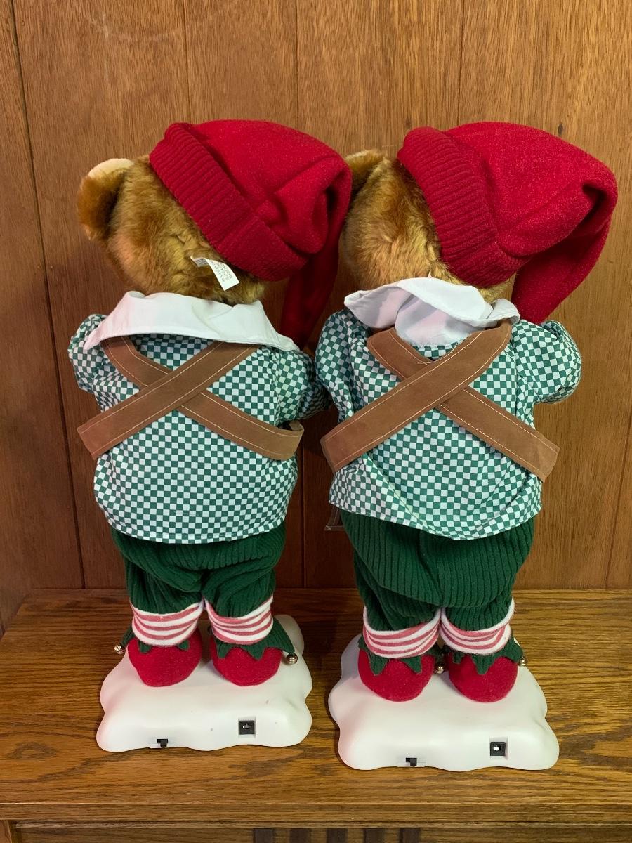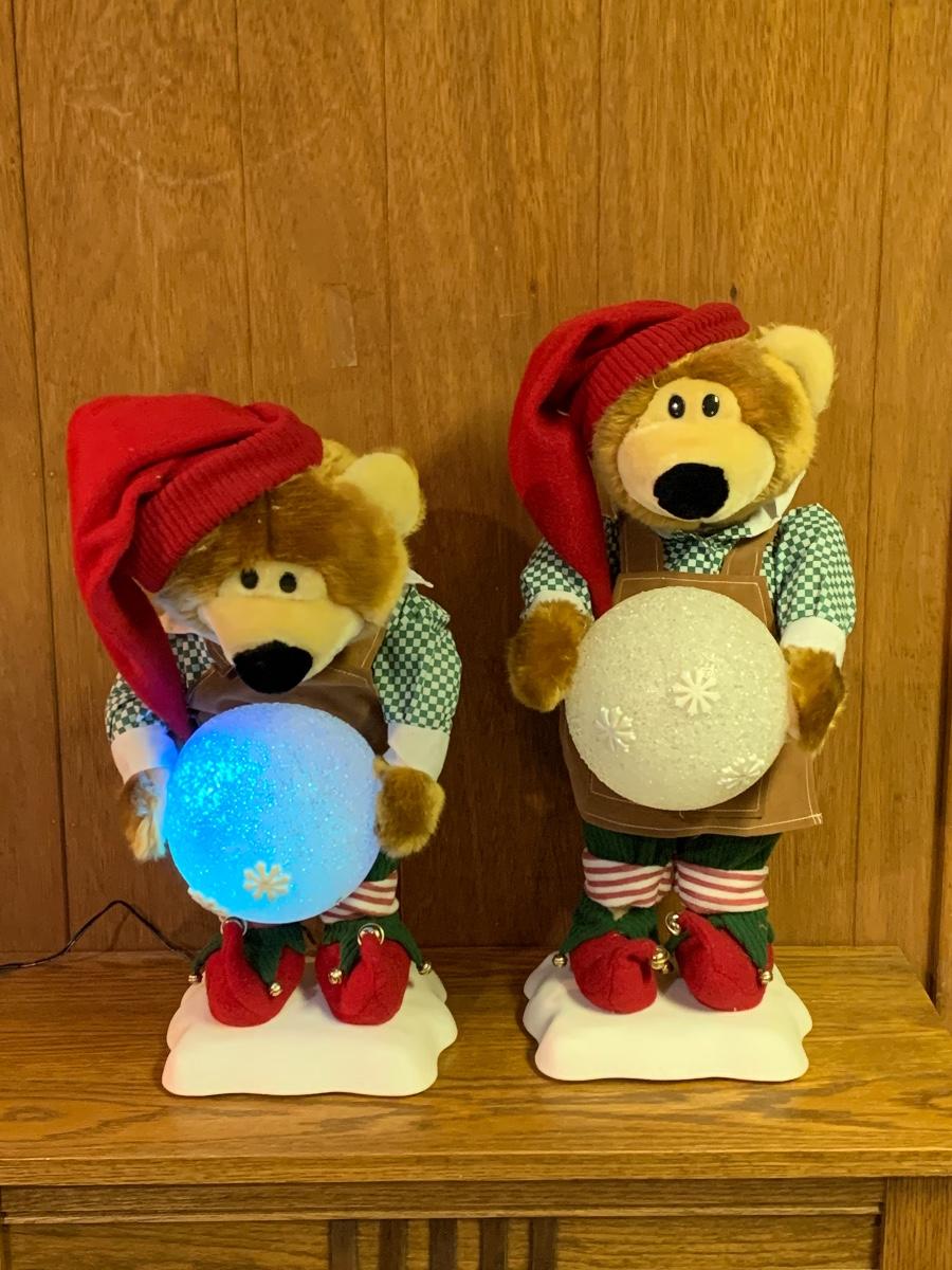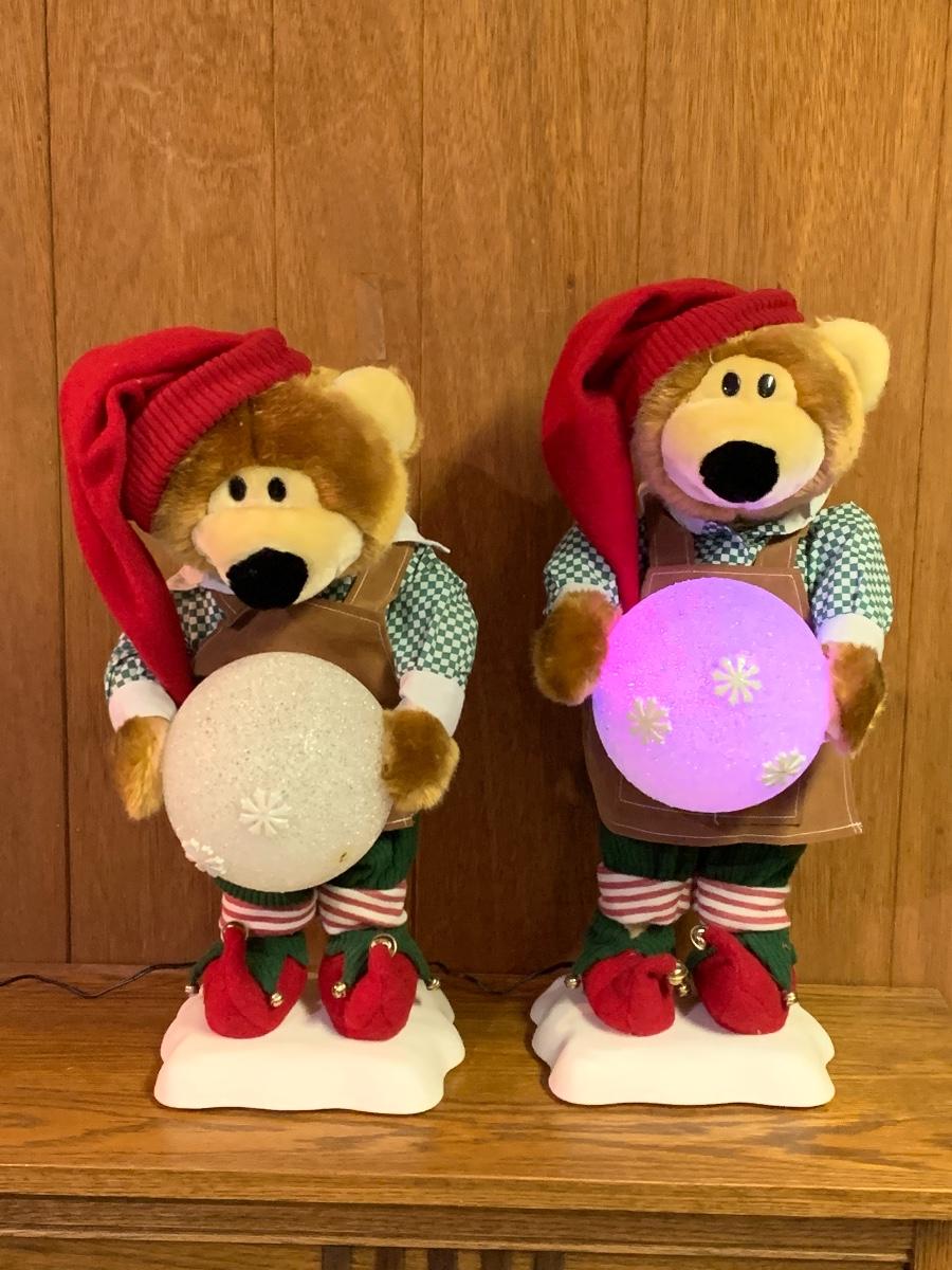 Pair of animated holiday bears with boxes. These both work and are so fun. The boxes do show wear from storage.
