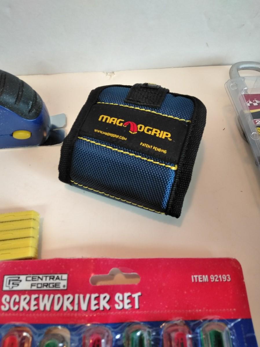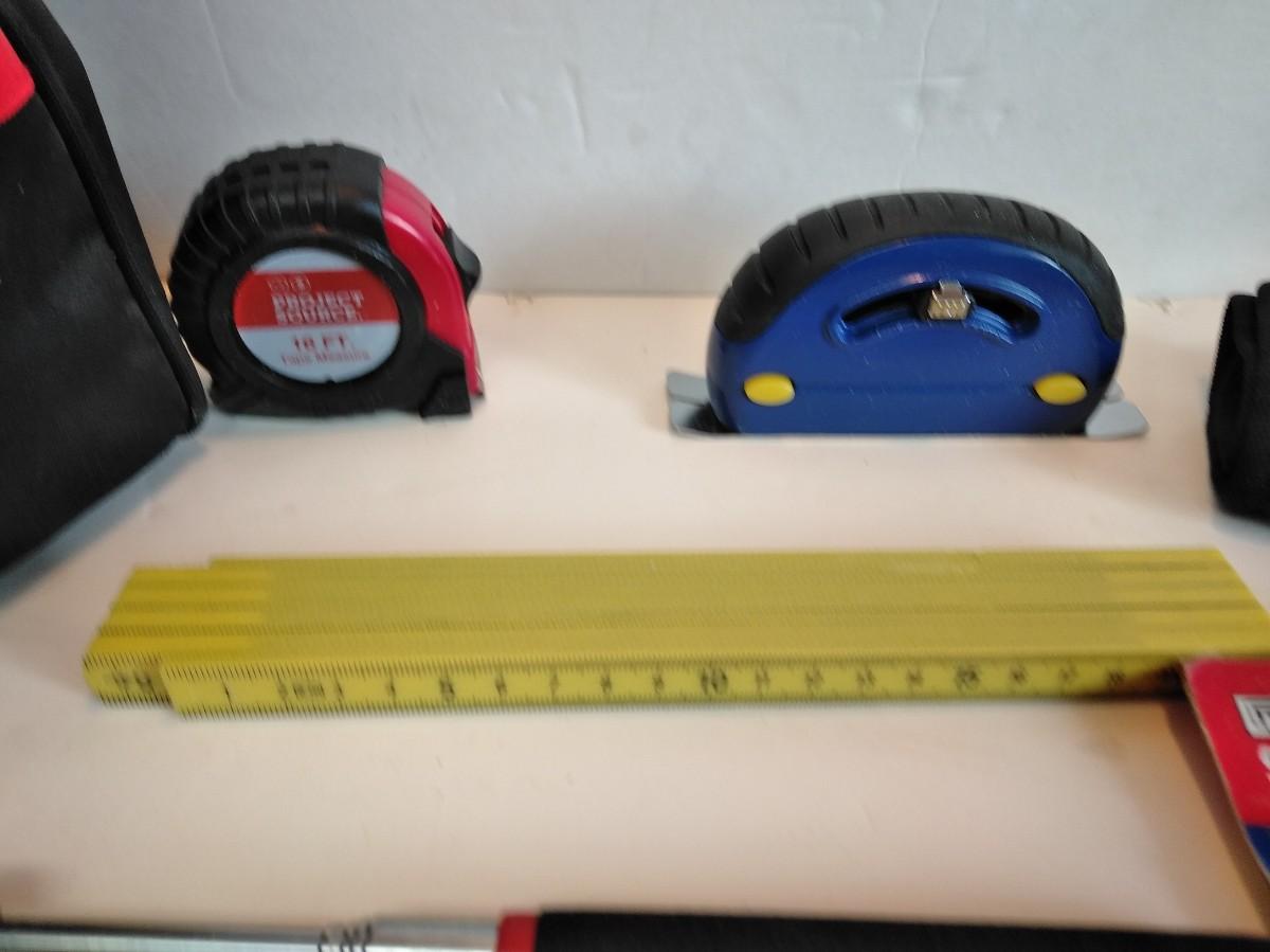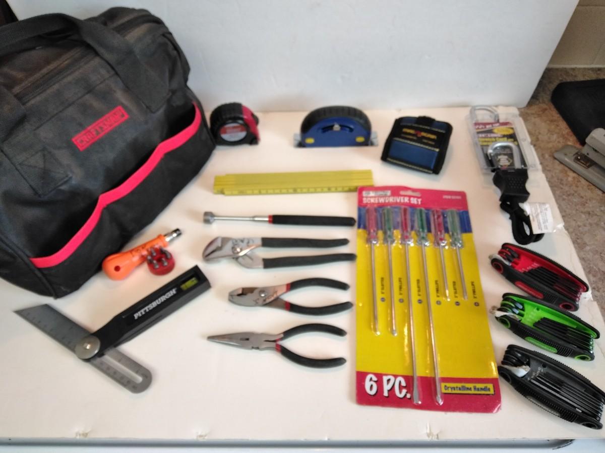 NICE ASSORTMENT OF HAND TOOLS INCLUDING SCREW DRIVERS, BOX CUTTER, PLIERS, TAPE MEASURE AND MORE ALL IN A TOOL BAG.