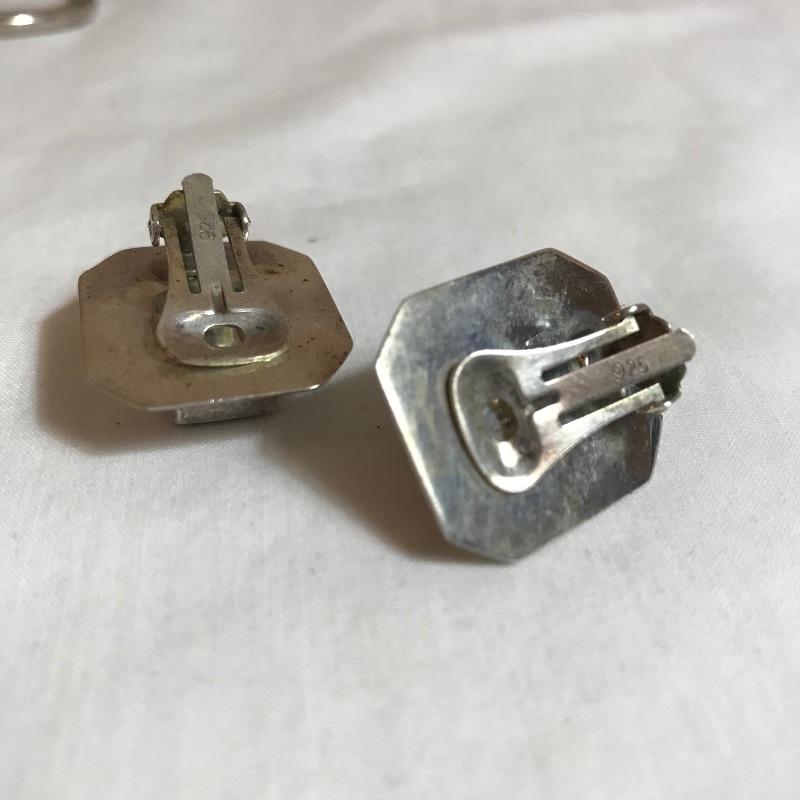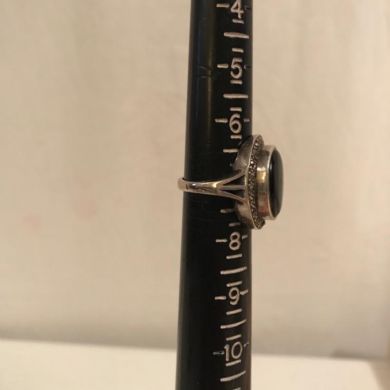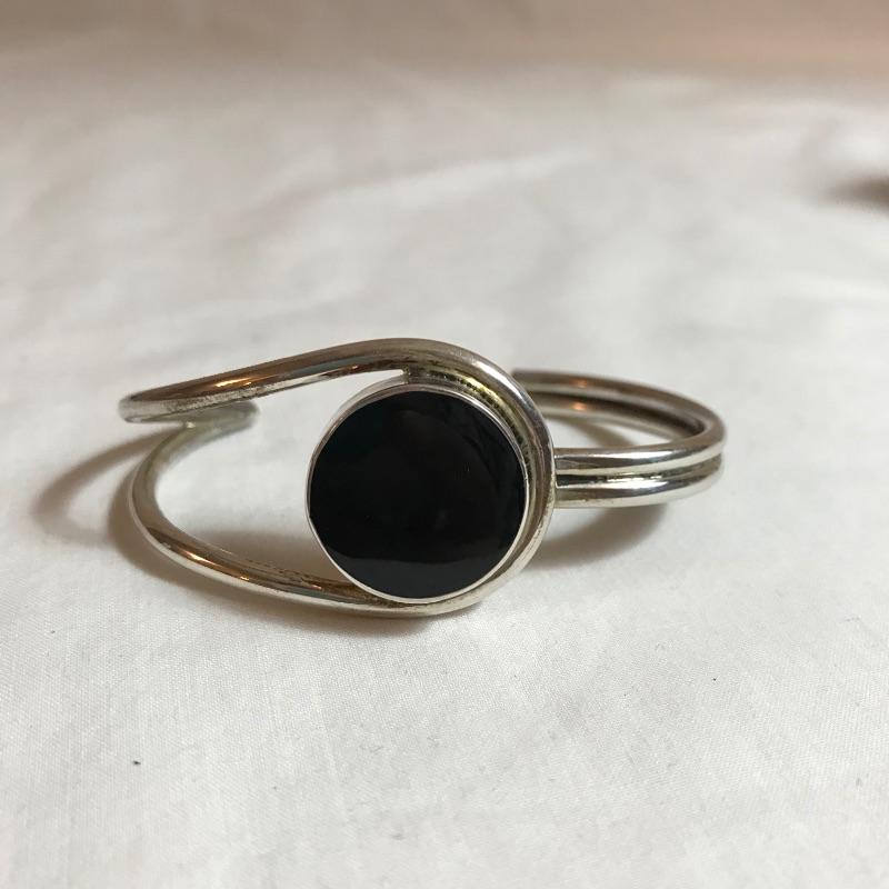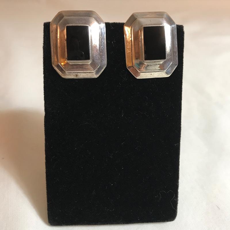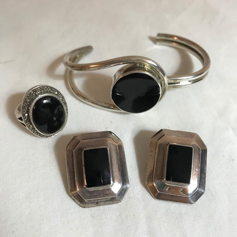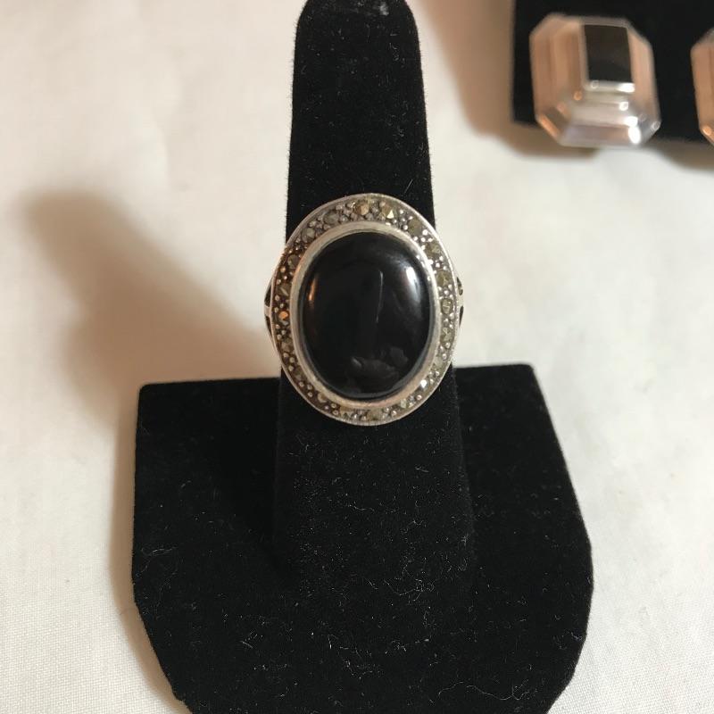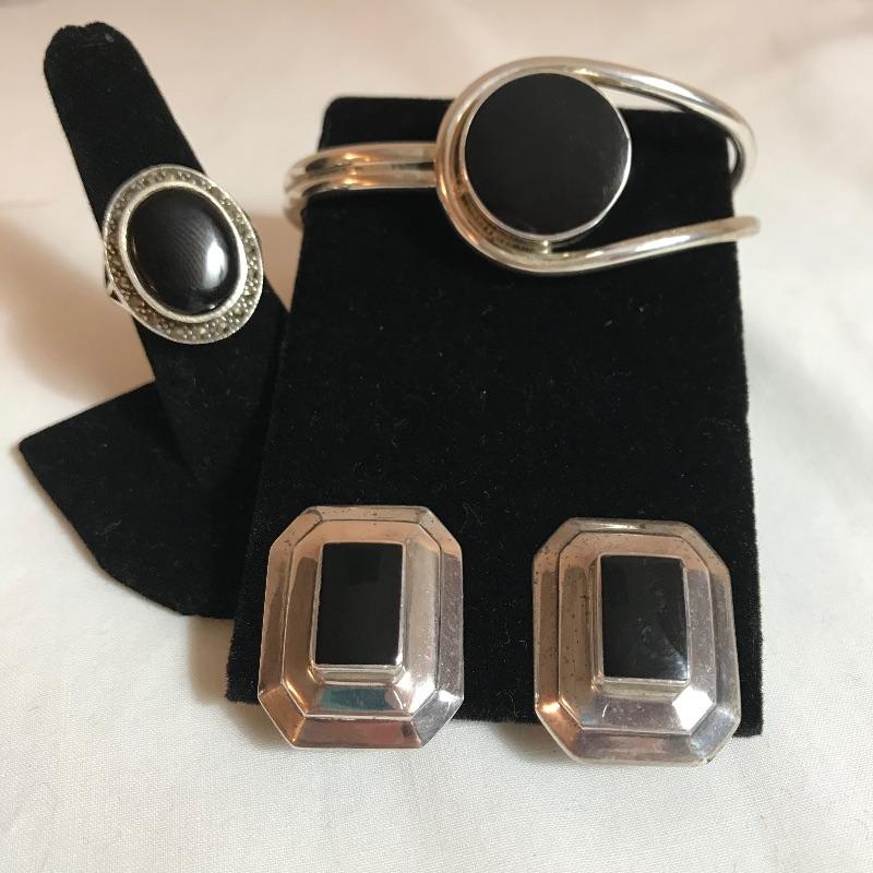 Lovely Sterling collection with what appears to be an Onyx stone in each piece. Clip earrings marked 925, with modern bracelet and lovely ring both appear to be marked 925. See photos. Shipping available.