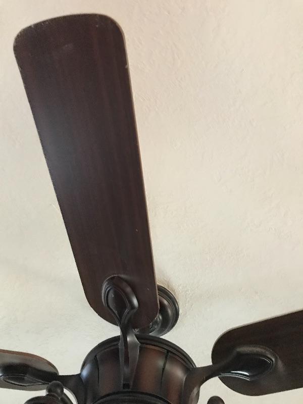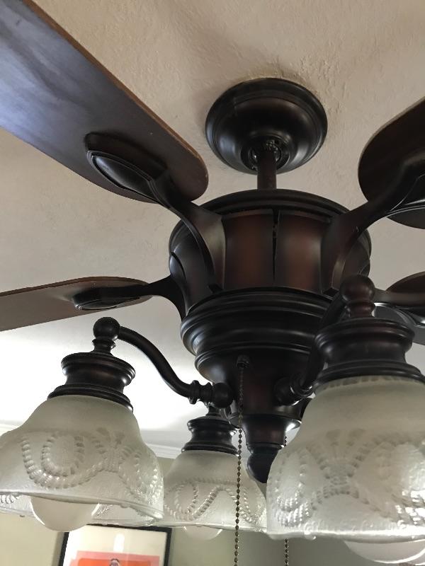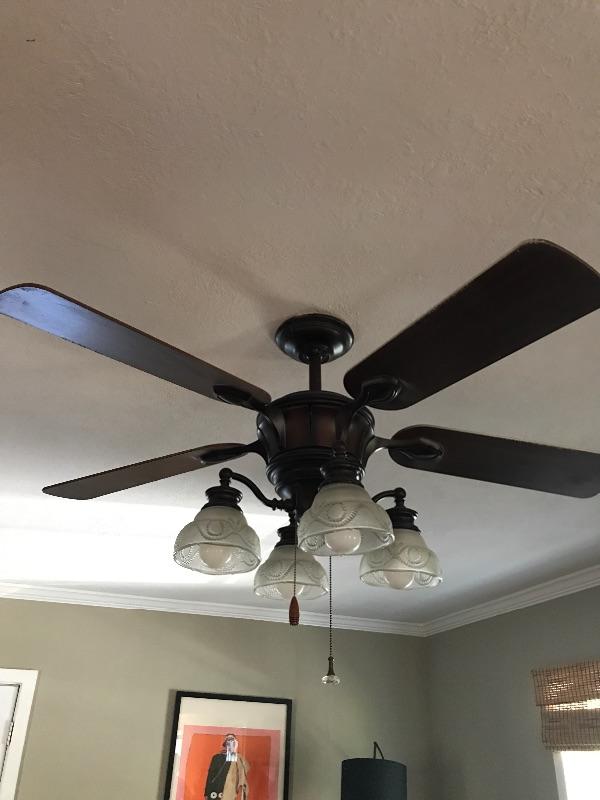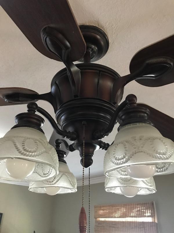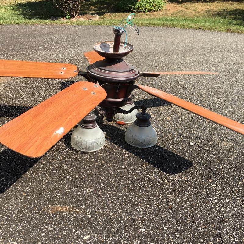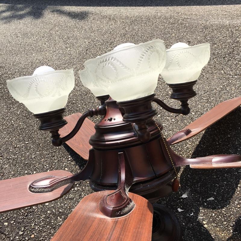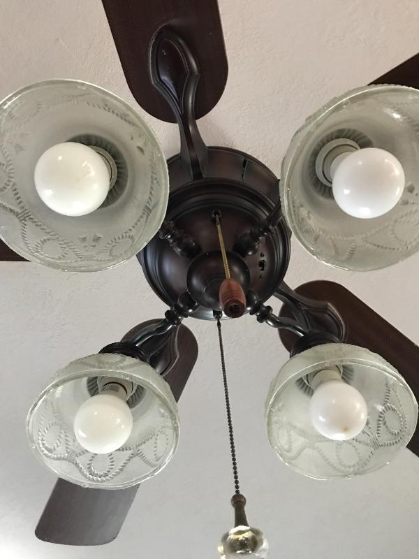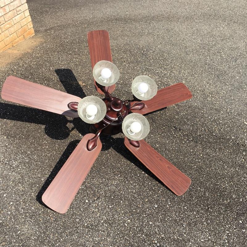Five blade ceiling fan with four lights below. Keep your place cool in the summer and warm in the winter with this handsome fan. Fan measures approximately 51” across and was working well before it was removed.