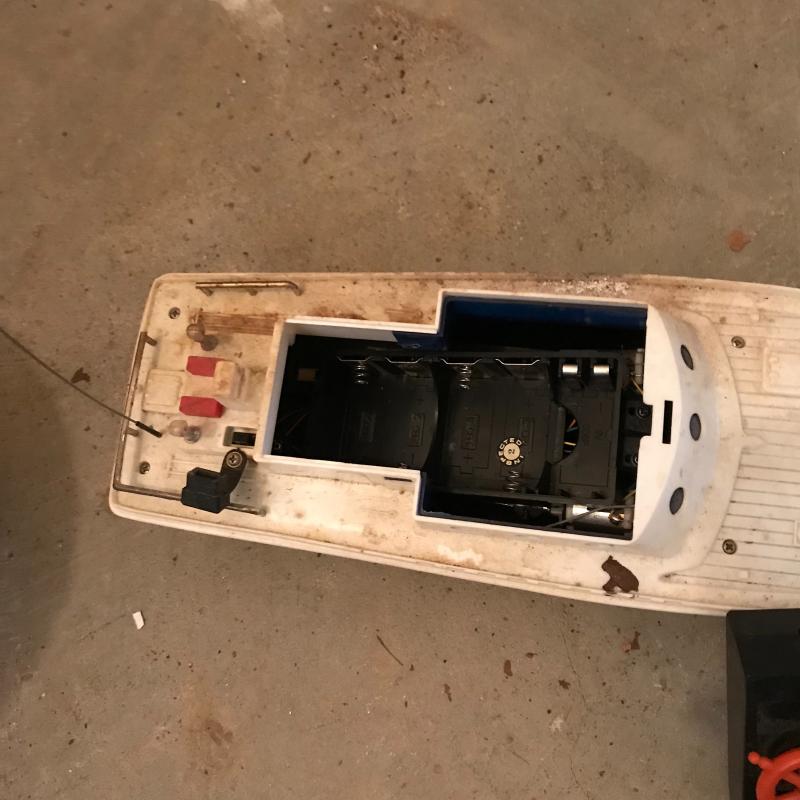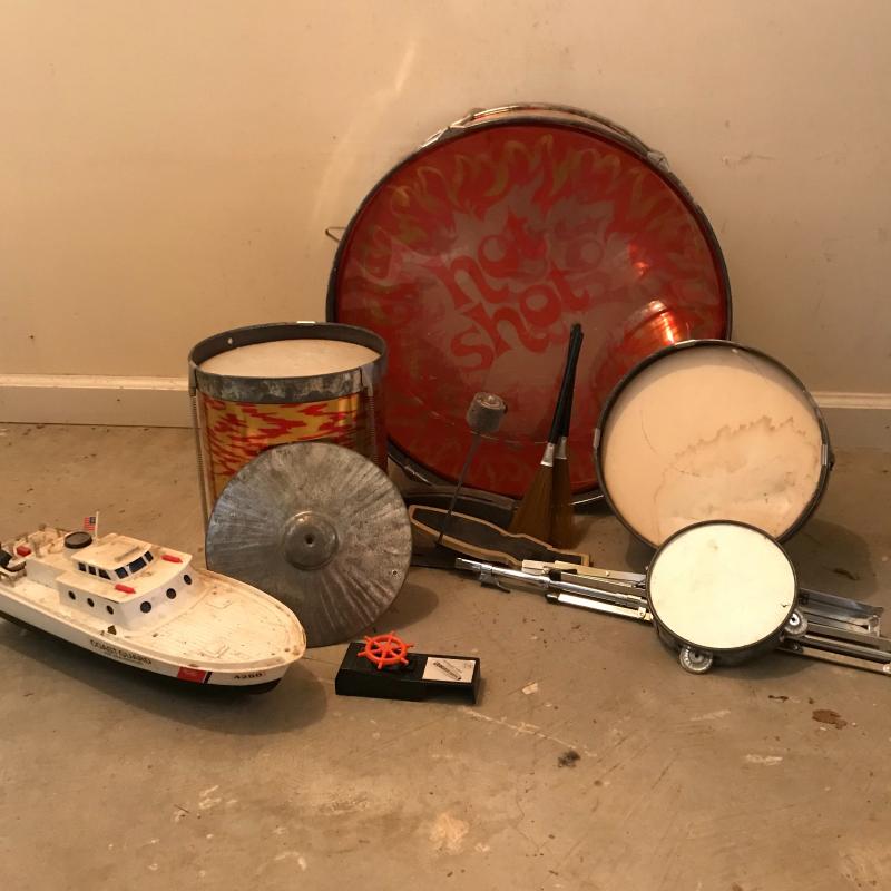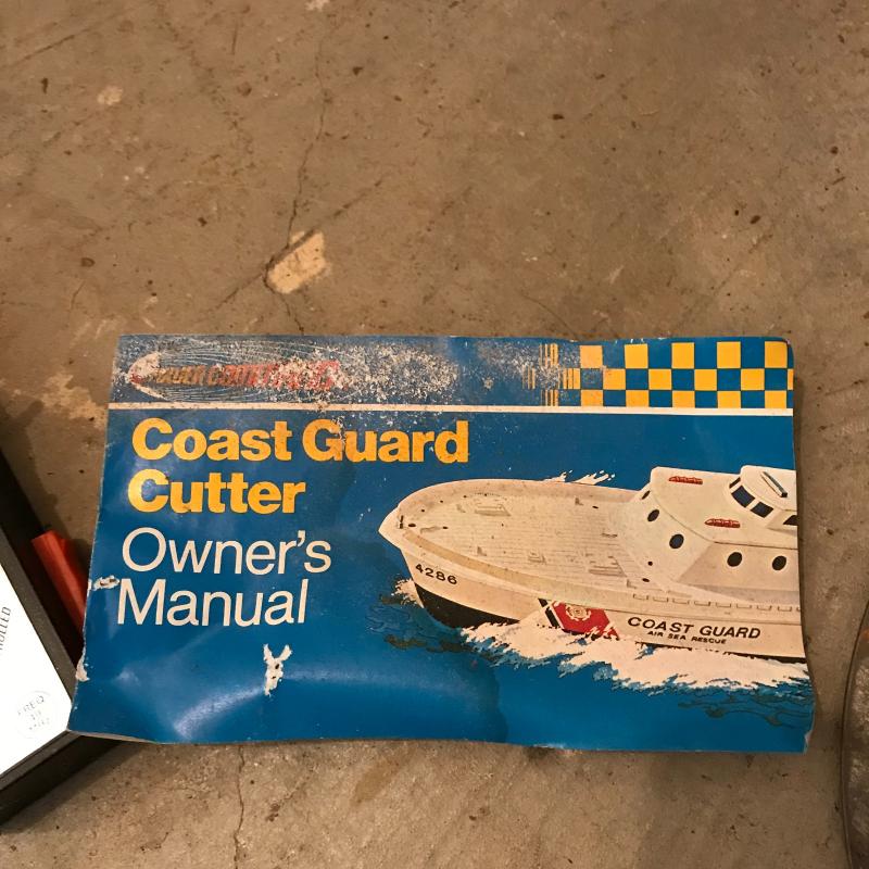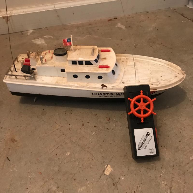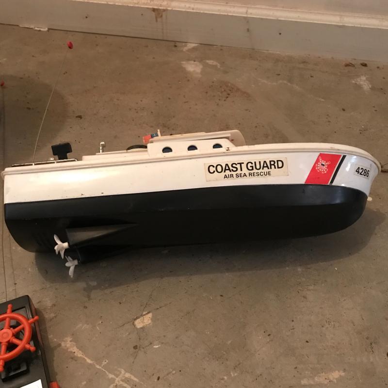 Kids’ dream and parents’ nightmare wrapped up in one lot! Hot shot child’s drum collection with three drums, tambourine and one symbol. Stands and pedal included are pictured. Drums have been well loved and need a light cleaning. See photos. When the child takes a break from music, let them take out the remote controlled Coast Guard Cutter. Remote and ship both use one 9v battery each and ship needs four C batteries. Working condition unknown, owner’s manual included. No shipping.
