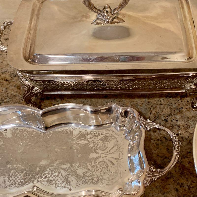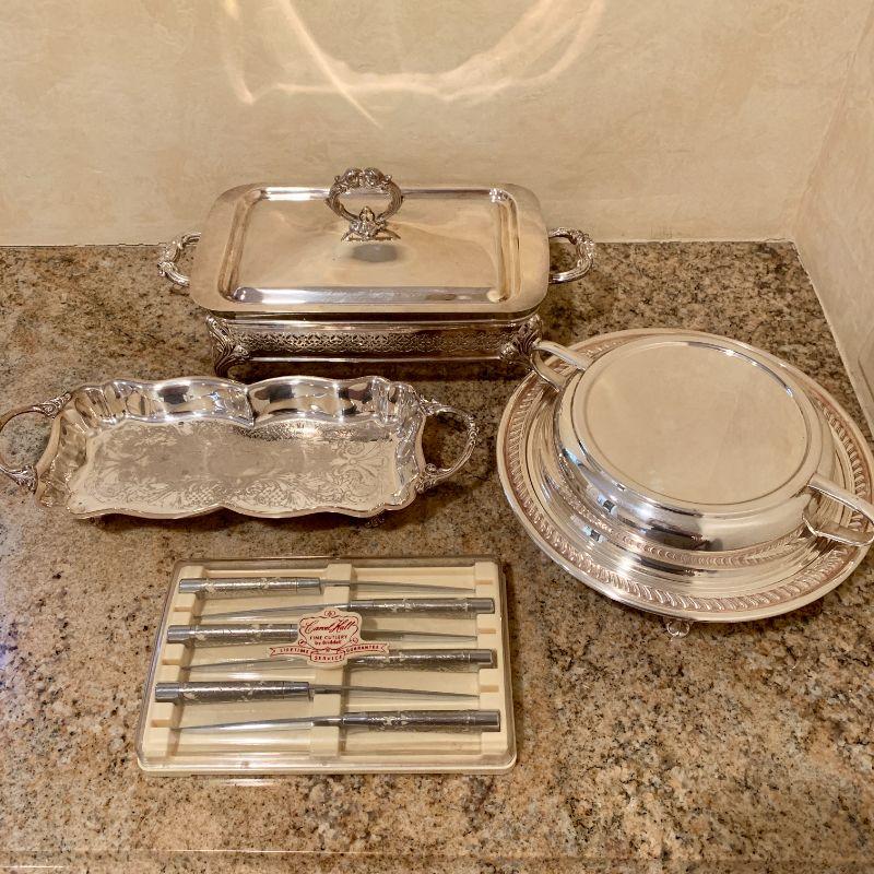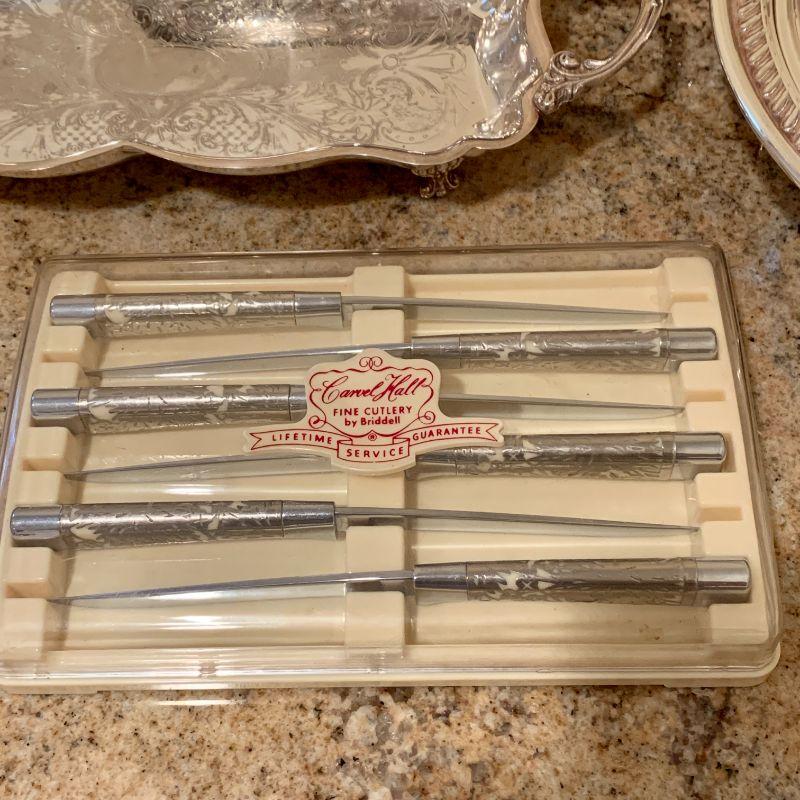LOT 267 GROUP OF SILVER PLATE SERVING PIECES CARVEL HALL STEAK KNIVES