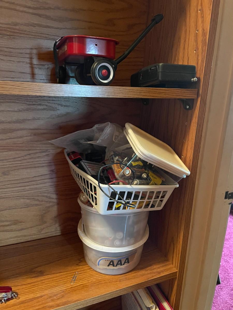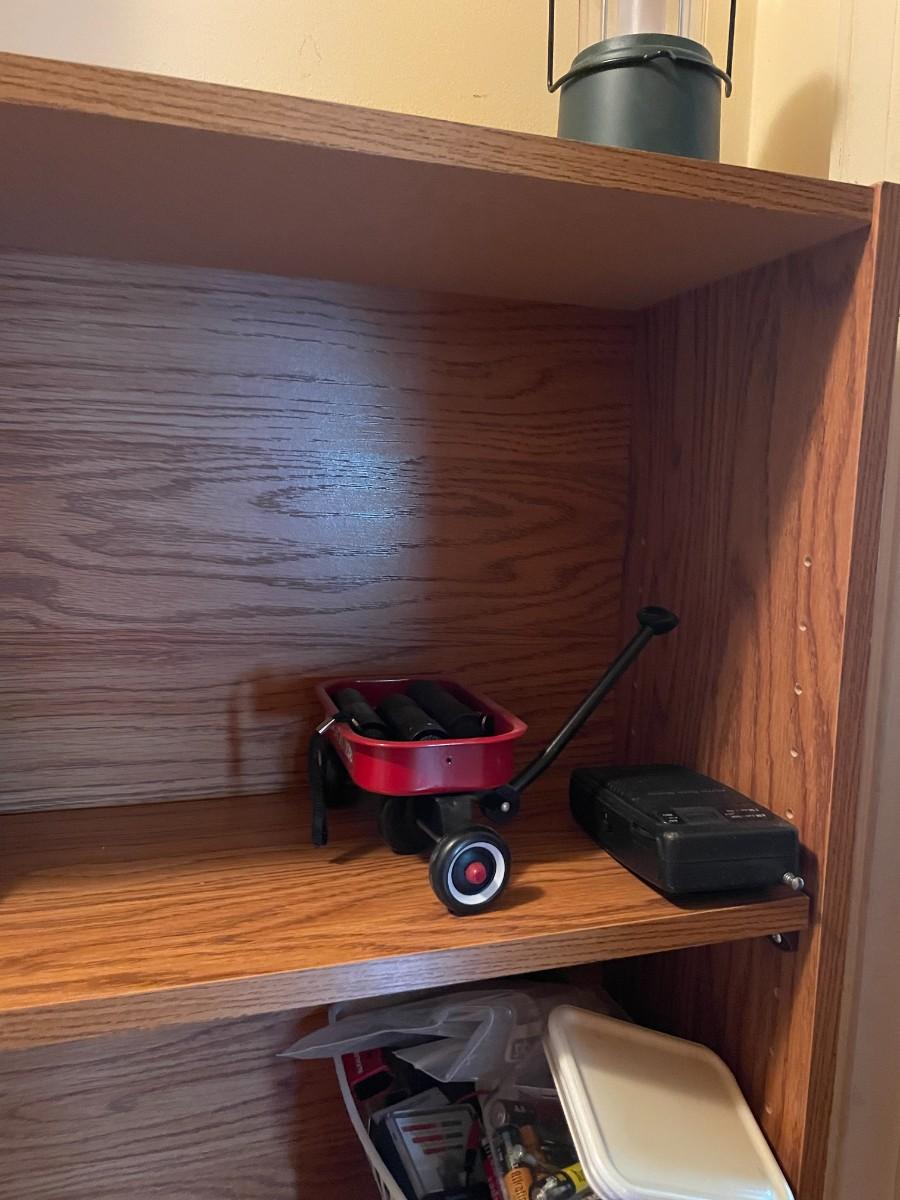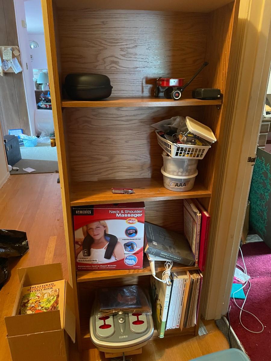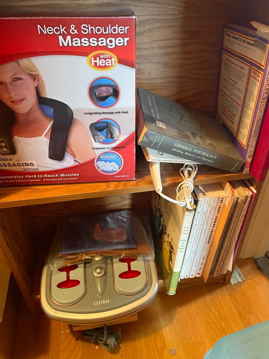 Shelf with contents, batteries, massager, books, puzzles, pocket knife, etc.