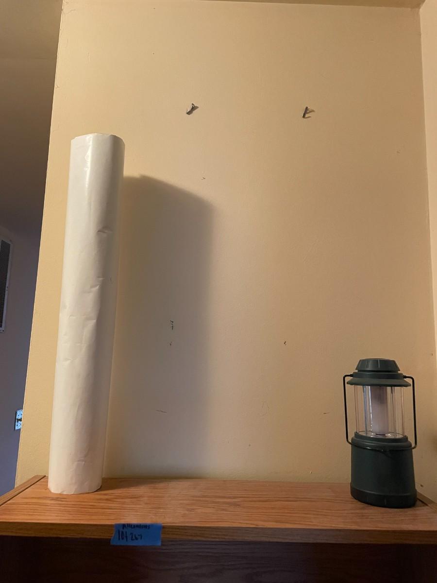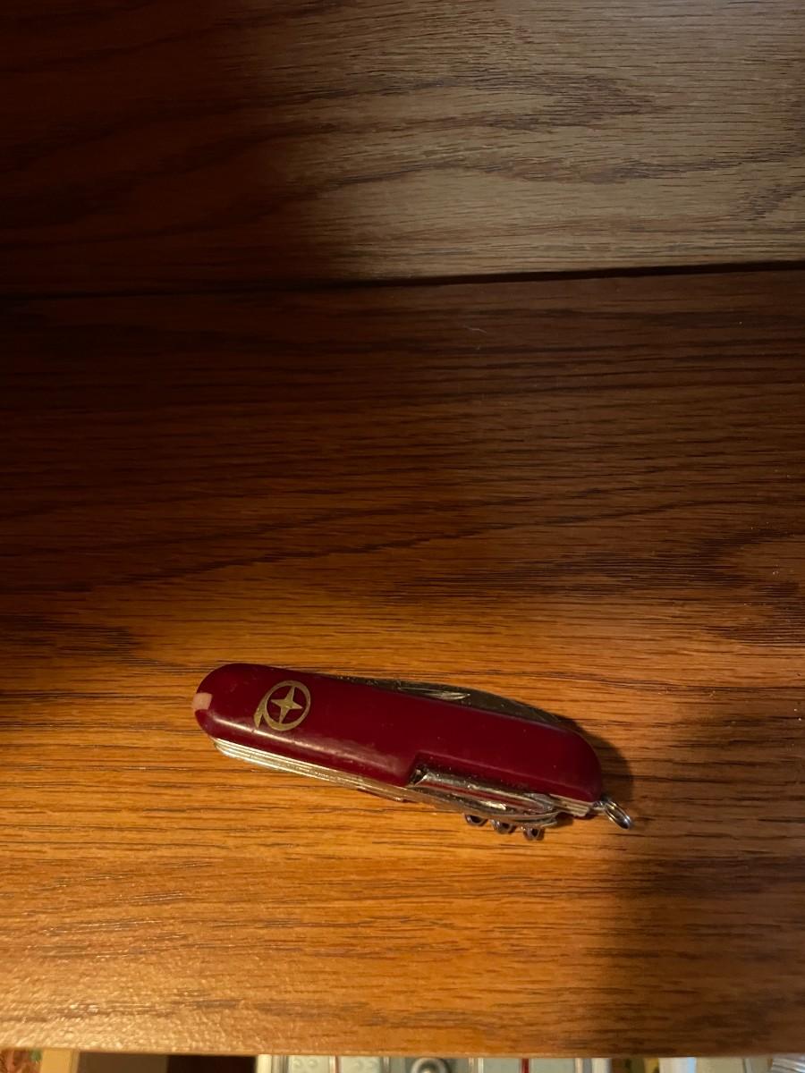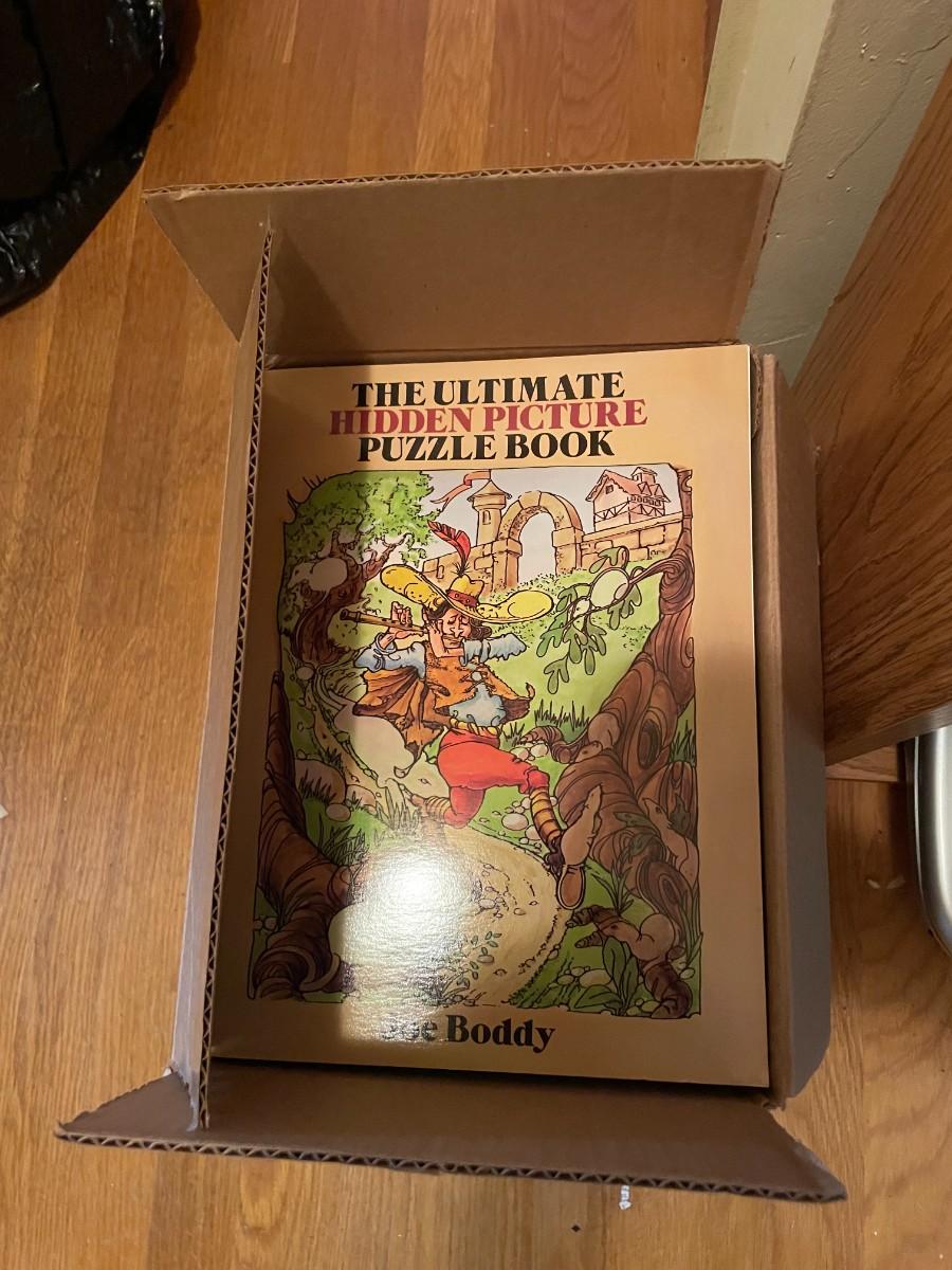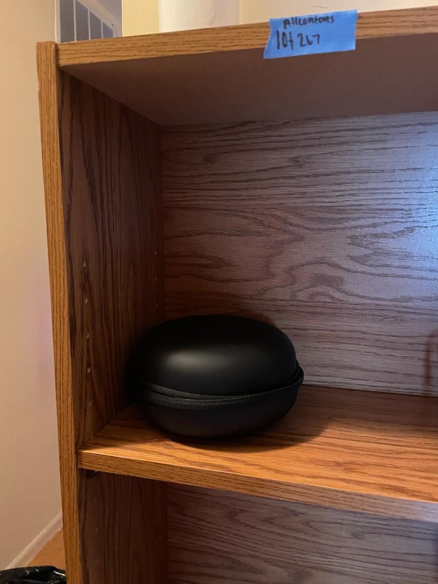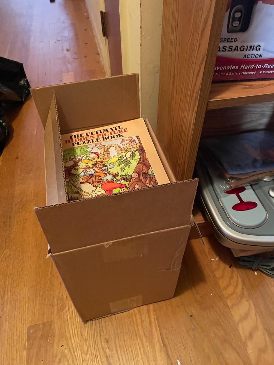 Shelf with contents, batteries, massager, books, puzzles, pocket knife, etc.
