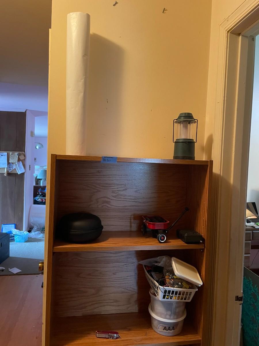 lot 267- Shelf with contents, batteries, massager, books, puzzles, pocket knife, etc.