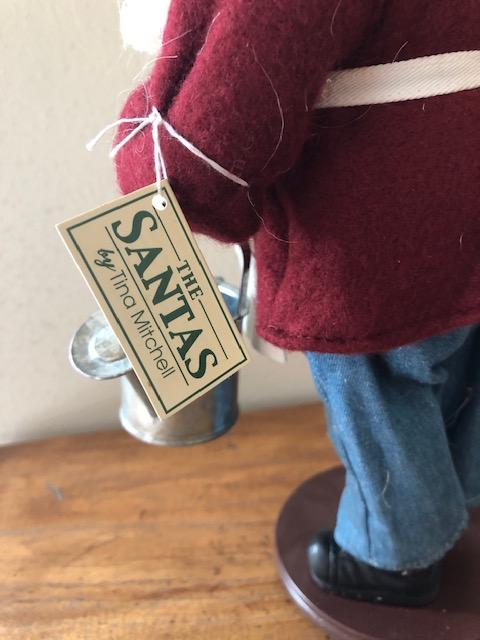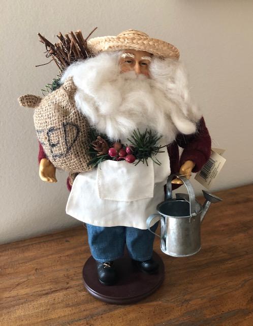 Santa Claus figure by Tina Mitchell. Holding seeds and his watering can. Apprx 12" tall. With tag.