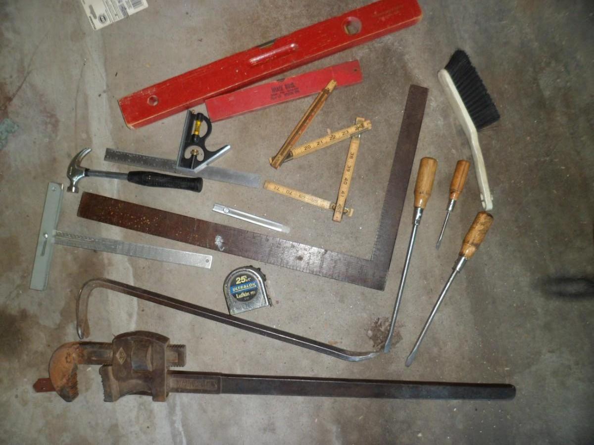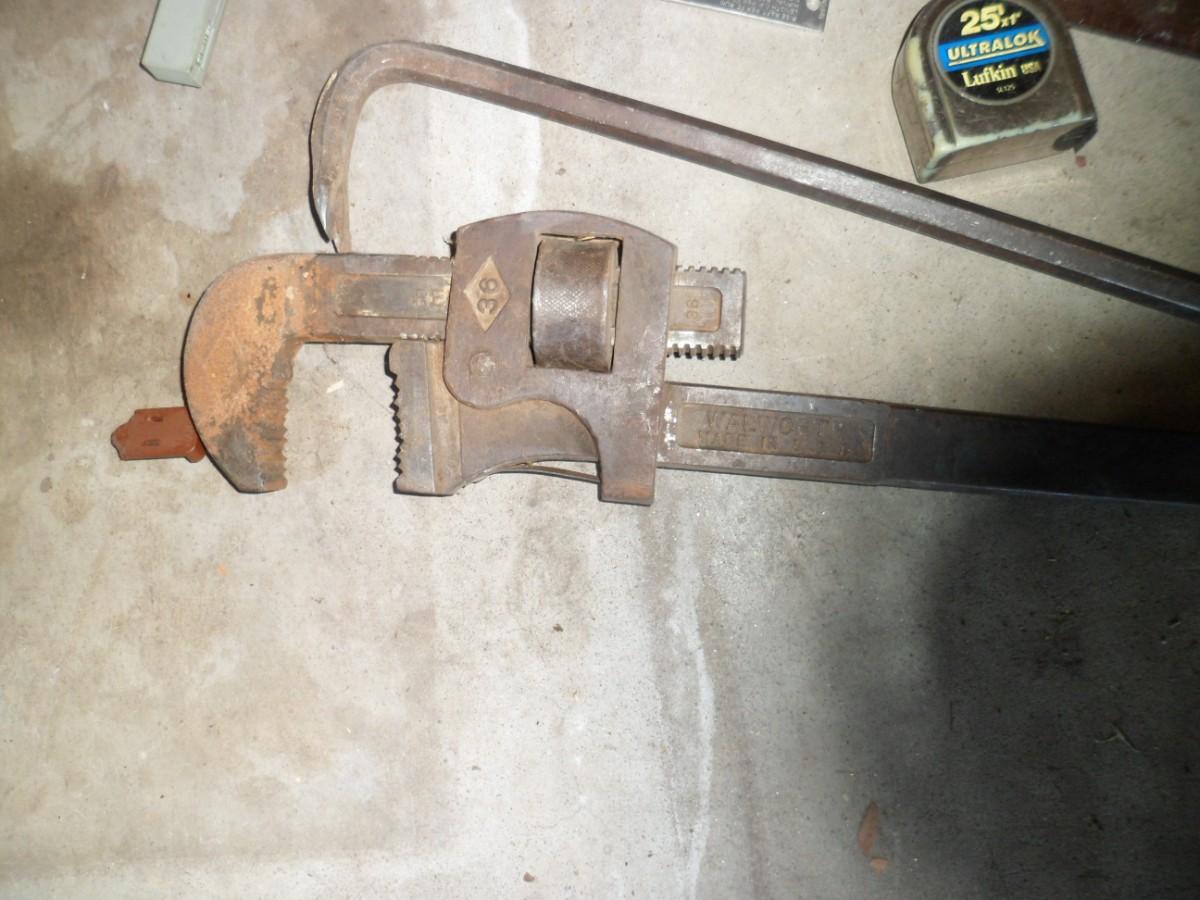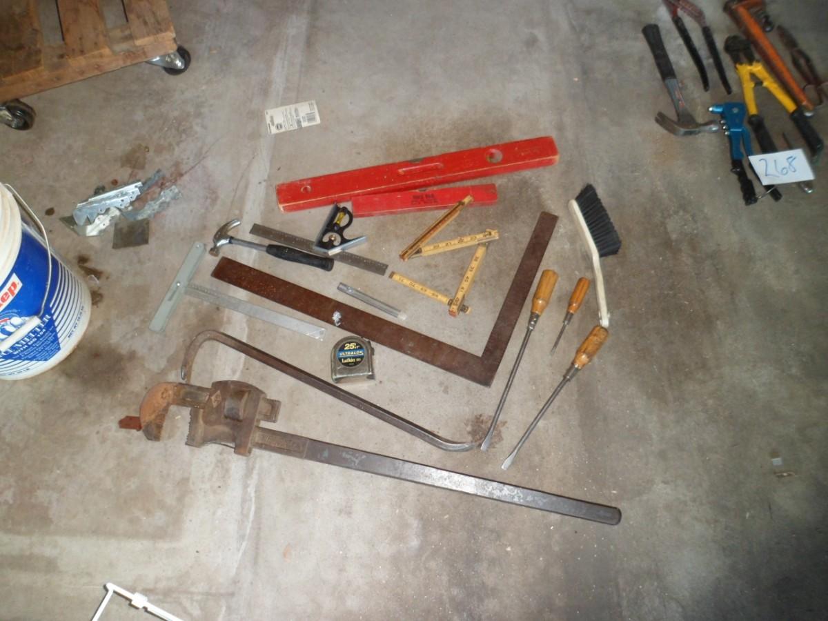 LOT 267 36" PIPE WRENCH, VINTAGE MEASURING TOOLS LEVELS, AND MORE