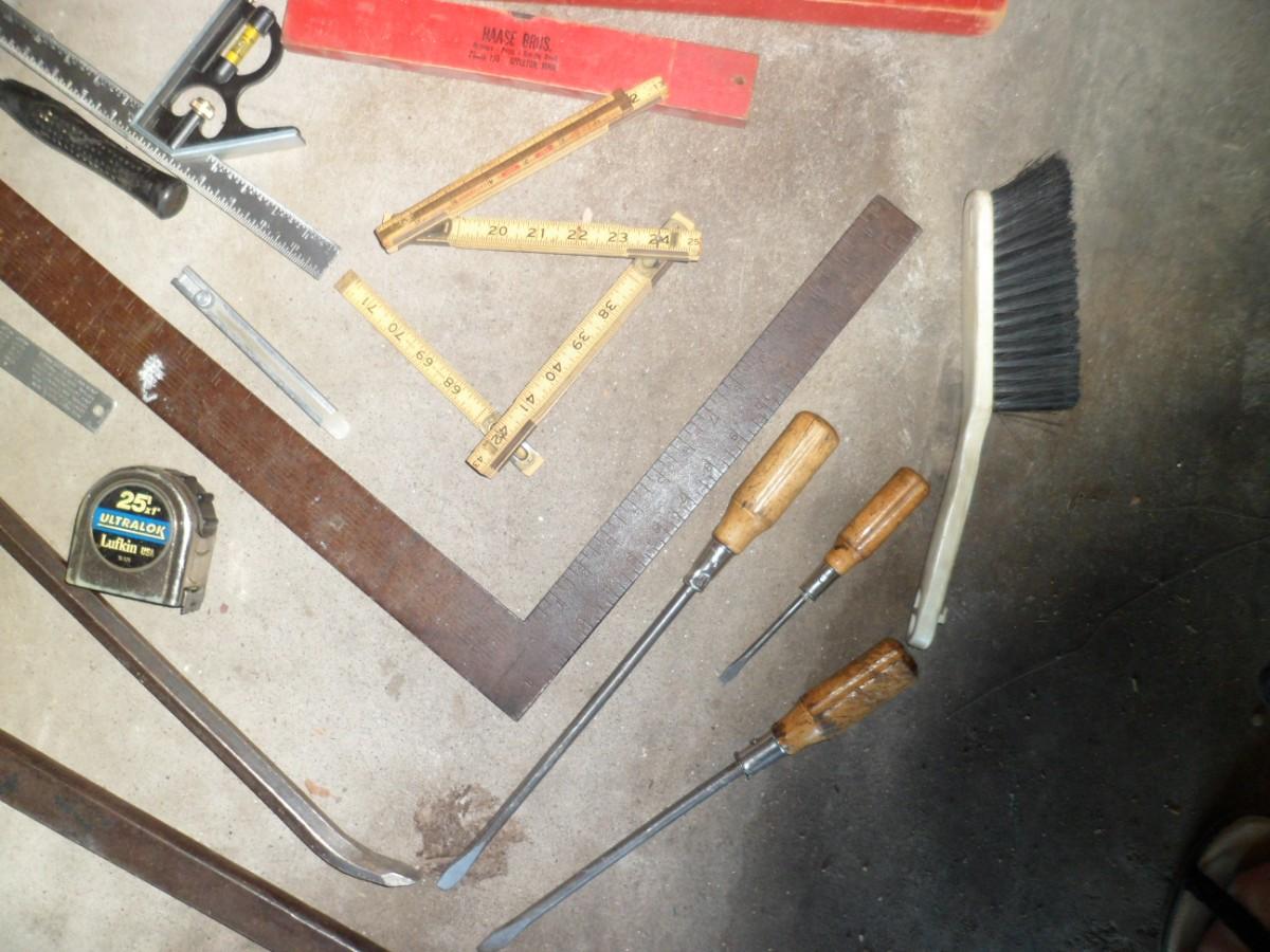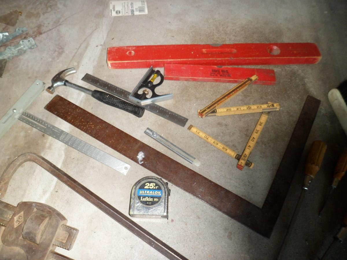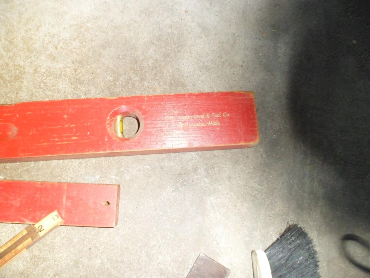 LOT 267 36" PIPE WRENCH, VINTAGE MEASURING TOOLS LEVELS, AND MORE