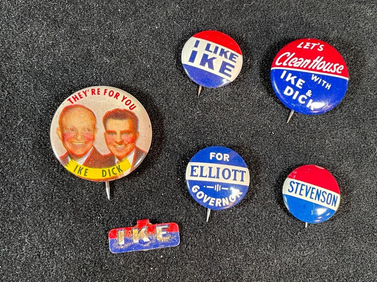 6 pins. Eisenhower, Nixon, Stevenson and Elliot